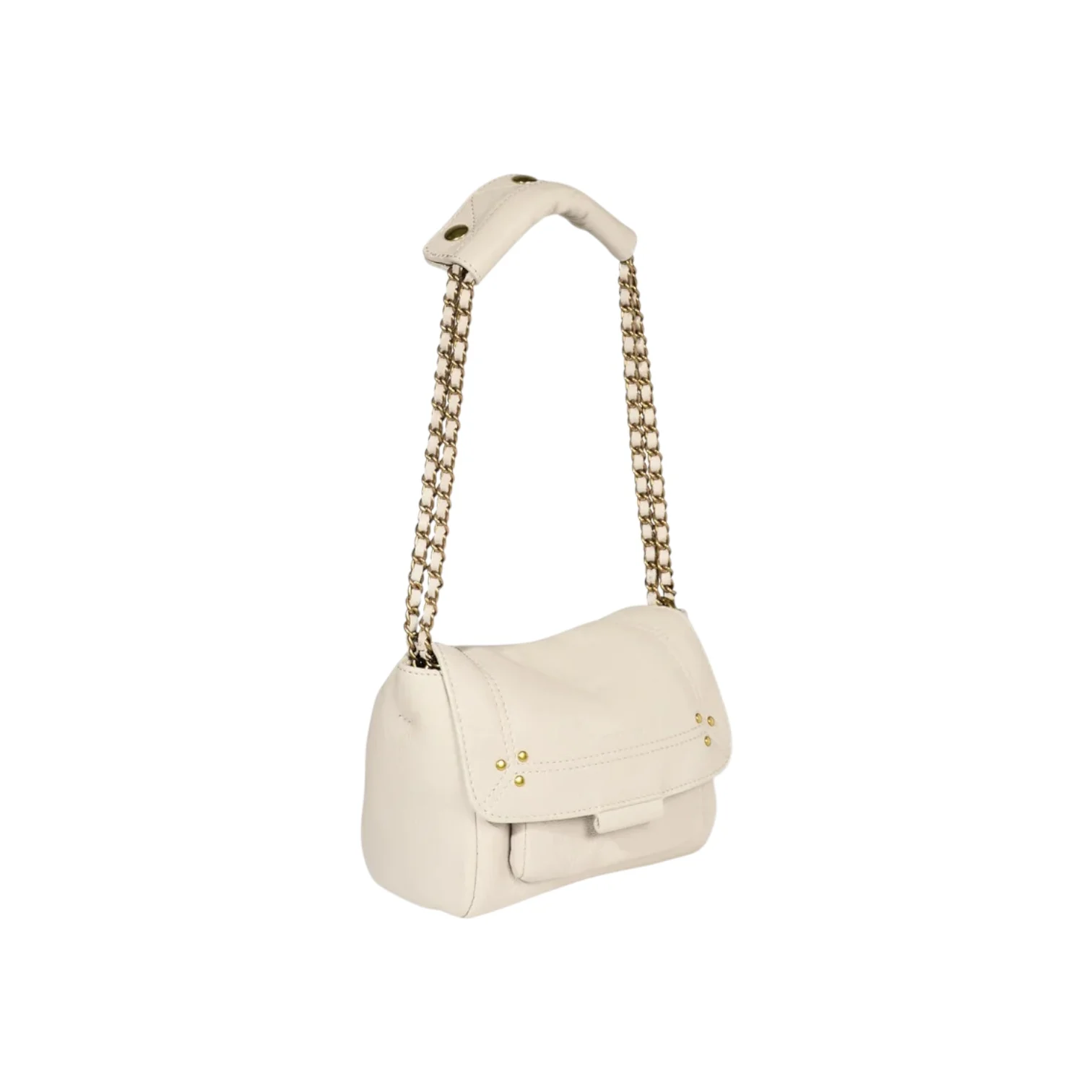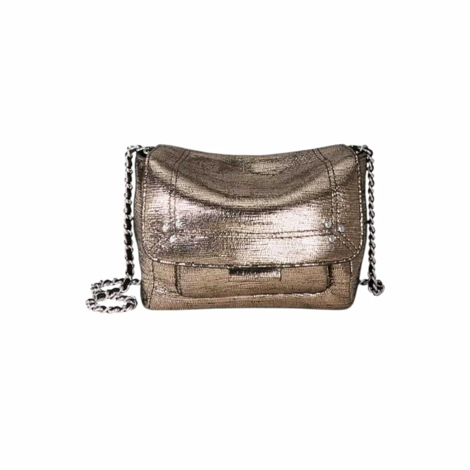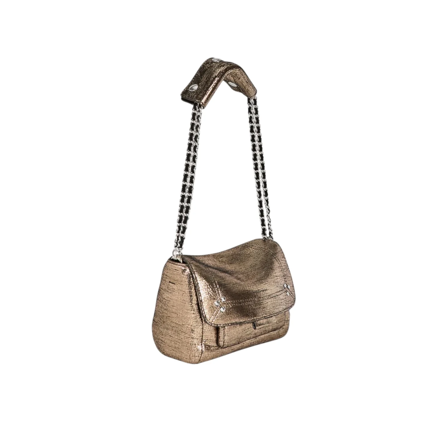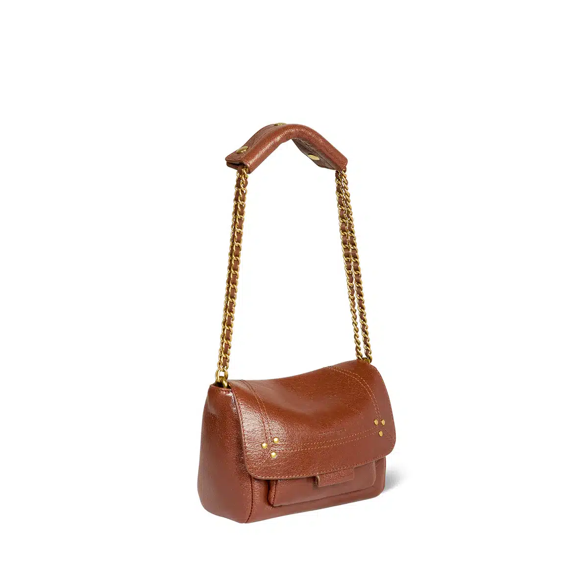 - Une bandoulière chaîne et cuir amovible et ajustable en deux longueurs; mesurant au maximum 105 cm et dimension au plus court 52,5 cm avec large patte épaule en cuir pressionnée