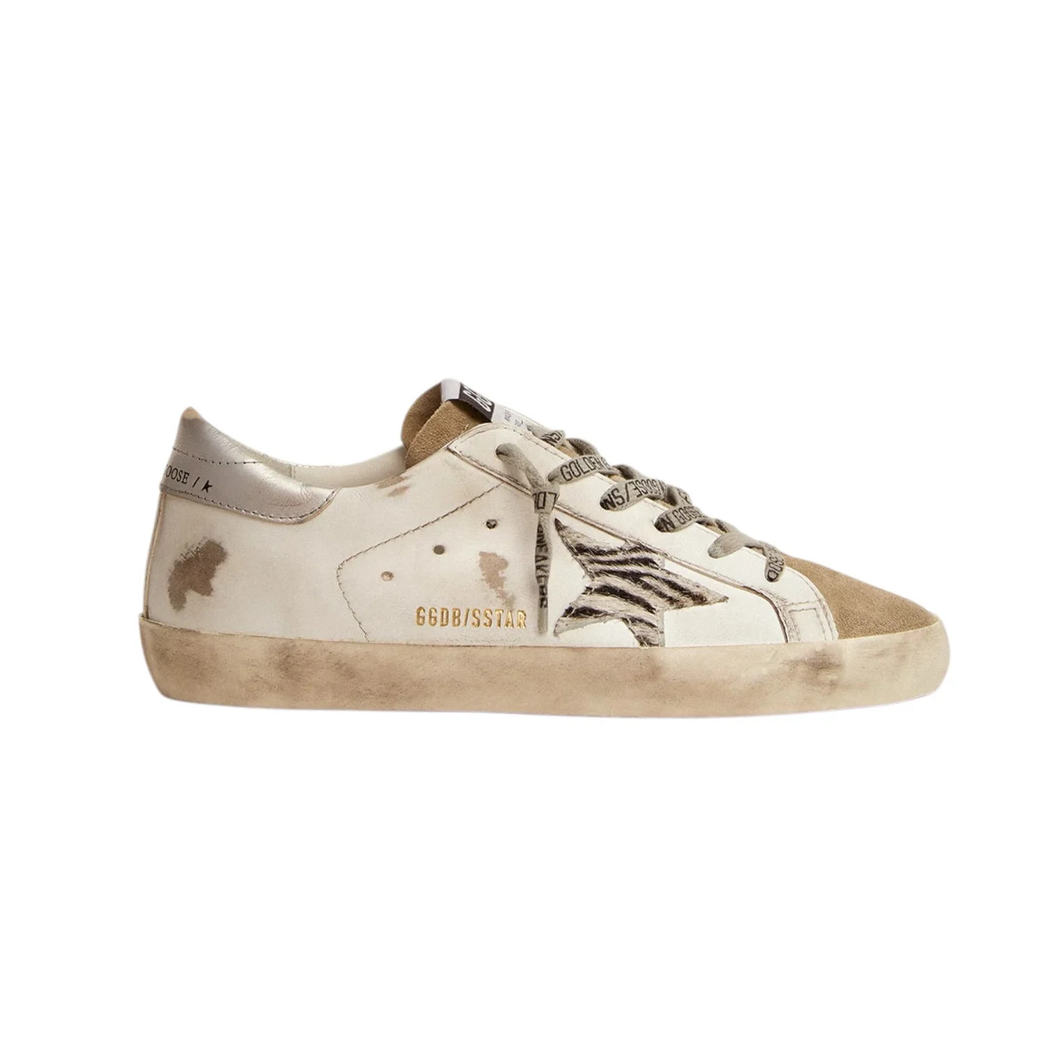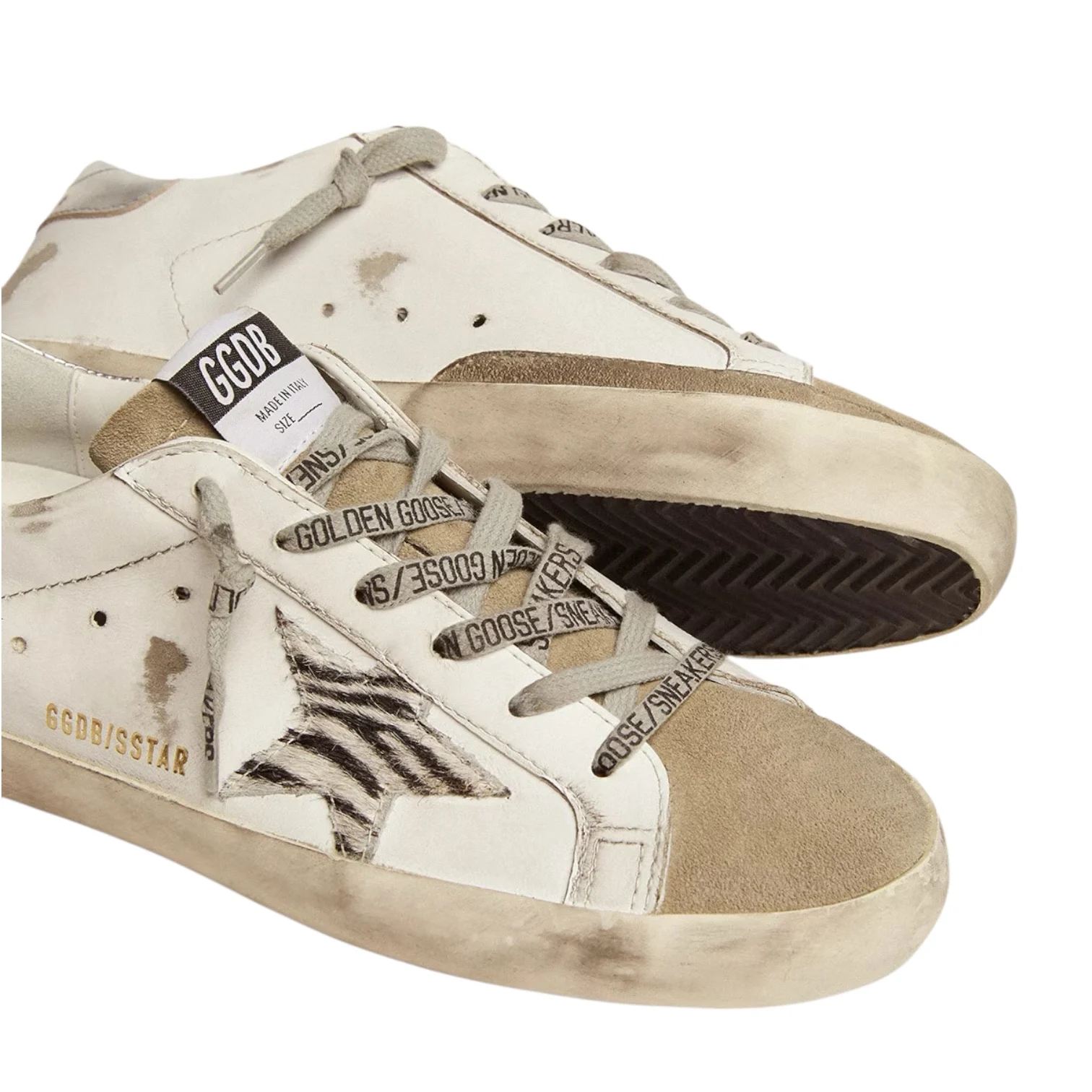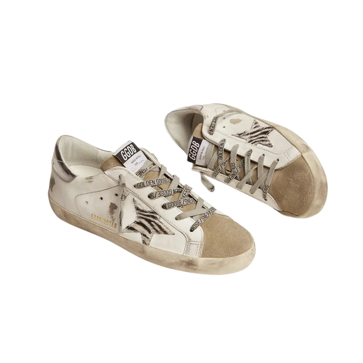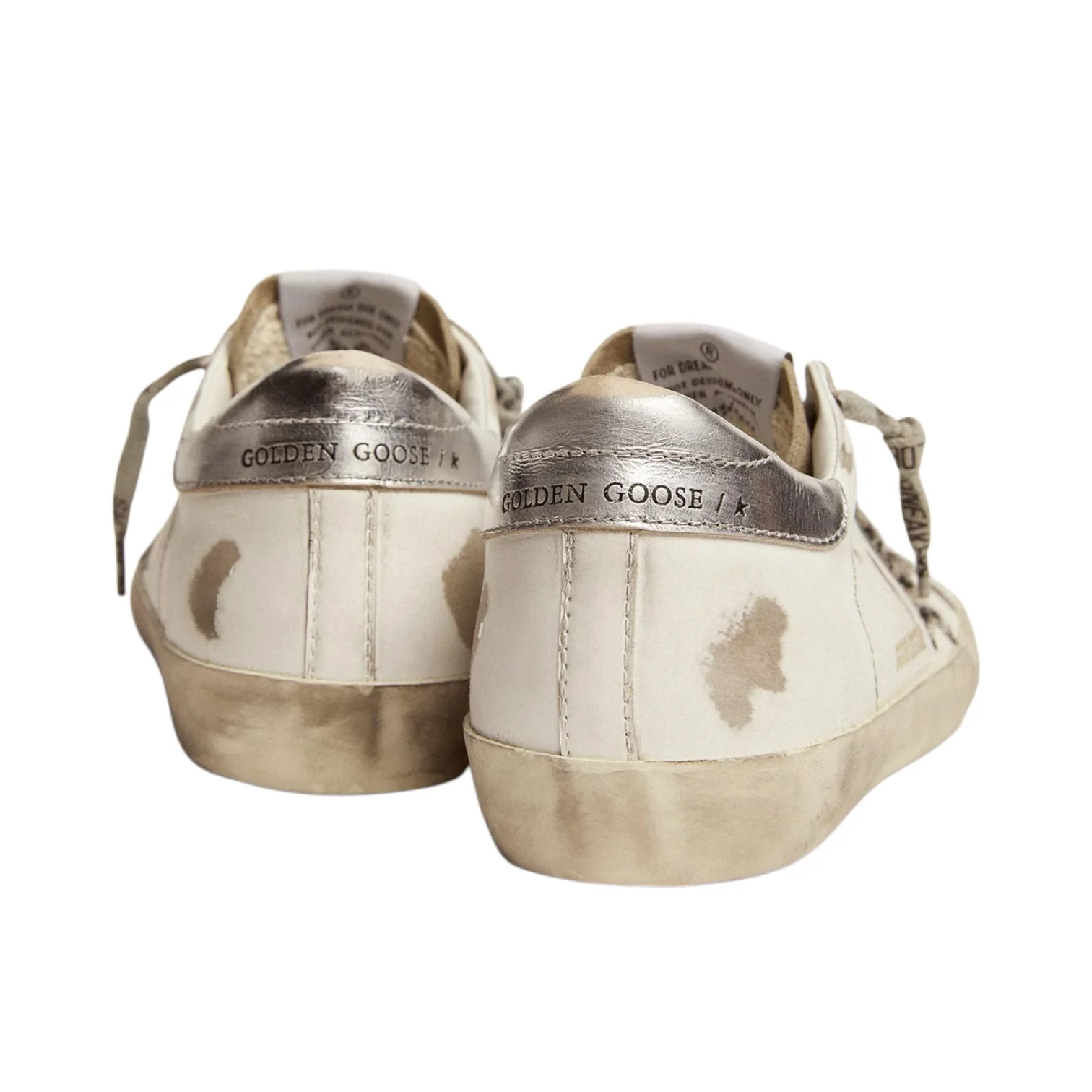 - Baskets basses en cuir lisse blanc, empiècement étoile en cuir zébré en poils, renfort talon en cuir lisse argenté et languette en cuir suédé gris