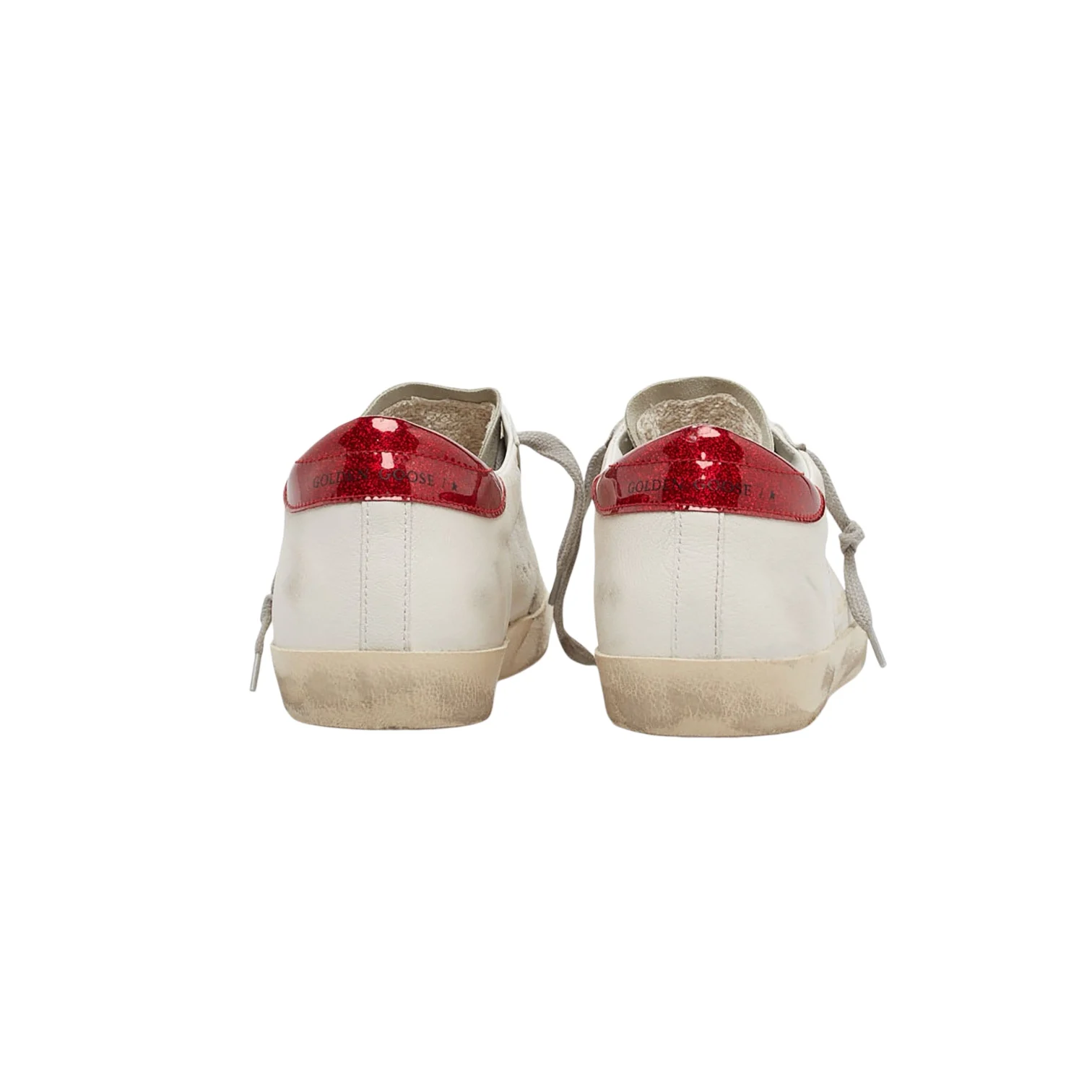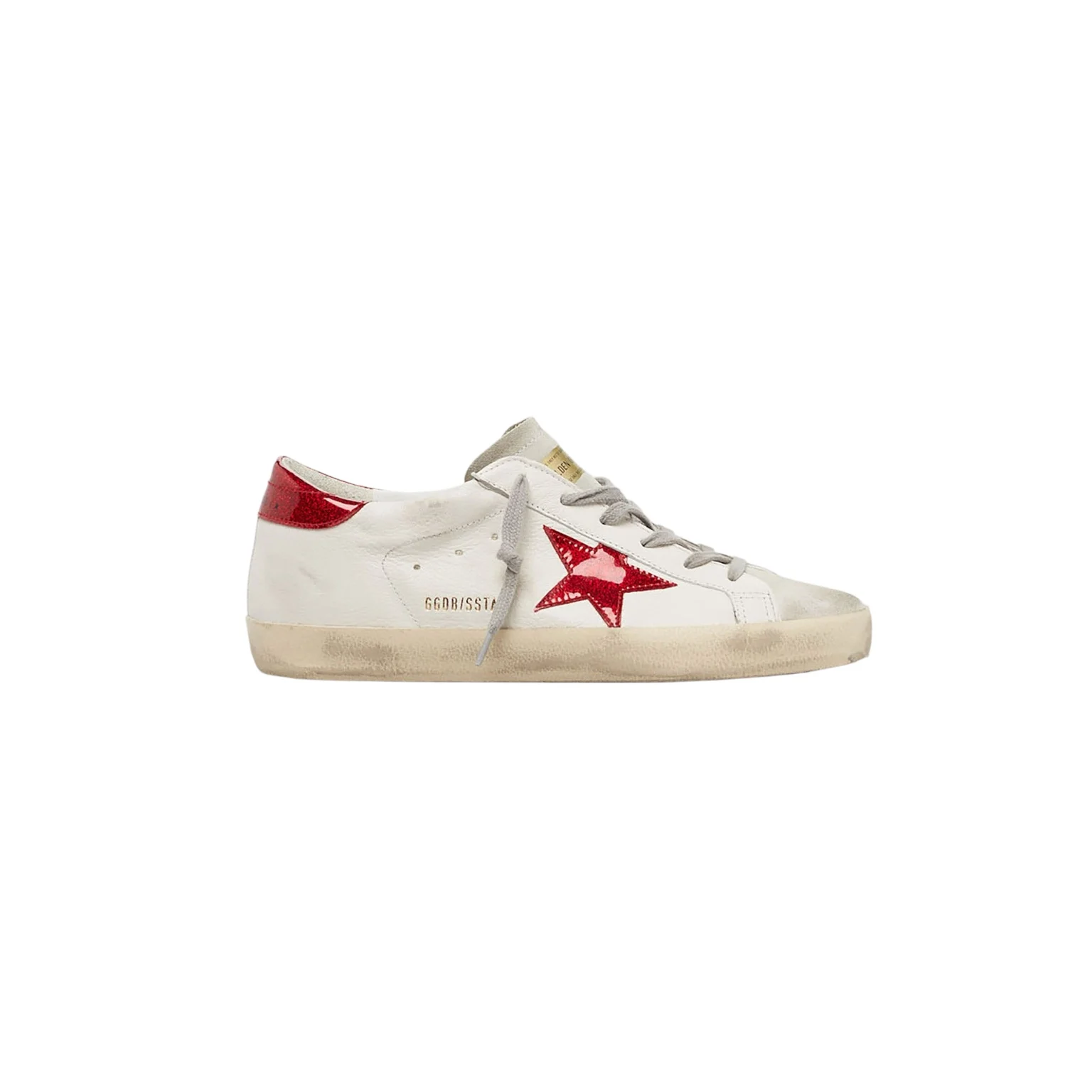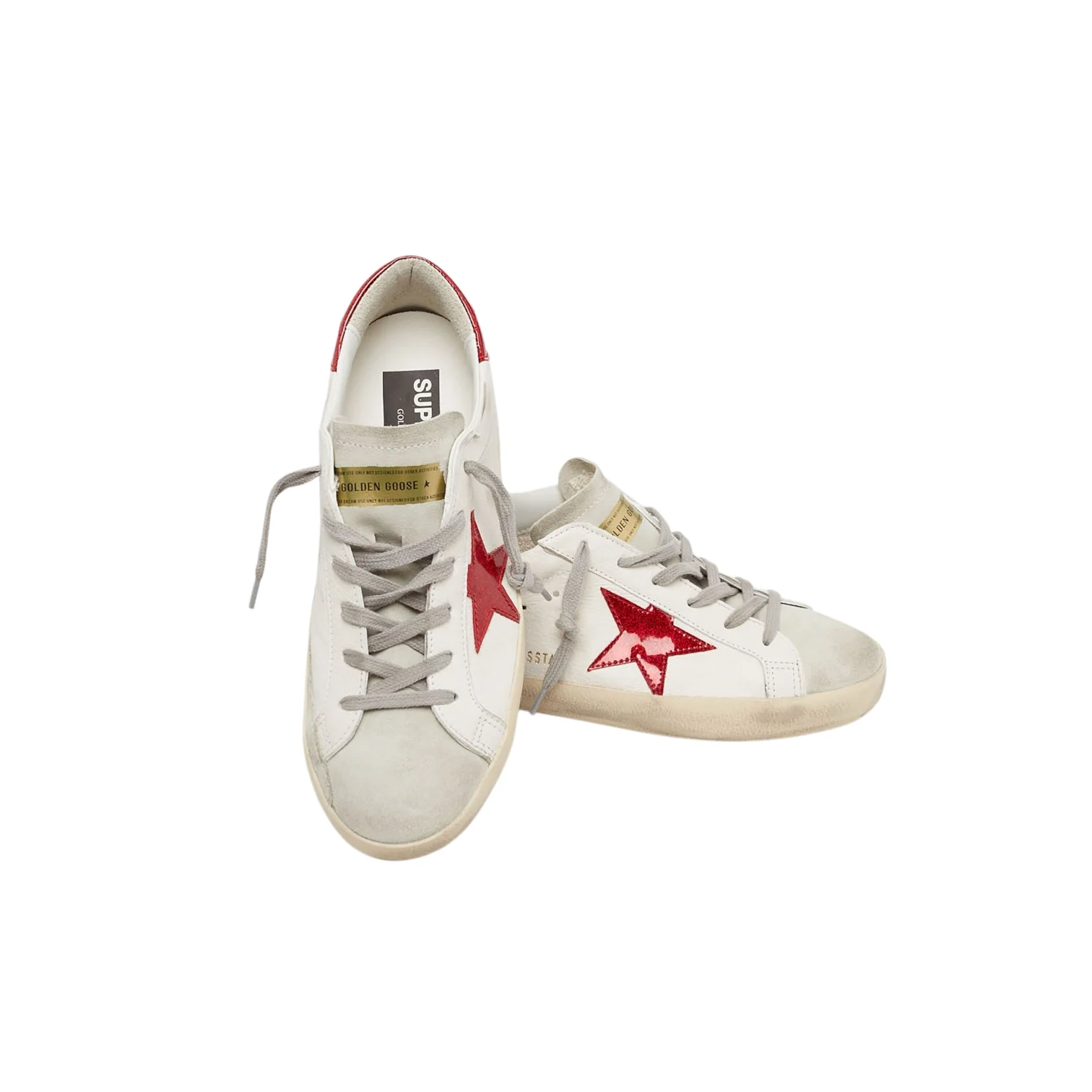 - Empiècement étoile et renfort couleur vernie rouge pailleté, lacets gris. Effets usés par endroits