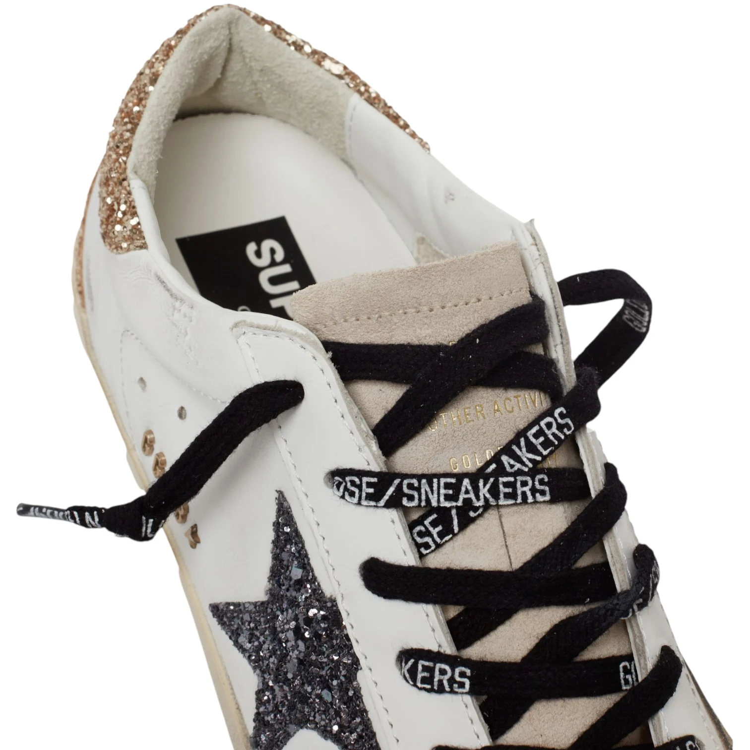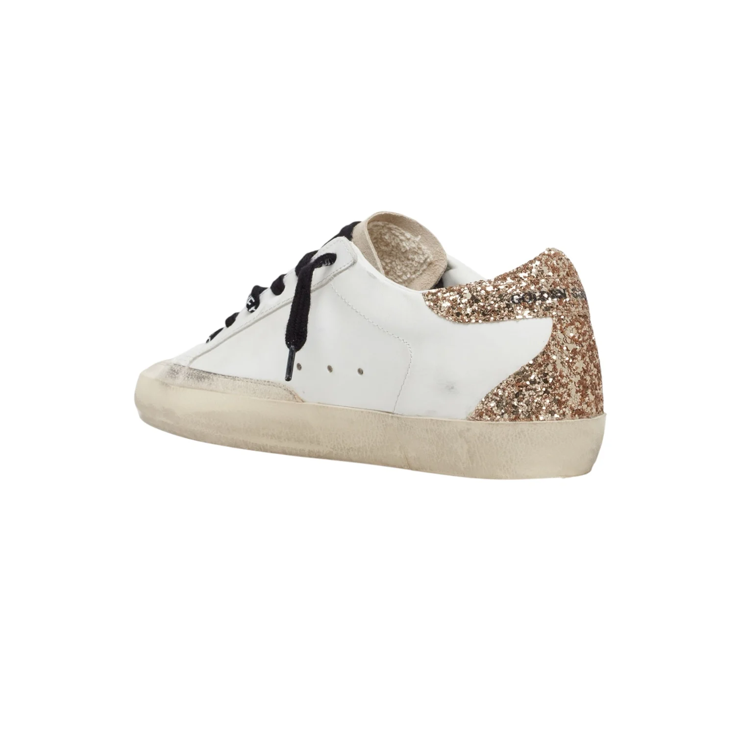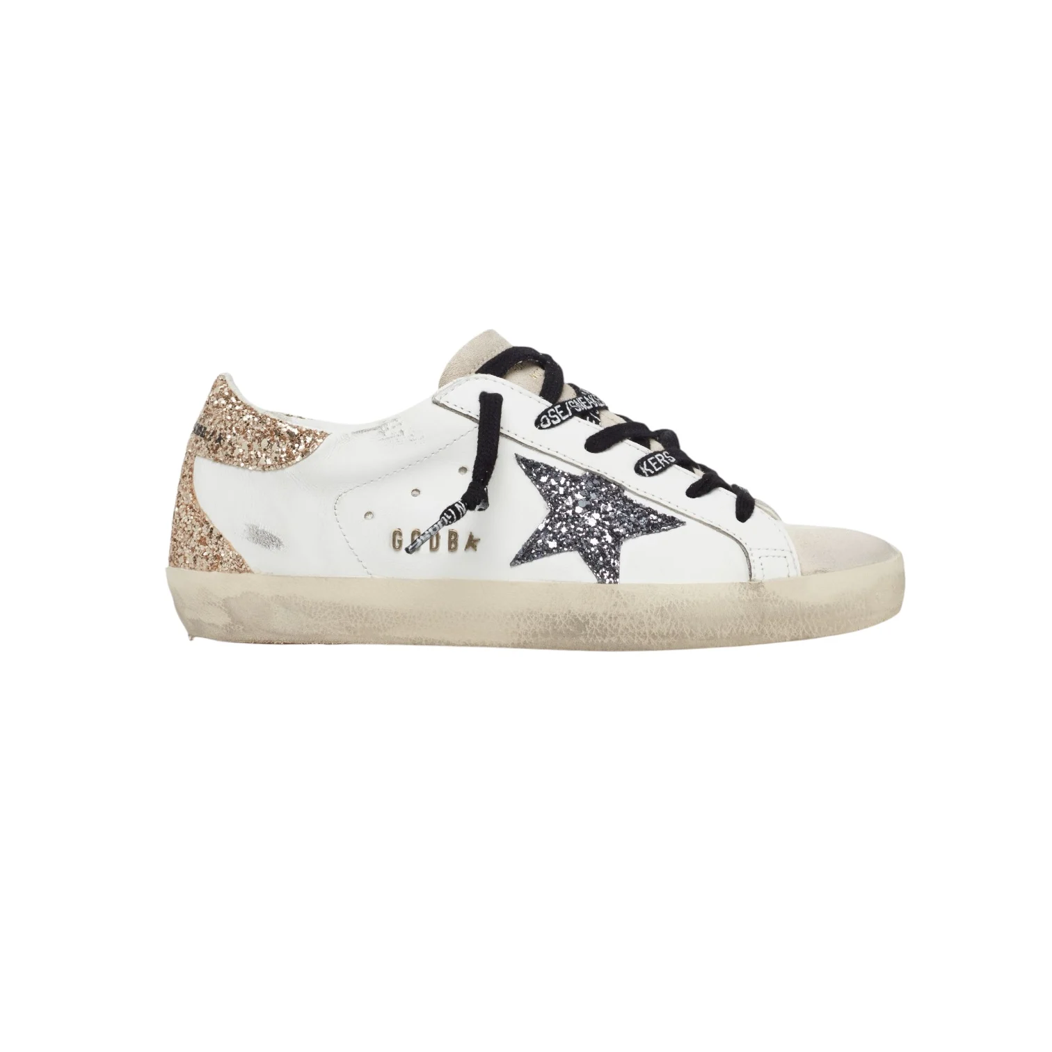 - Lacets noirs à inscriptions blanches. Intérieur en maille bouclette et cuir. Inscription « GGDB/SSTAR » sur le côté extérieur. Effets usés et tachés par endroit