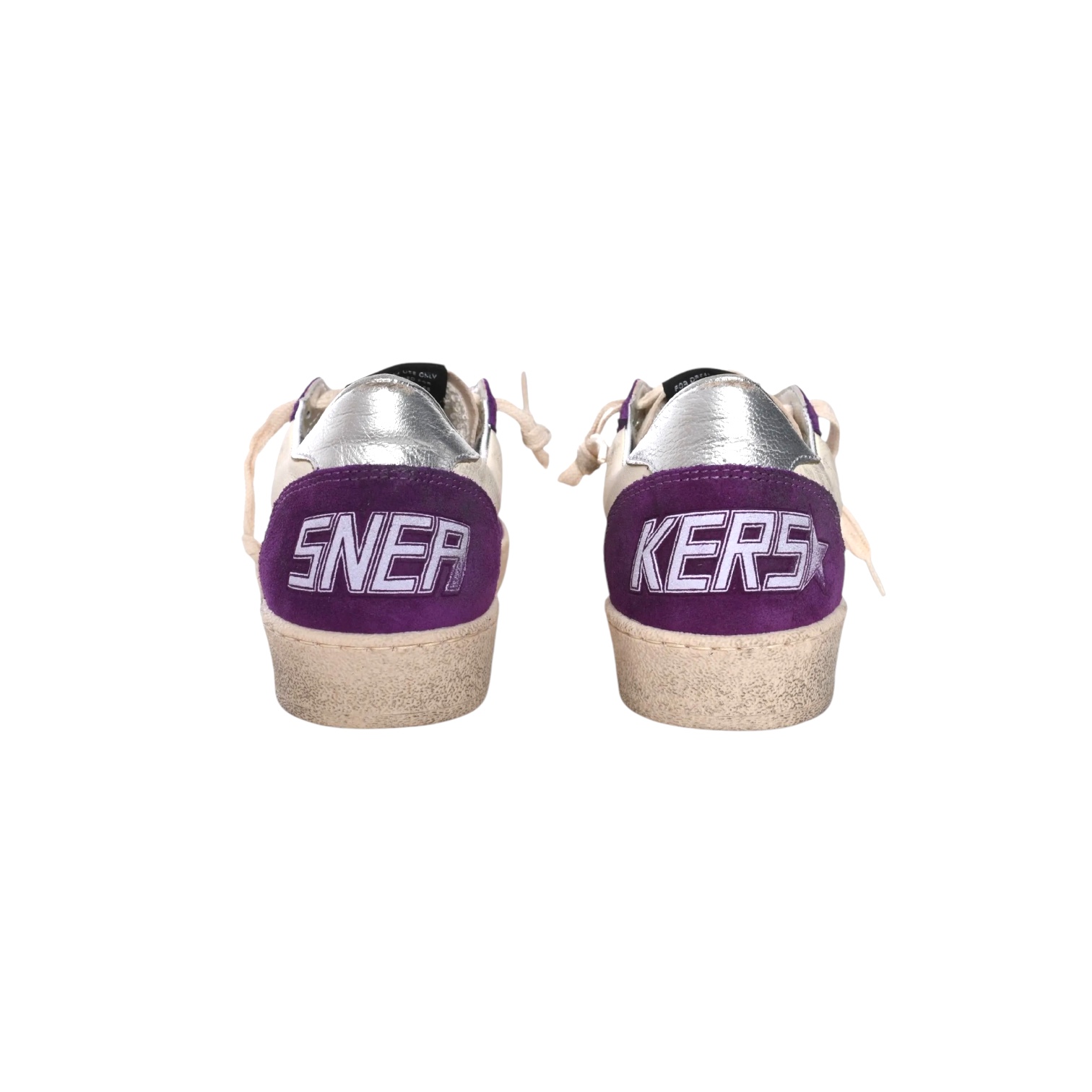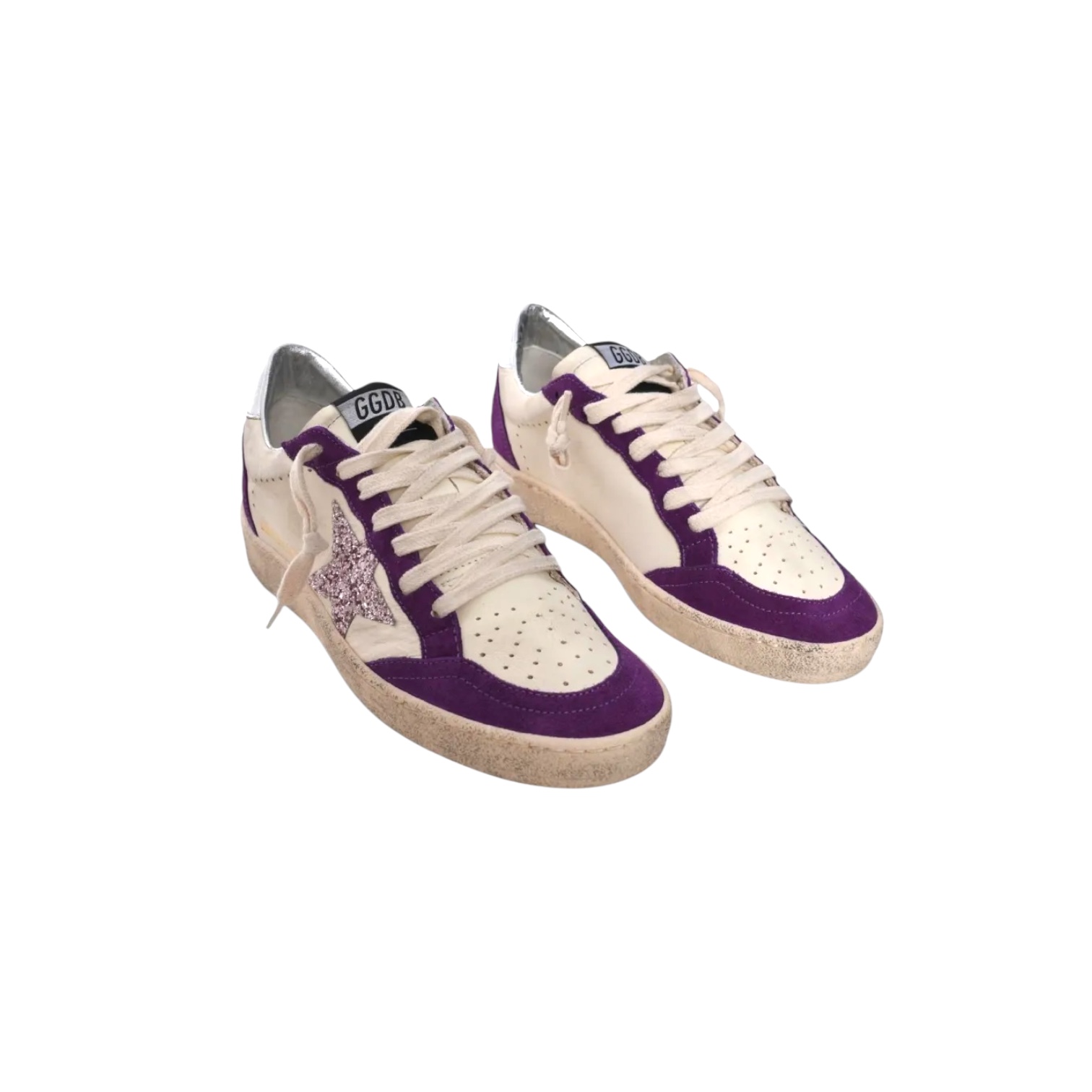 - Blanc cassé, étoile en paillettes argentées, renfort violet et argent, Inscription « SNEA » sur le talon gauche et « KERS » sur le talon droit et « GGDB / BALLSTAR » sur le côté extérieur du pied droit, perforées sur le dessus