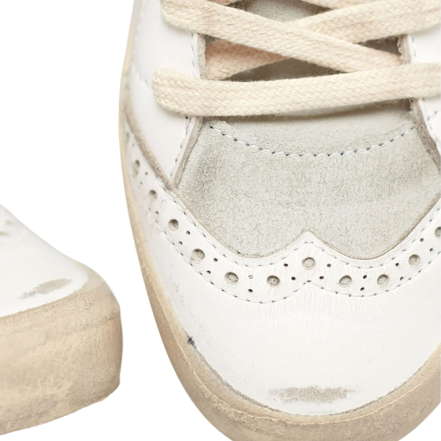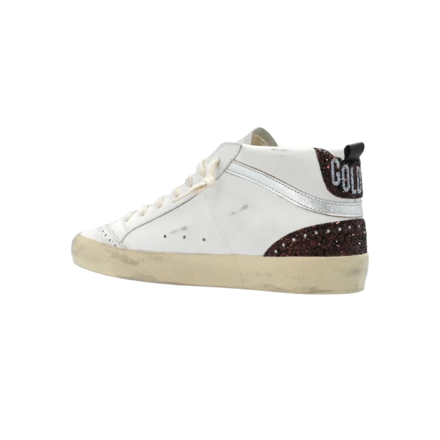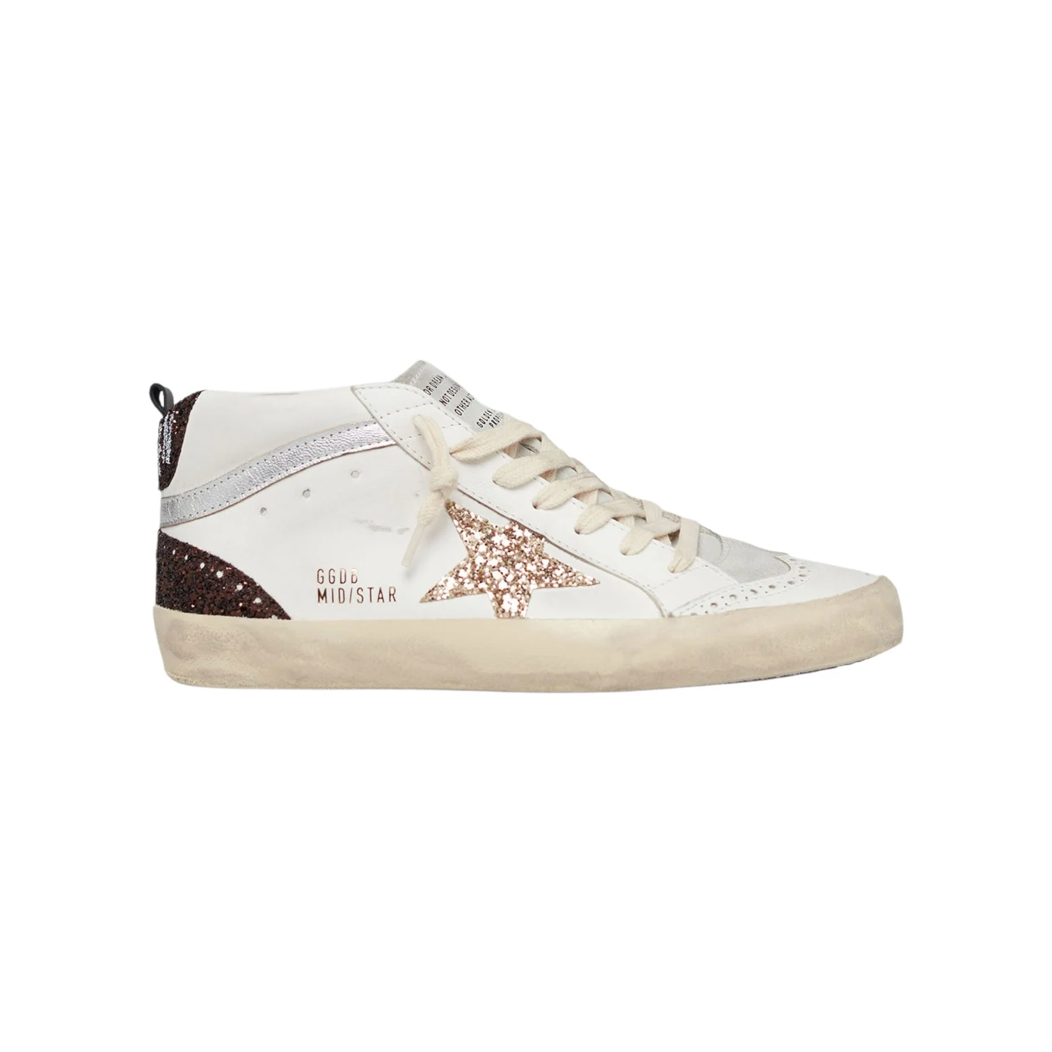 - Baskets montantes pailletées. Empiècement étoile doré pailleté. Renfort marron pailleté avec inscription « GOLDEN ». Lacets écrus. Inscription « GGDB MIS/STAR » sur le côté extérieur. Intérieur en cuir et maille bouclette. Effets usés et tâchés par endroits