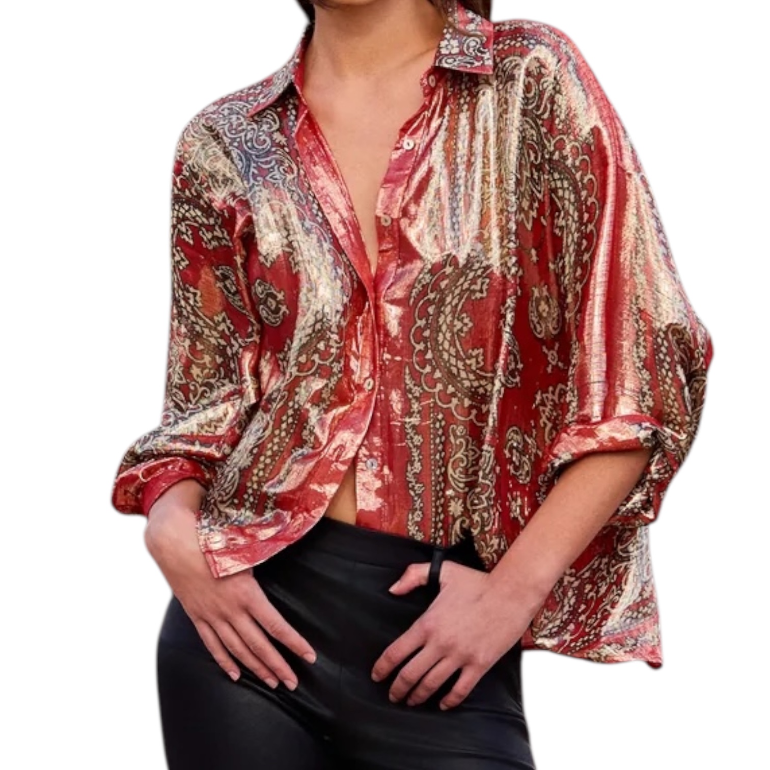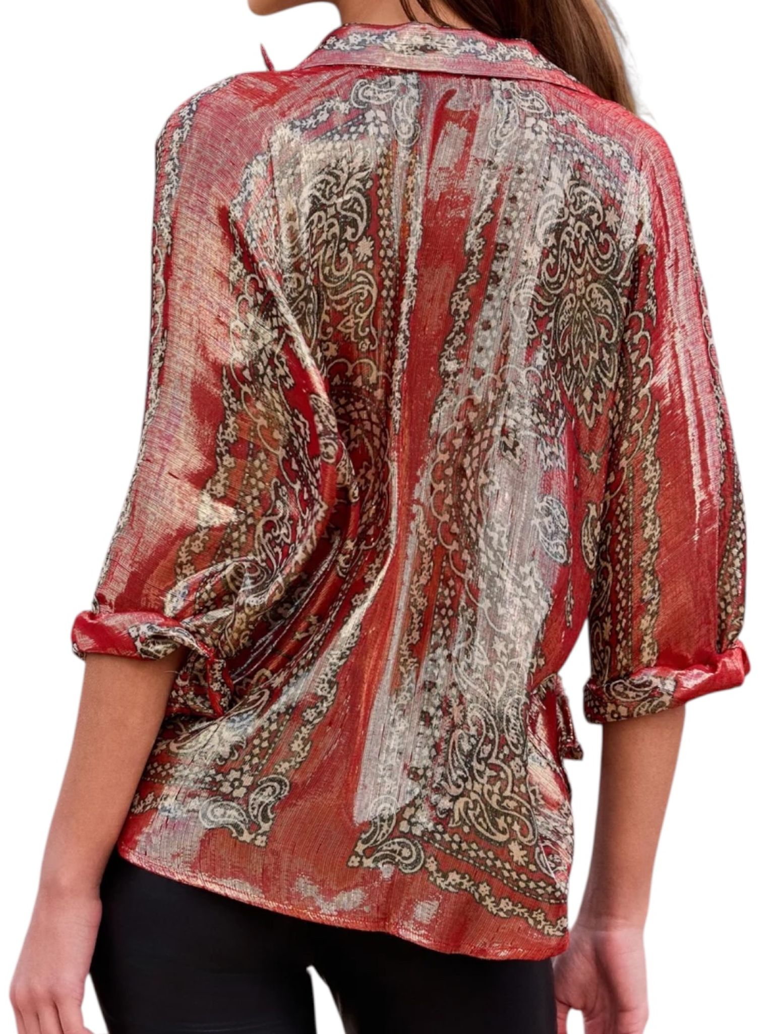 - Chemise fluide en soie lurex brillante, imprimé placé esprit bandana, coupe droite, emmanchures larges et souples, col chemise classique et patte de boutonnage fine