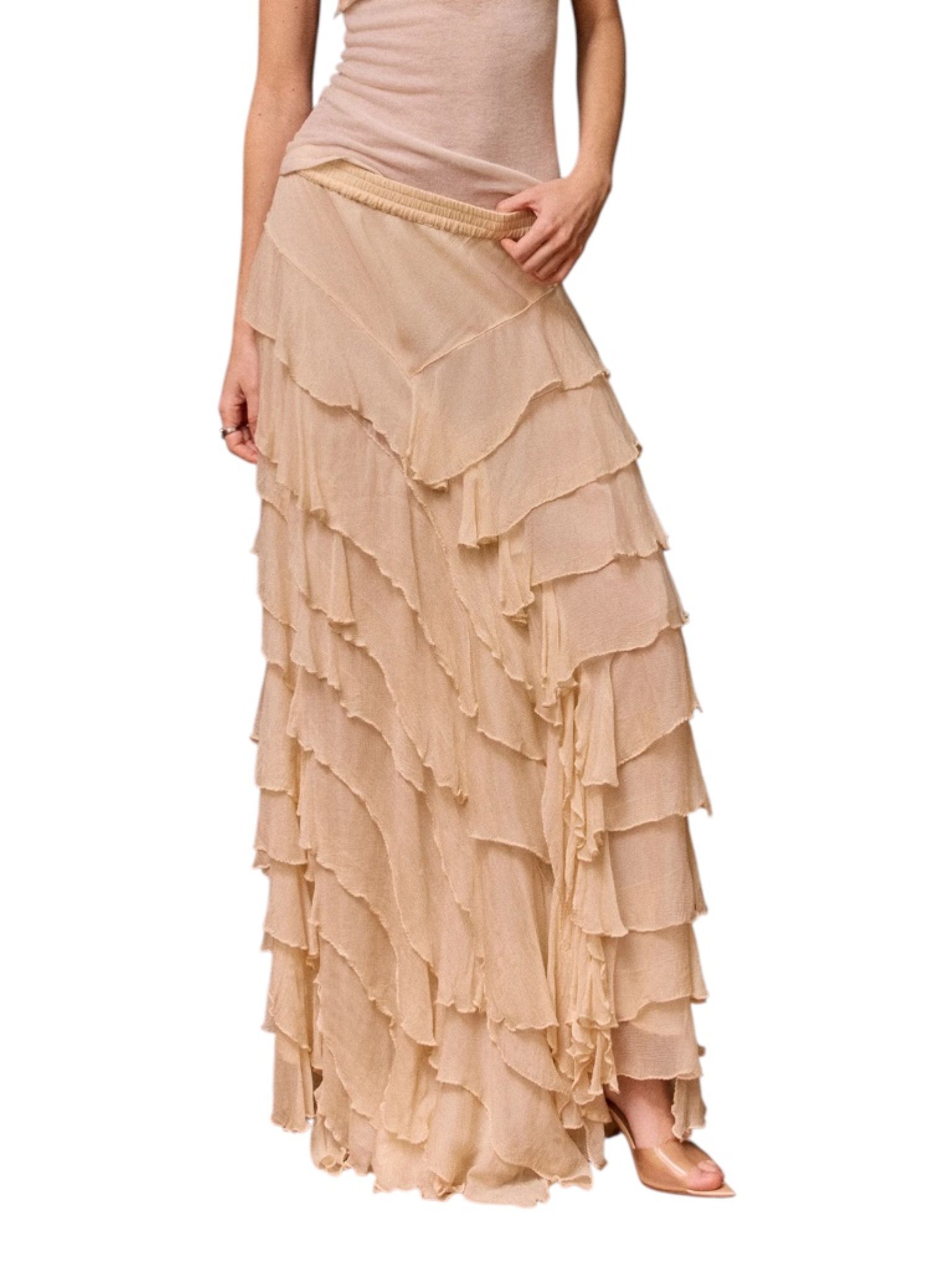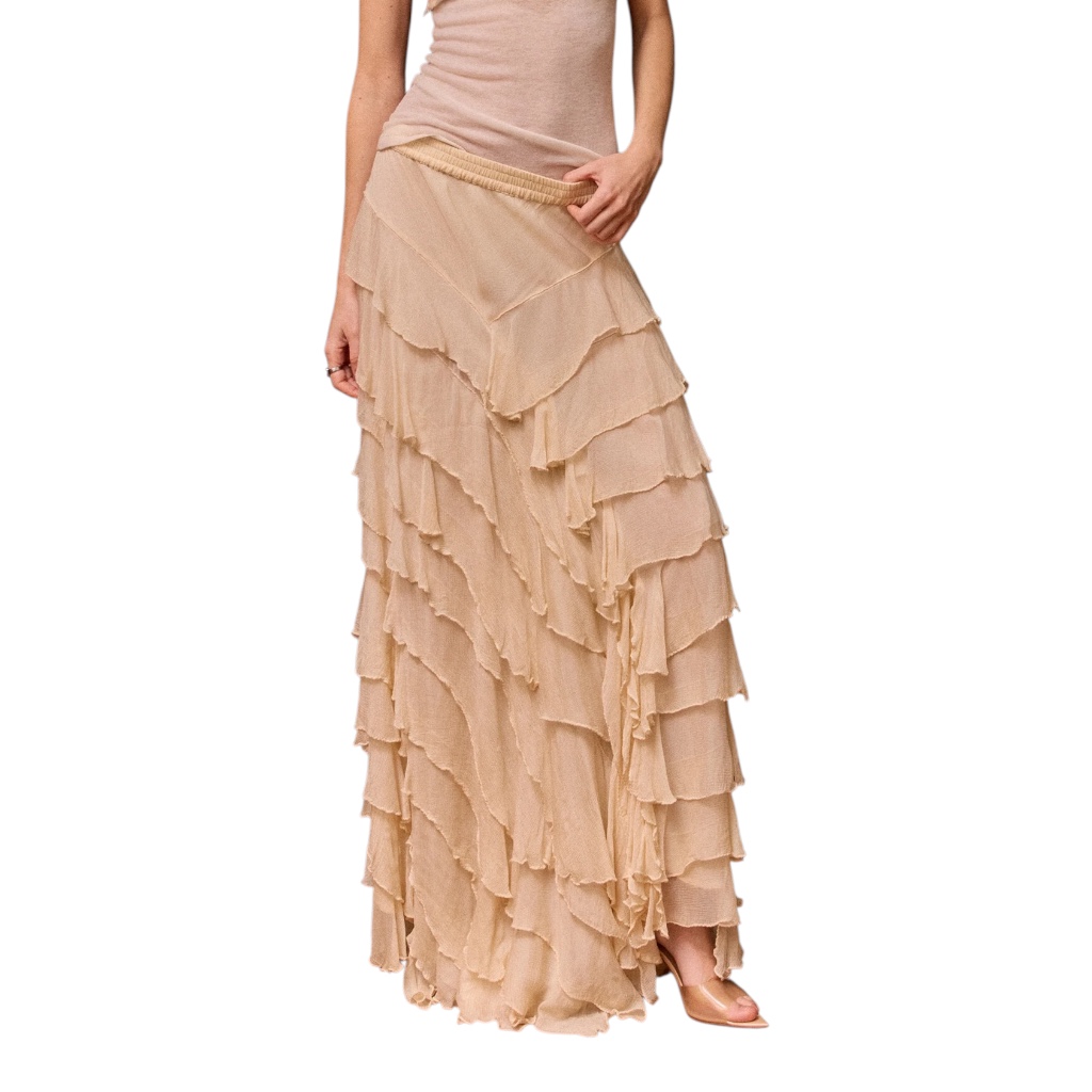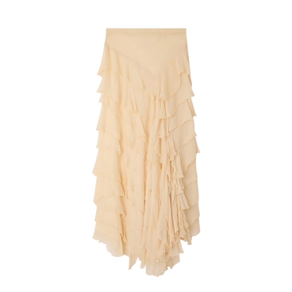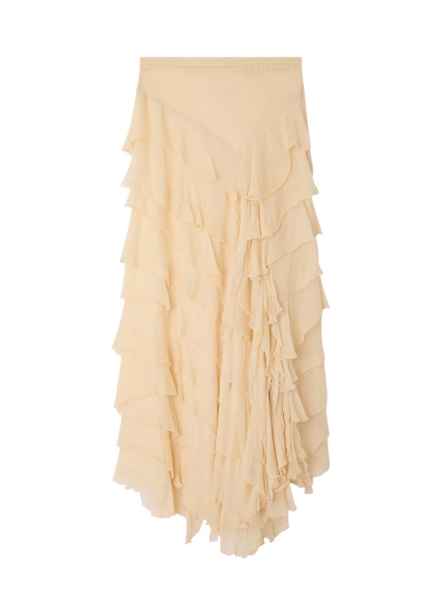- Jupe en viscose chiffon écru, volants asymétriques en pointe sur le devant ou sur le côté au choix de chacun, taille élastique, doublure en silky modal