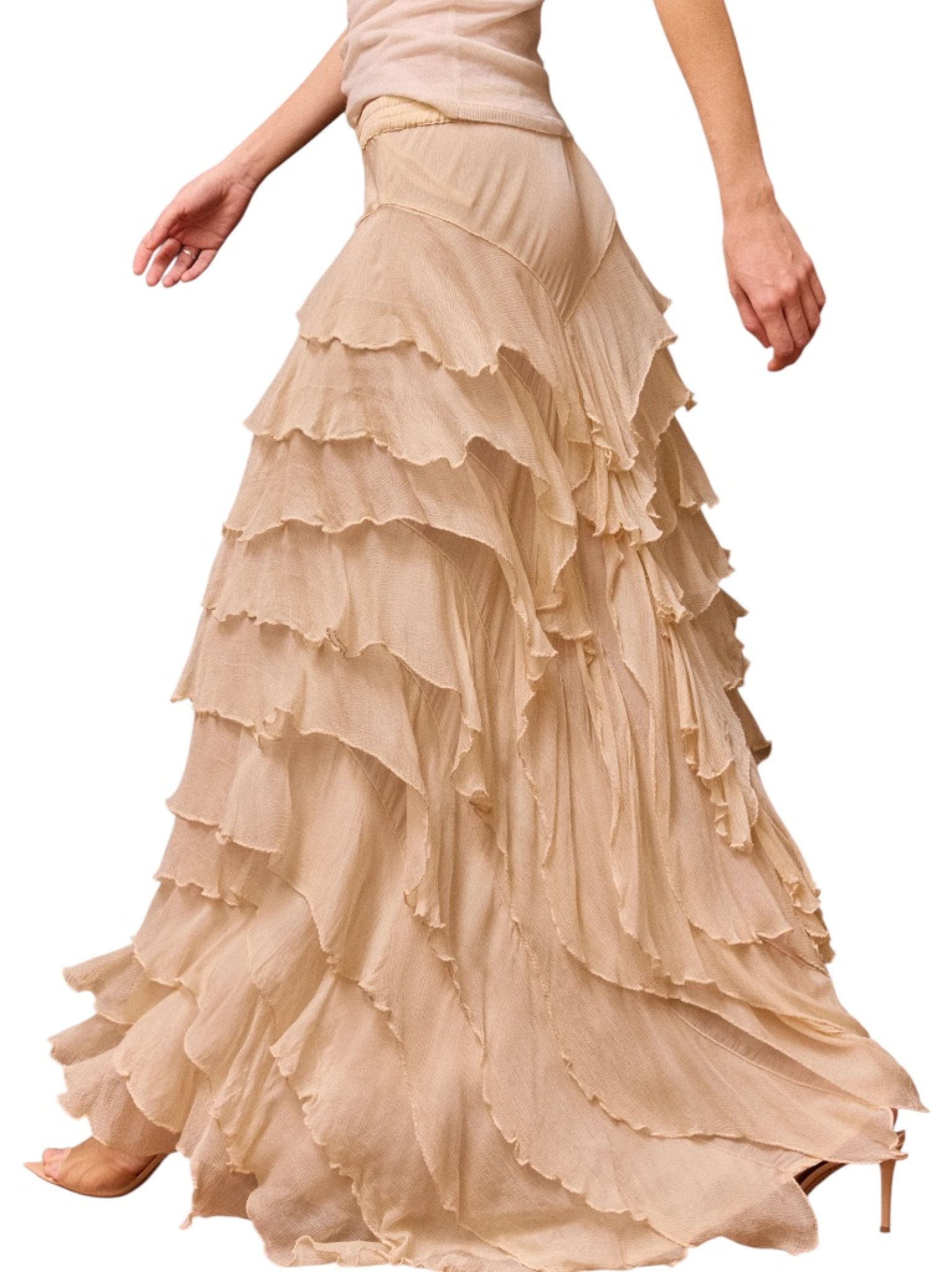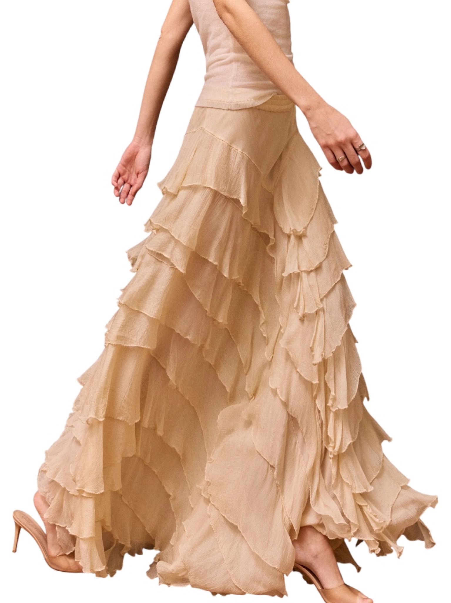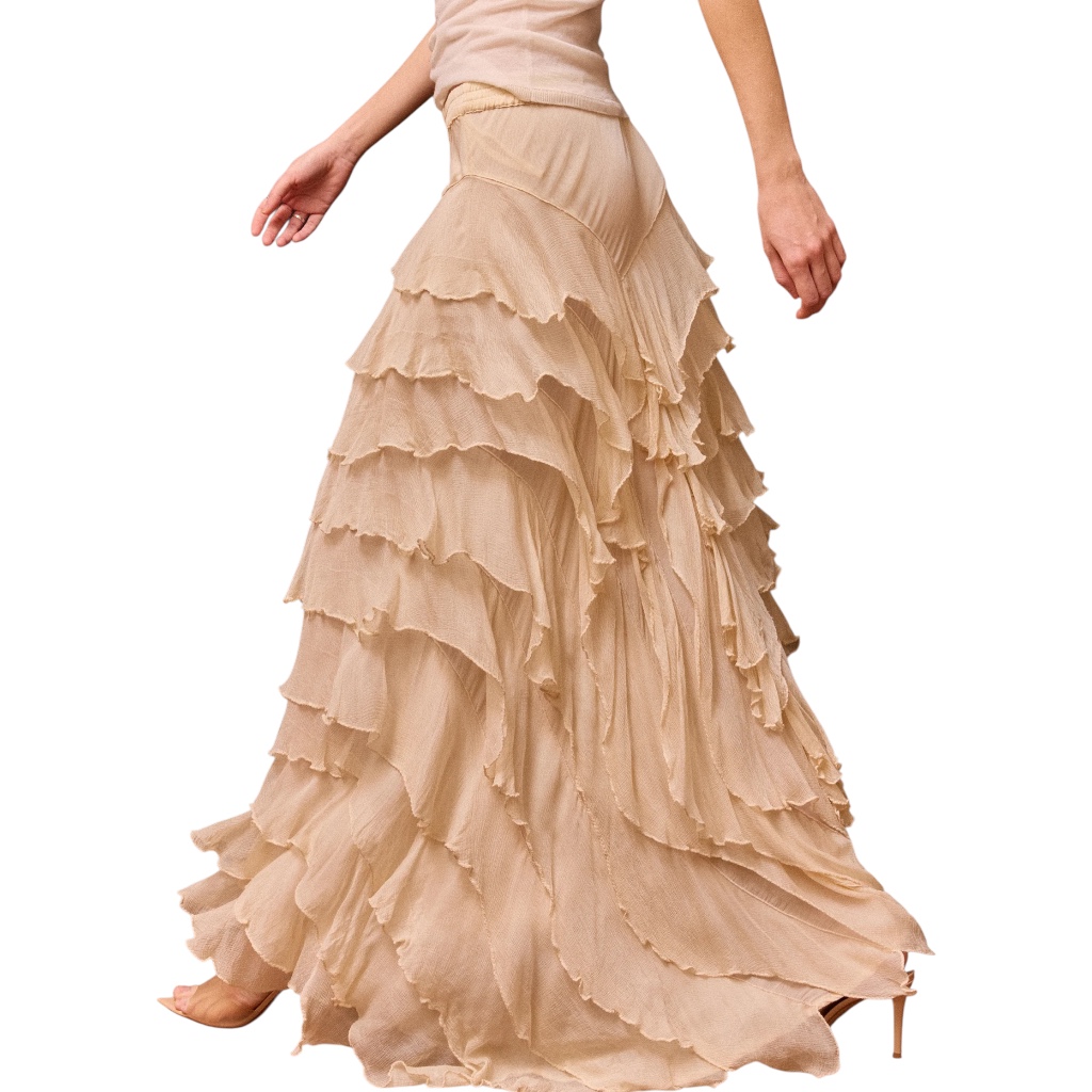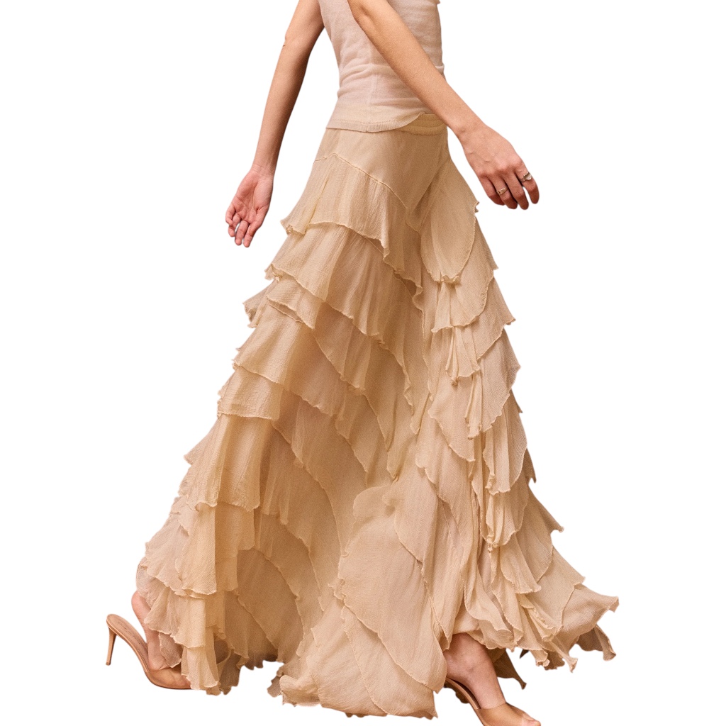 - Jupe en viscose chiffon écru, volants asymétriques en pointe sur le devant ou sur le côté au choix de chacun, taille élastique, doublure en silky modal