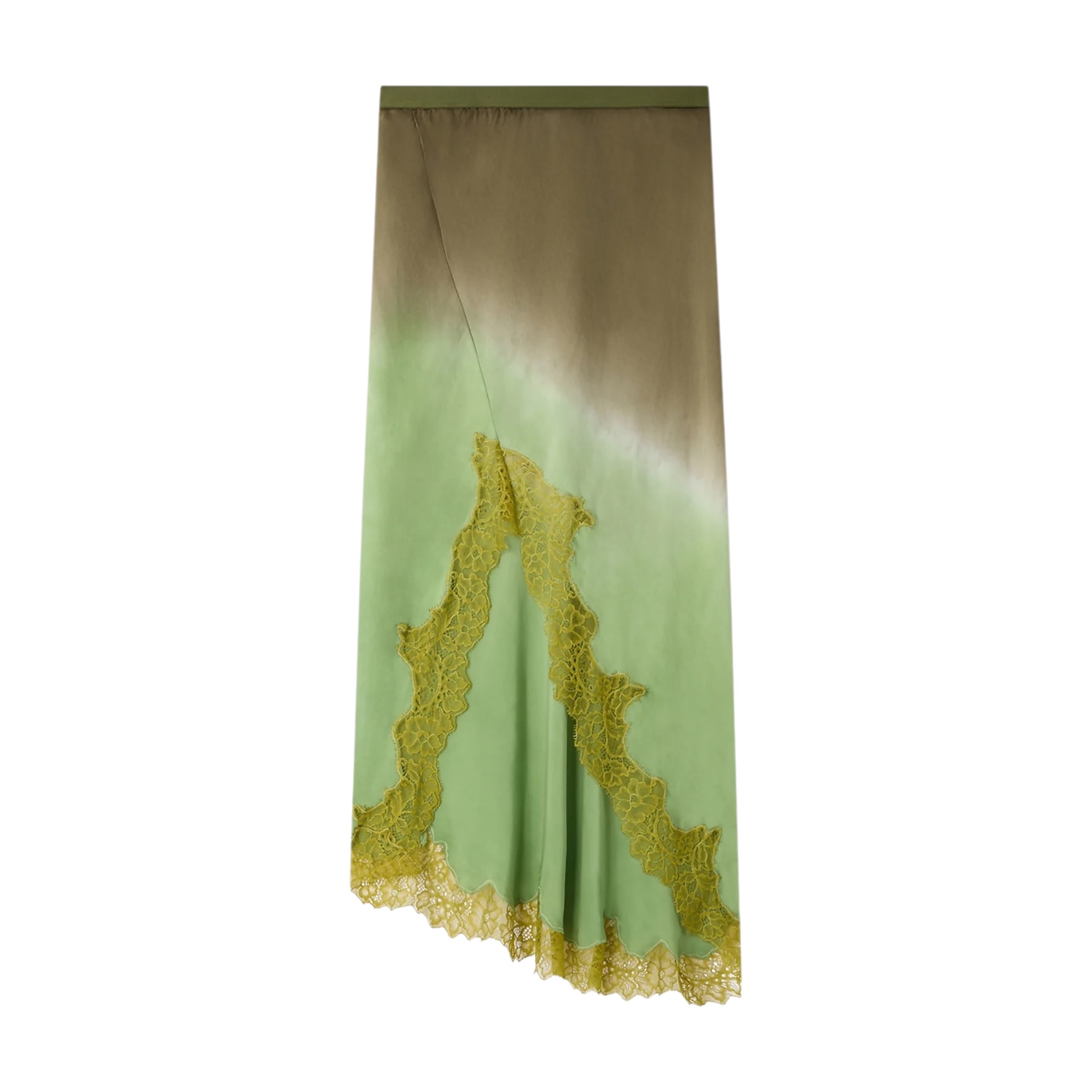 - Jupe mi-longue fluide en soie satin sand-washée, effet tie & dye dégradé dans des tons de vert et kaki, incrustations de dentelle ajourée sur fentes sur le devant, taille élastiquée.