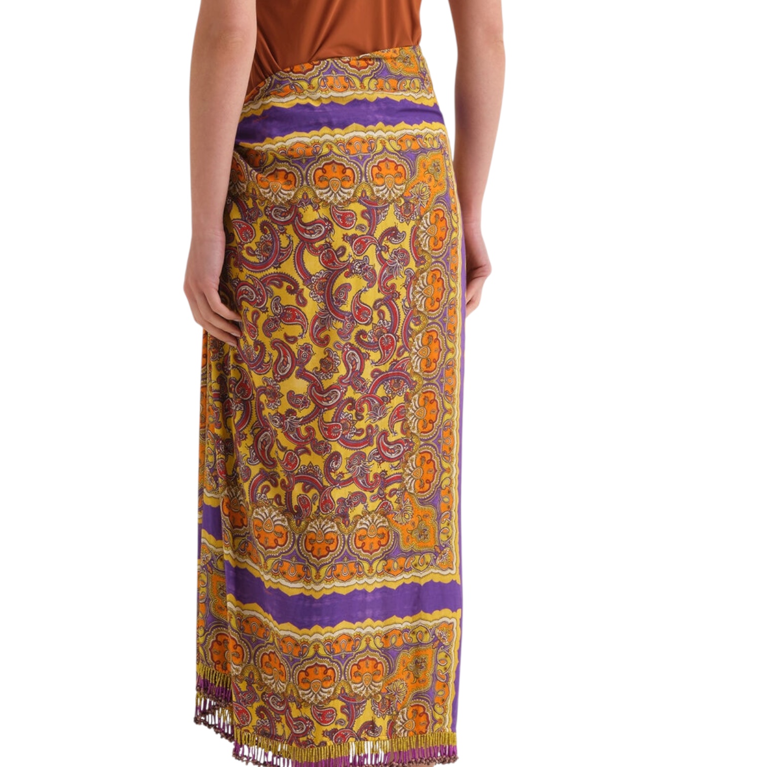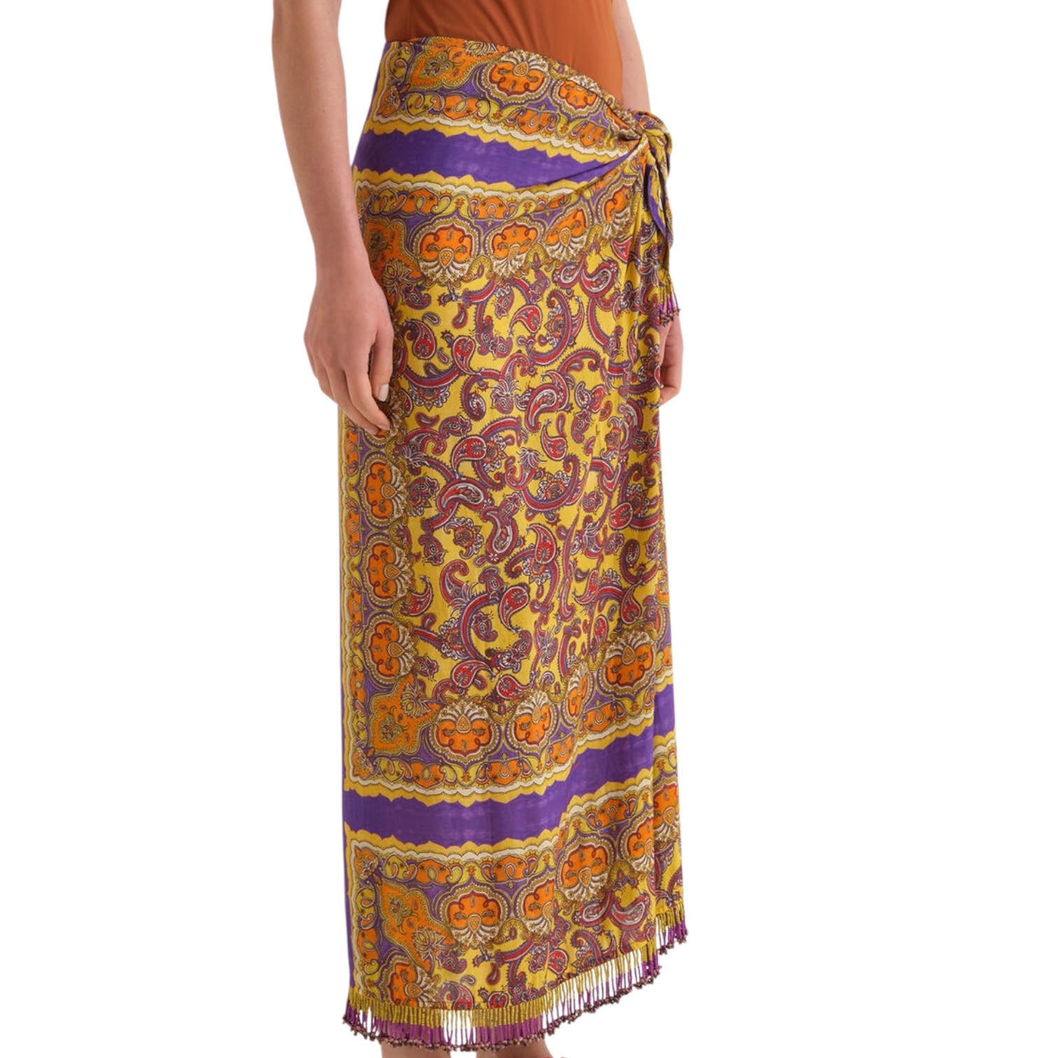 - Jupe légère et polyvalente qui évoque l’élégance informelle du paréo. Réalisée en toile de viscose fluide, ornée au bas de franges de perles faites à la main, symbole de la tradition artisanale Maliparmi. La fermeture par nœud permet d’ajuster la coupe avec aisance. L’imprimé patchwork placé, composé de foulards à l’esthétique ethnique et bohème, est enrichi de broderies balinaises réalisées avec expertise, rendant chaque pièce unique et authentique