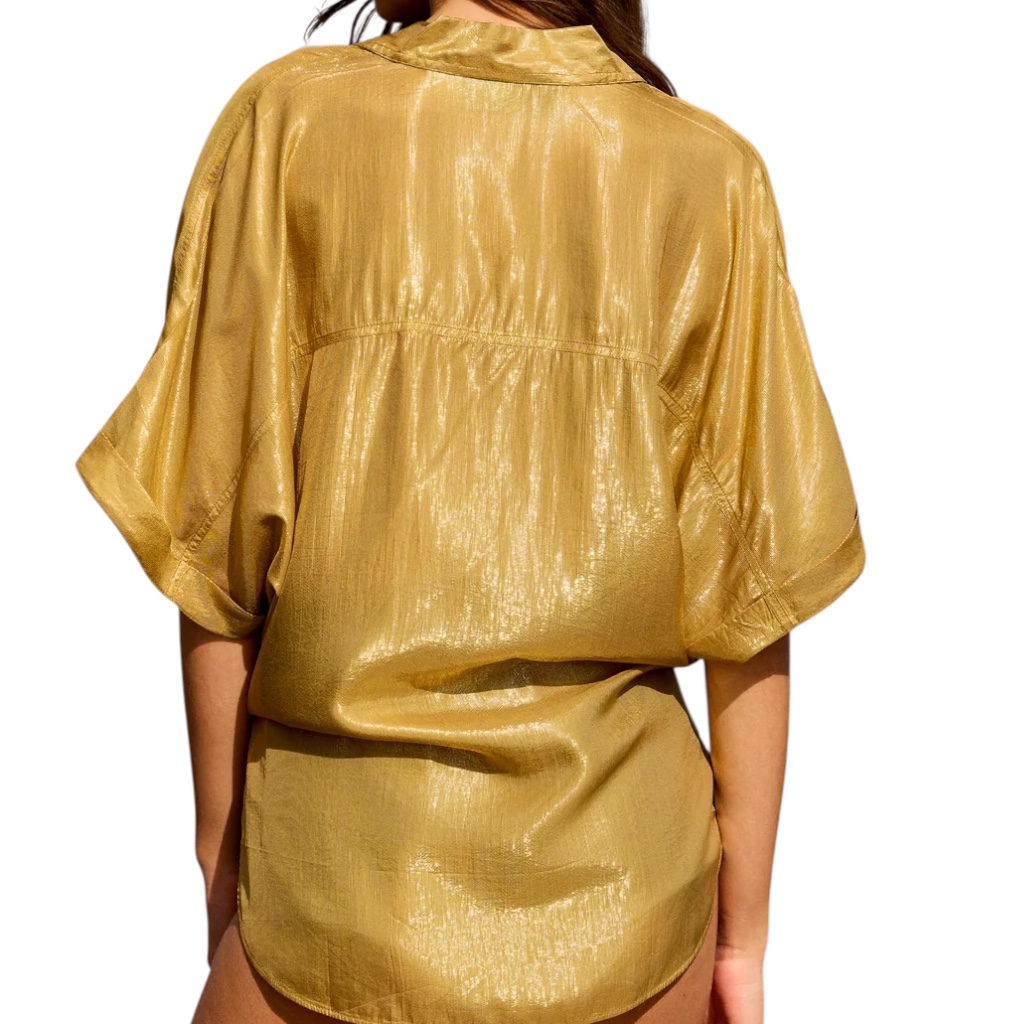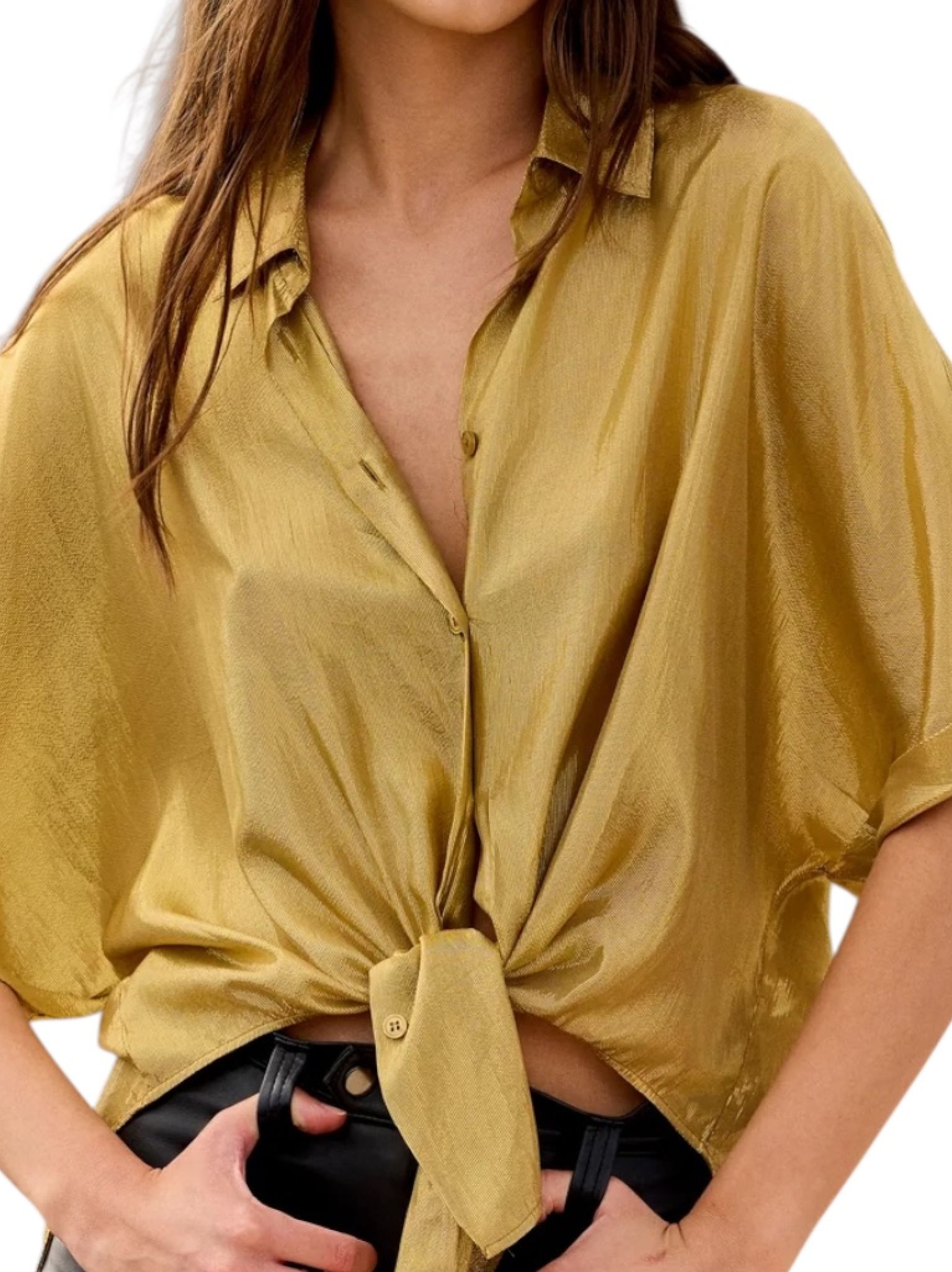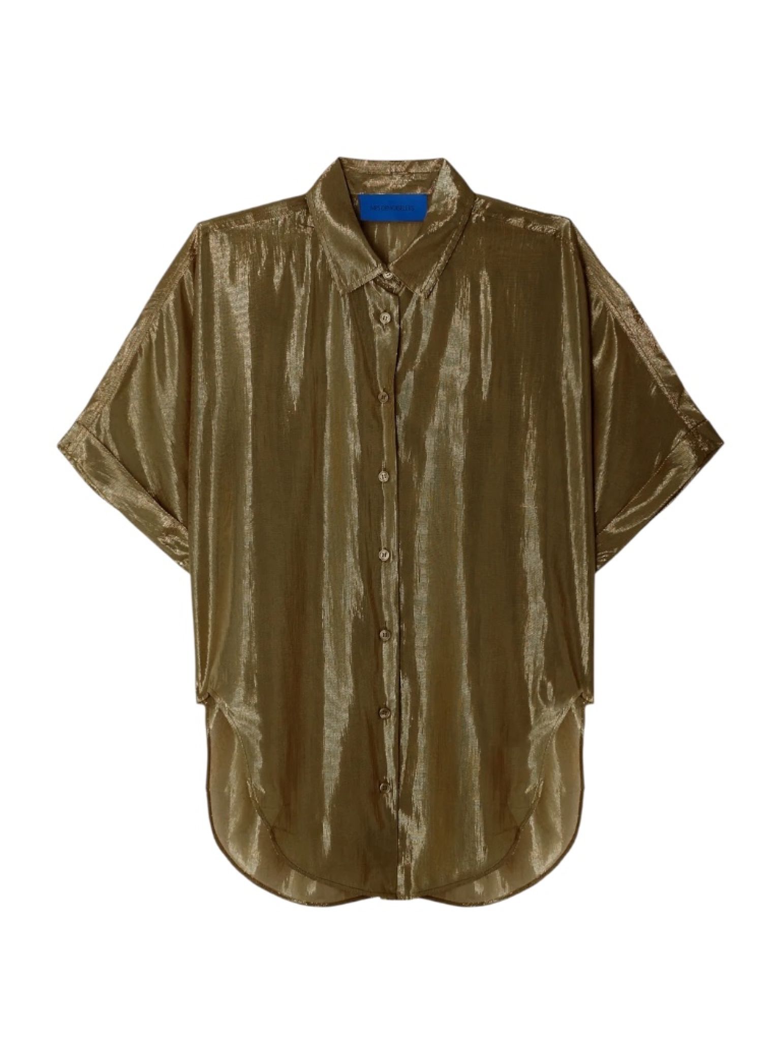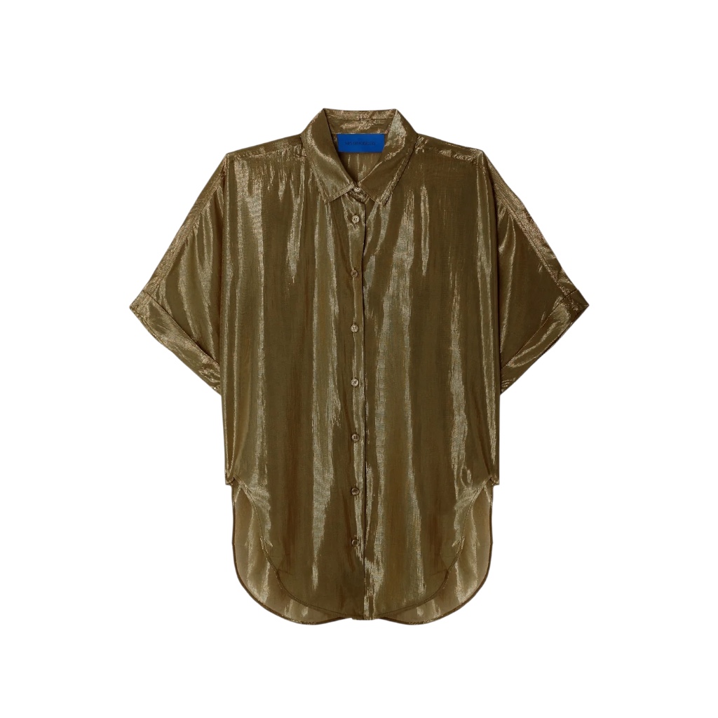 - Chemise fluide kaki bronze en viscose légère soulignée d’un fil lurex doré, coupe courte et décontractée, manches à revers, ourlet arrondi, matière souple qui permet de la nouer facilement à la taille. Non doublée, à porter avec le pantalon “Leone” pour un ensemble fluide et lumineux.