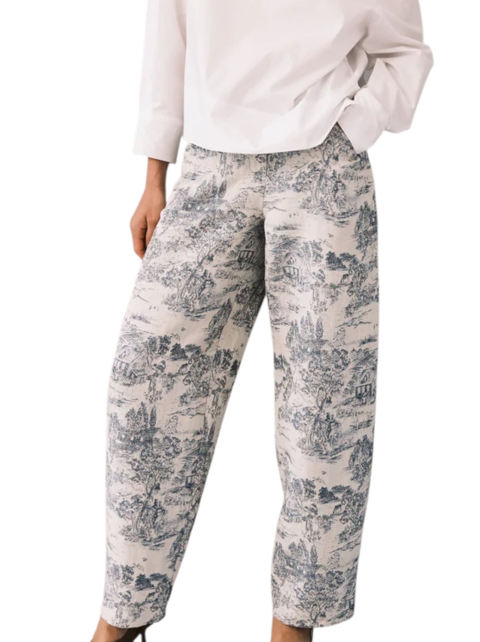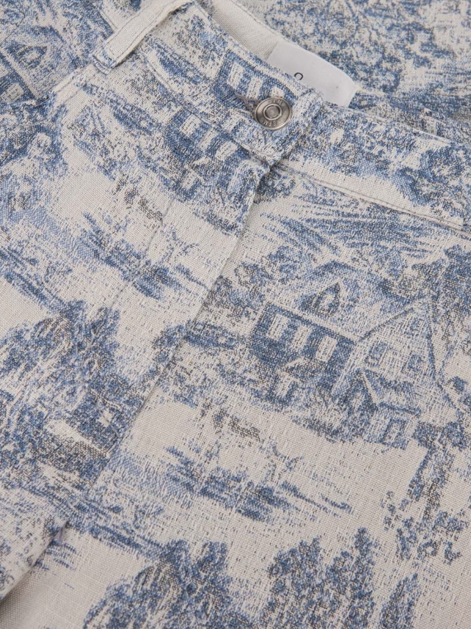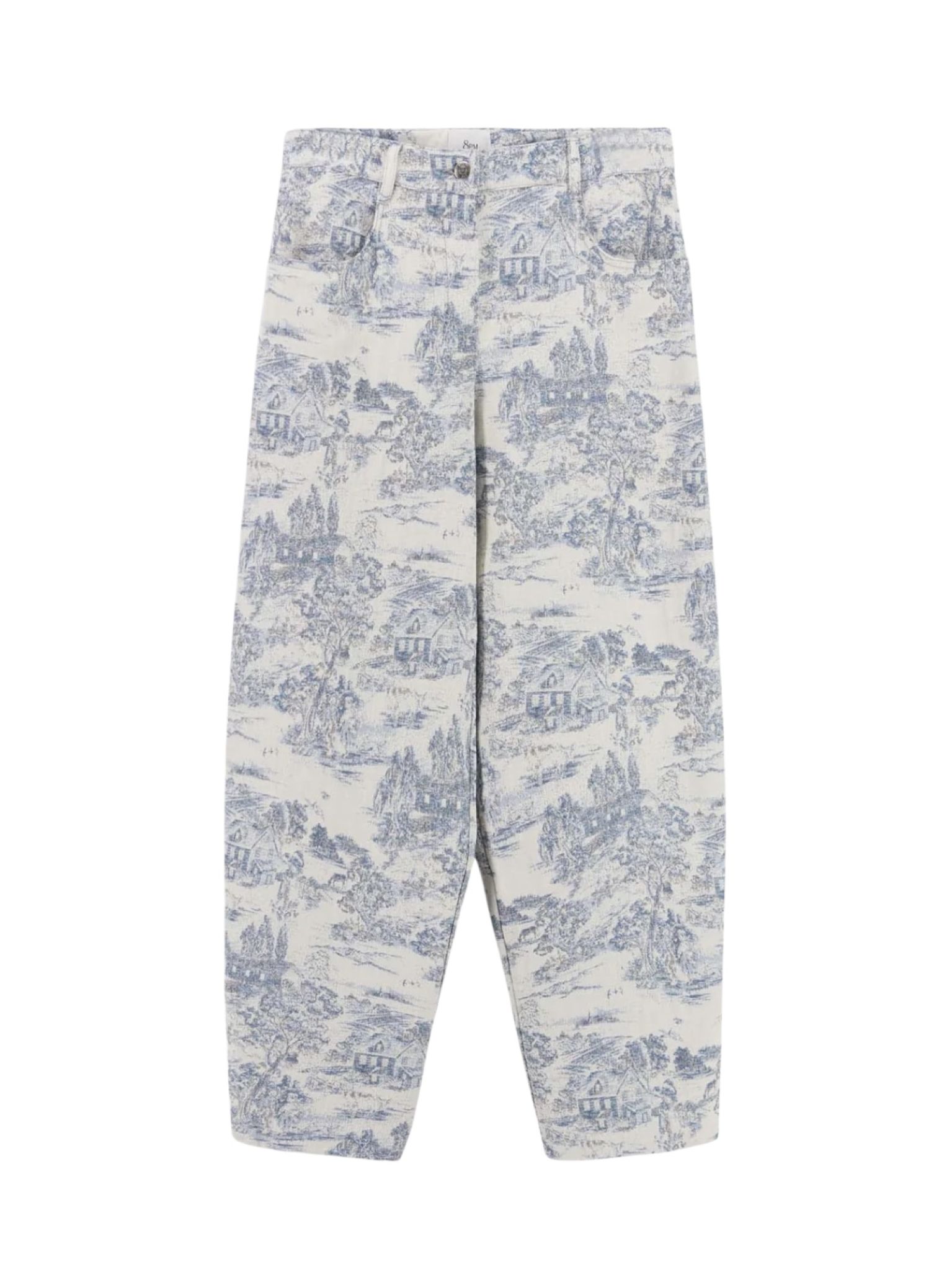 - Pantalon ample cinq poches en toile de Jouy, passants de ceinture à la taille, fermeture éclair et bouton métallique