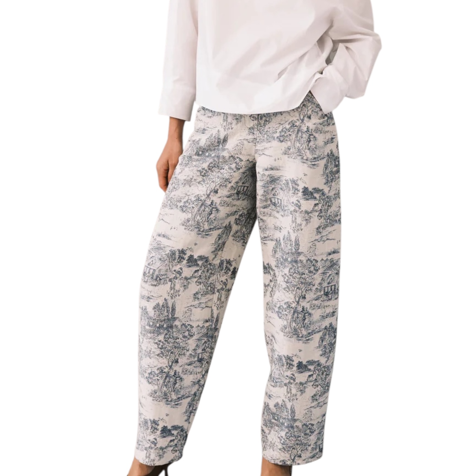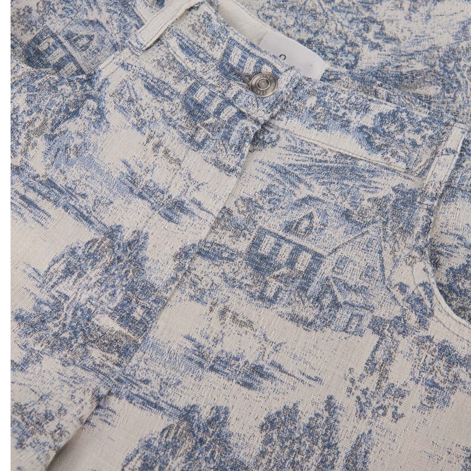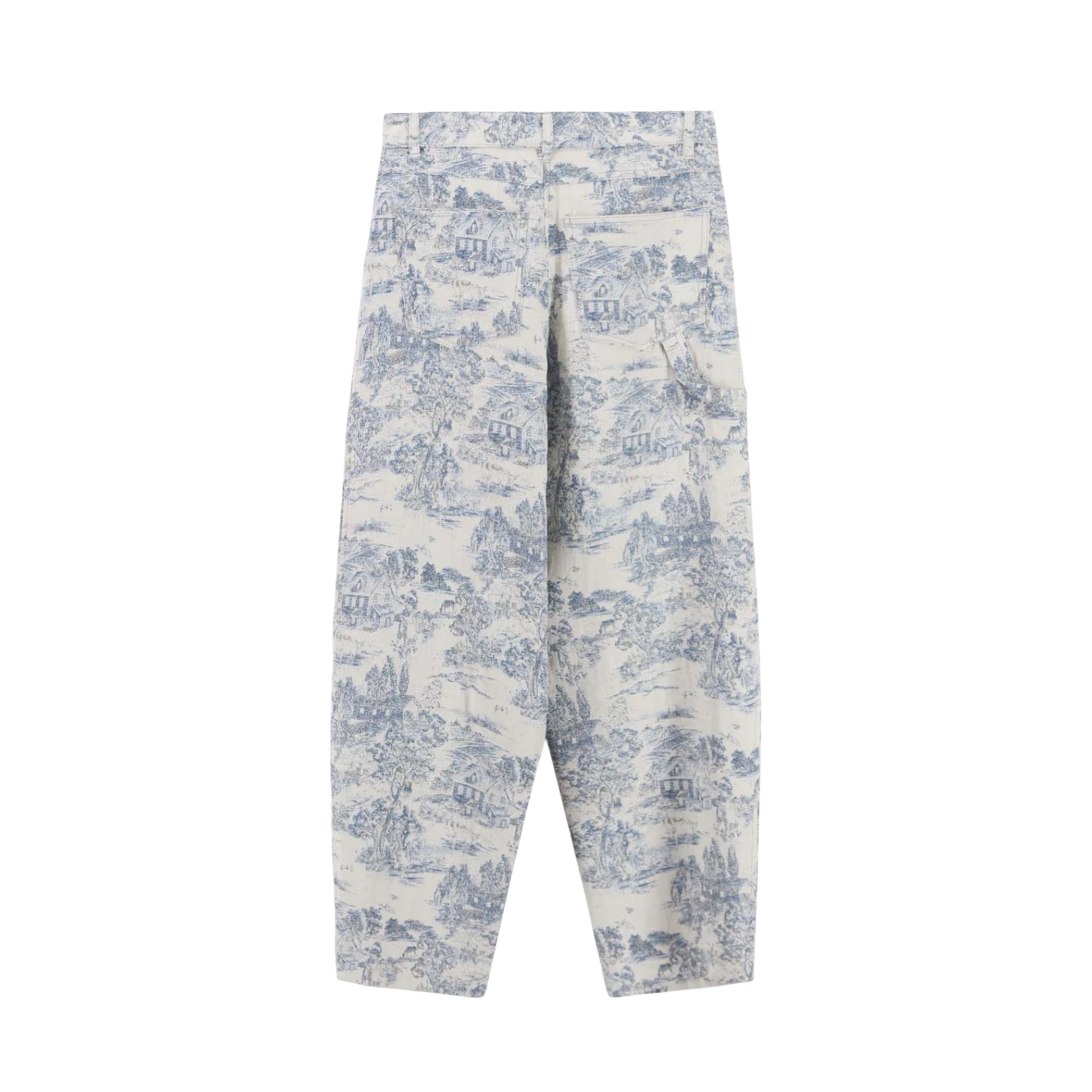 - Pantalon ample cinq poches en toile de Jouy, passants de ceinture à la taille, fermeture éclair et bouton métallique
