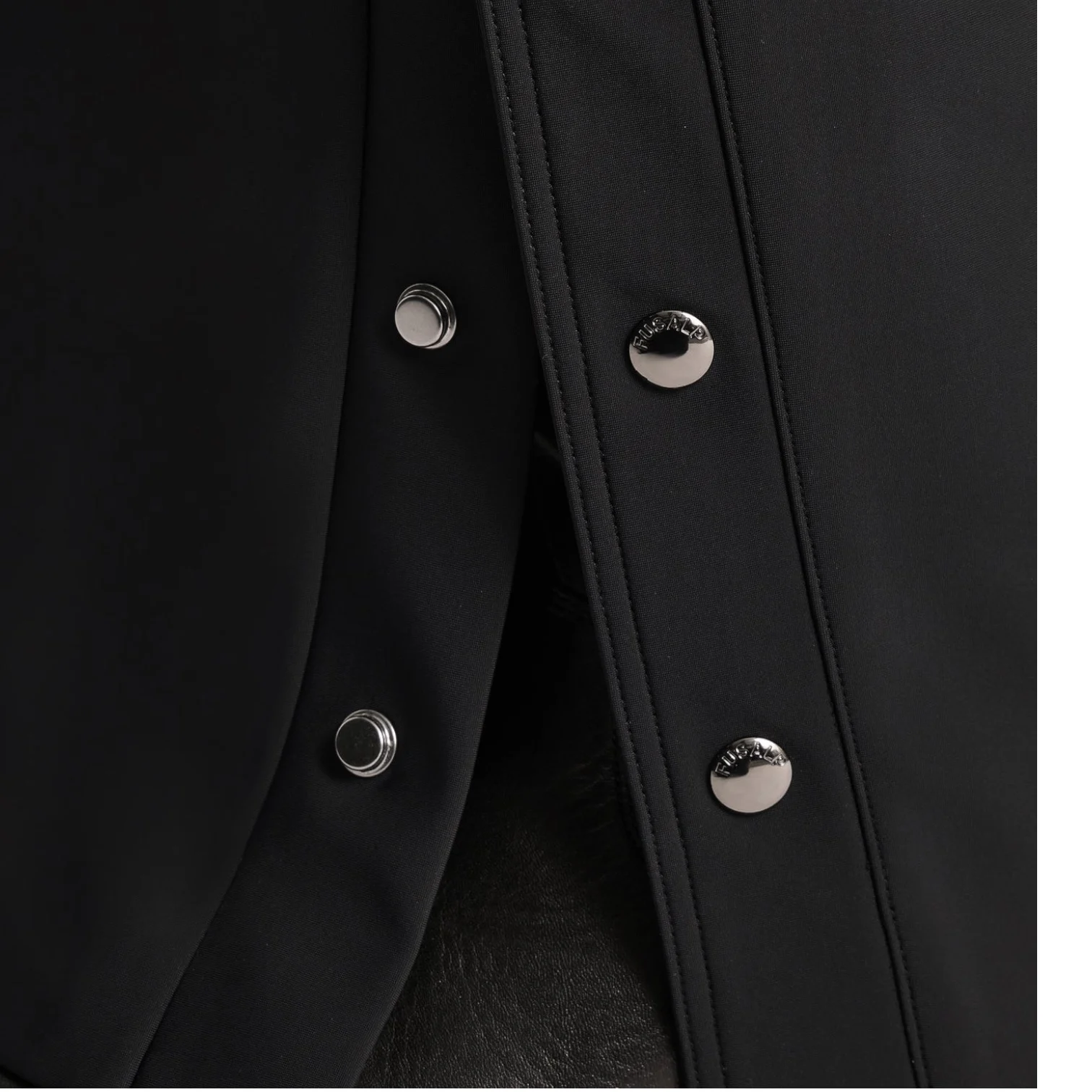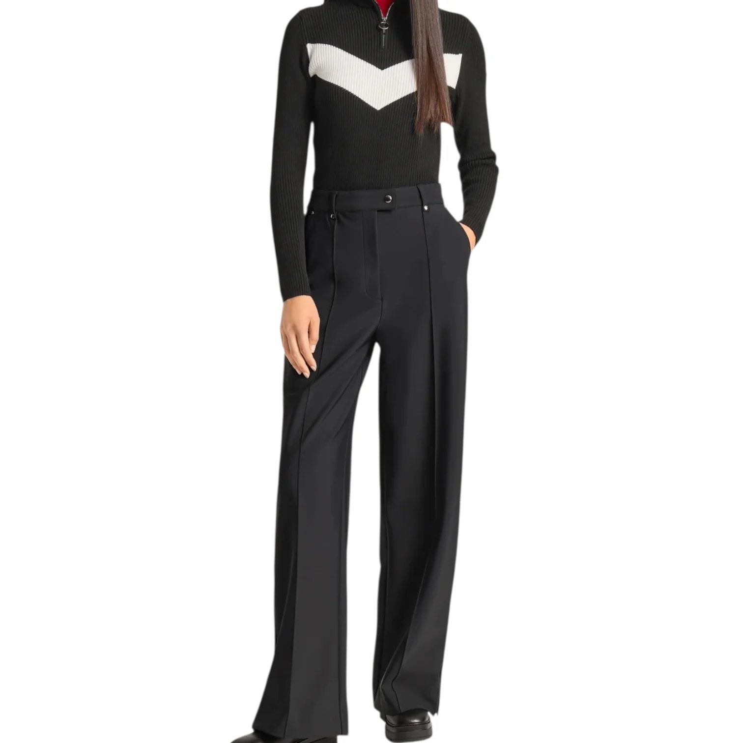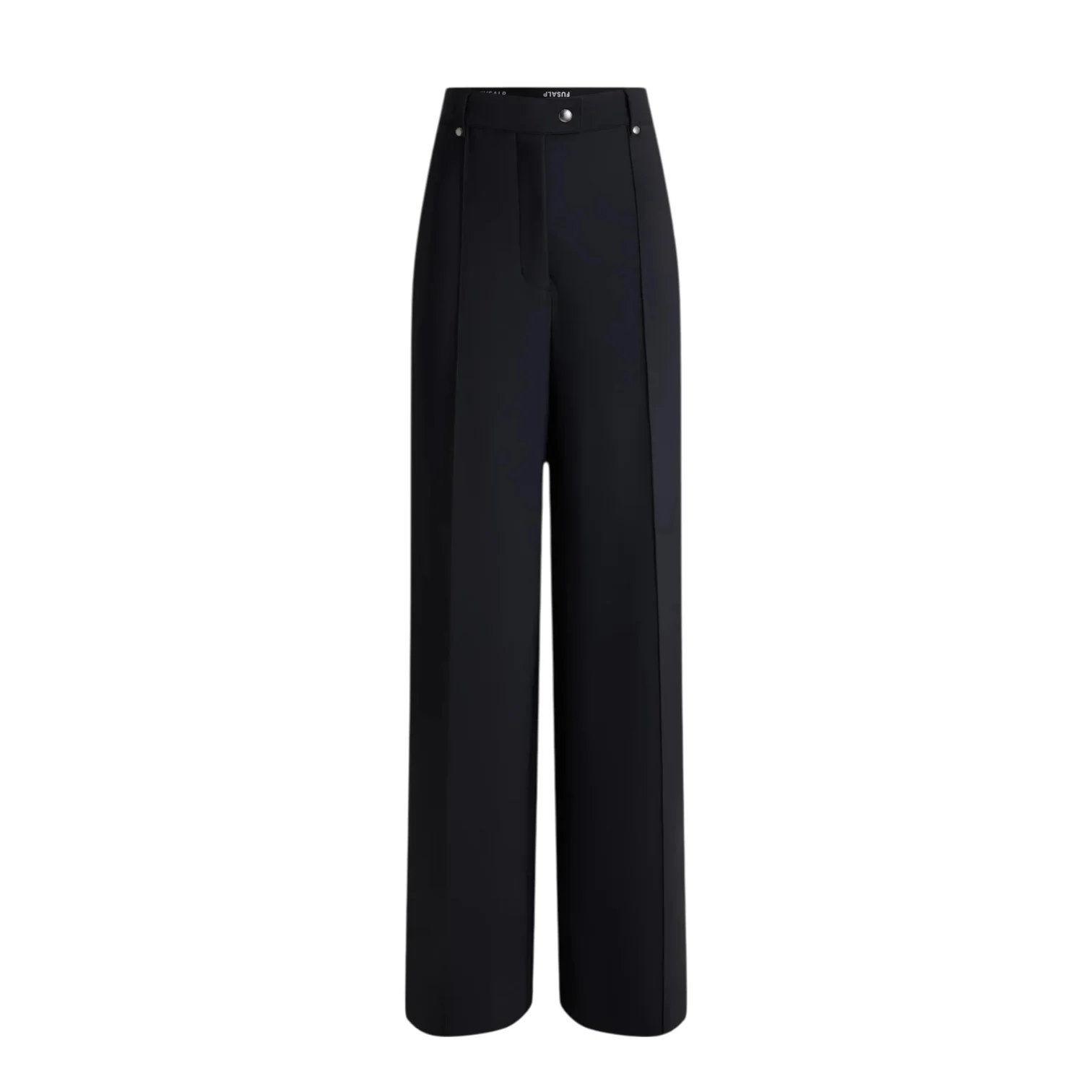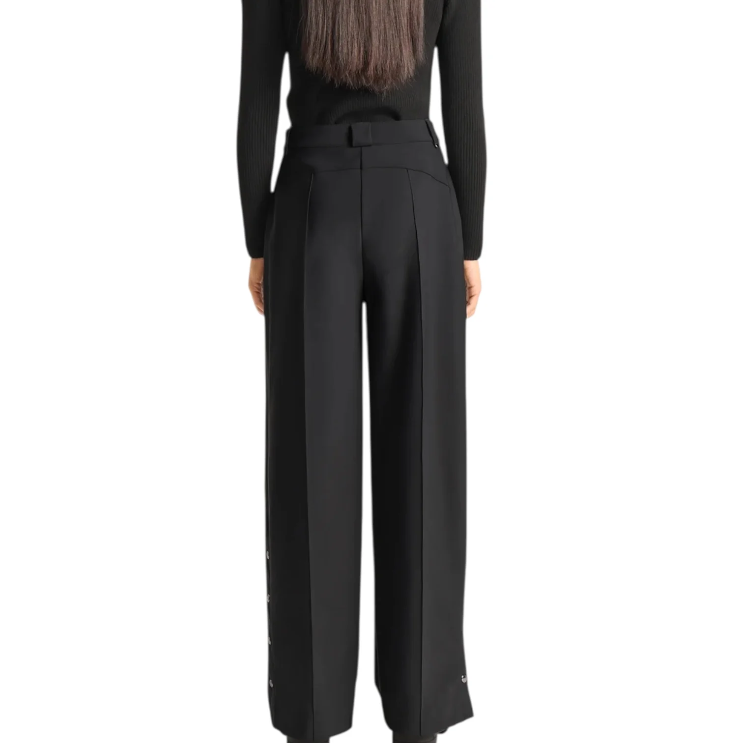 - Taille haute, jambe évasée avec fente latérale et boutons pression