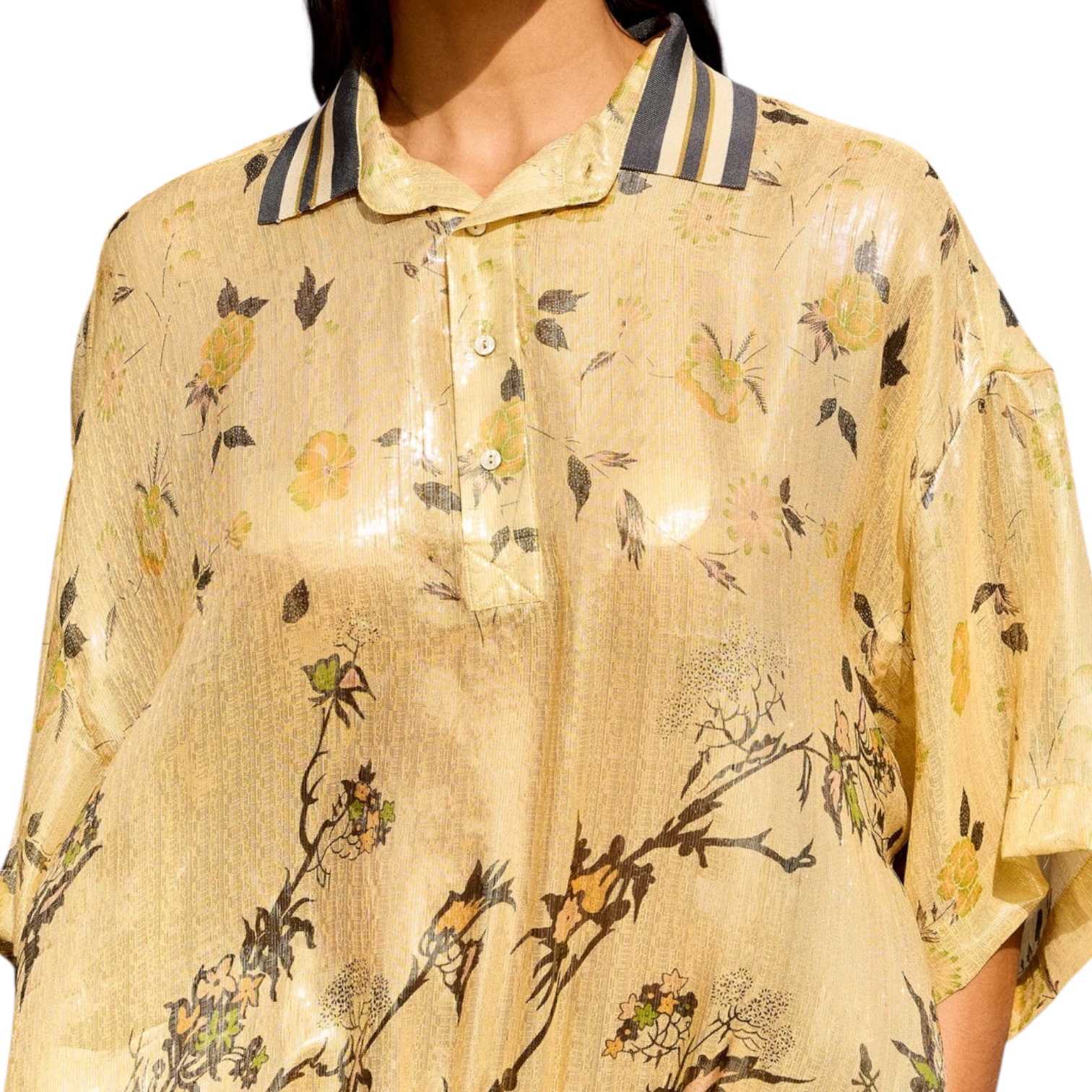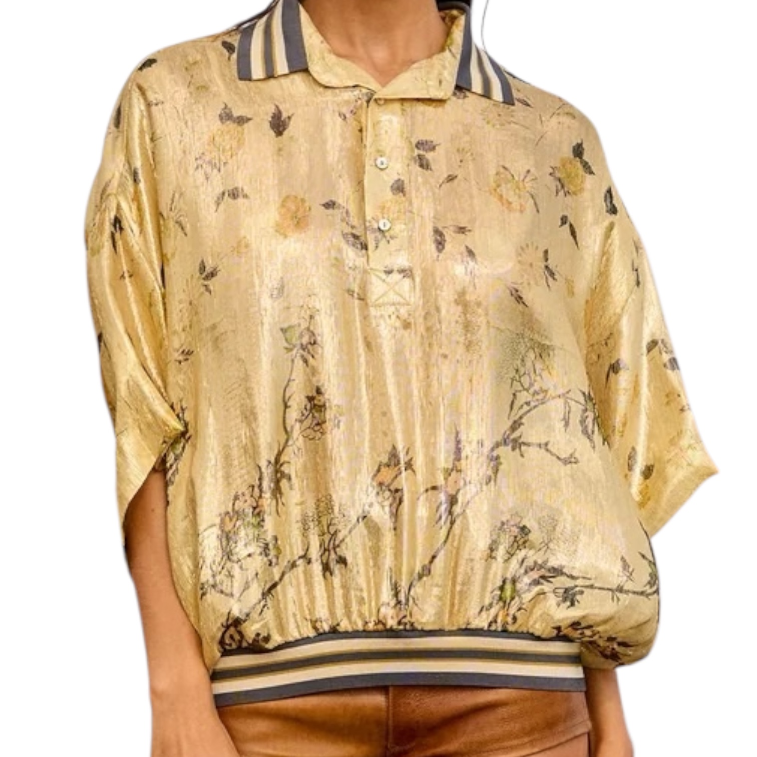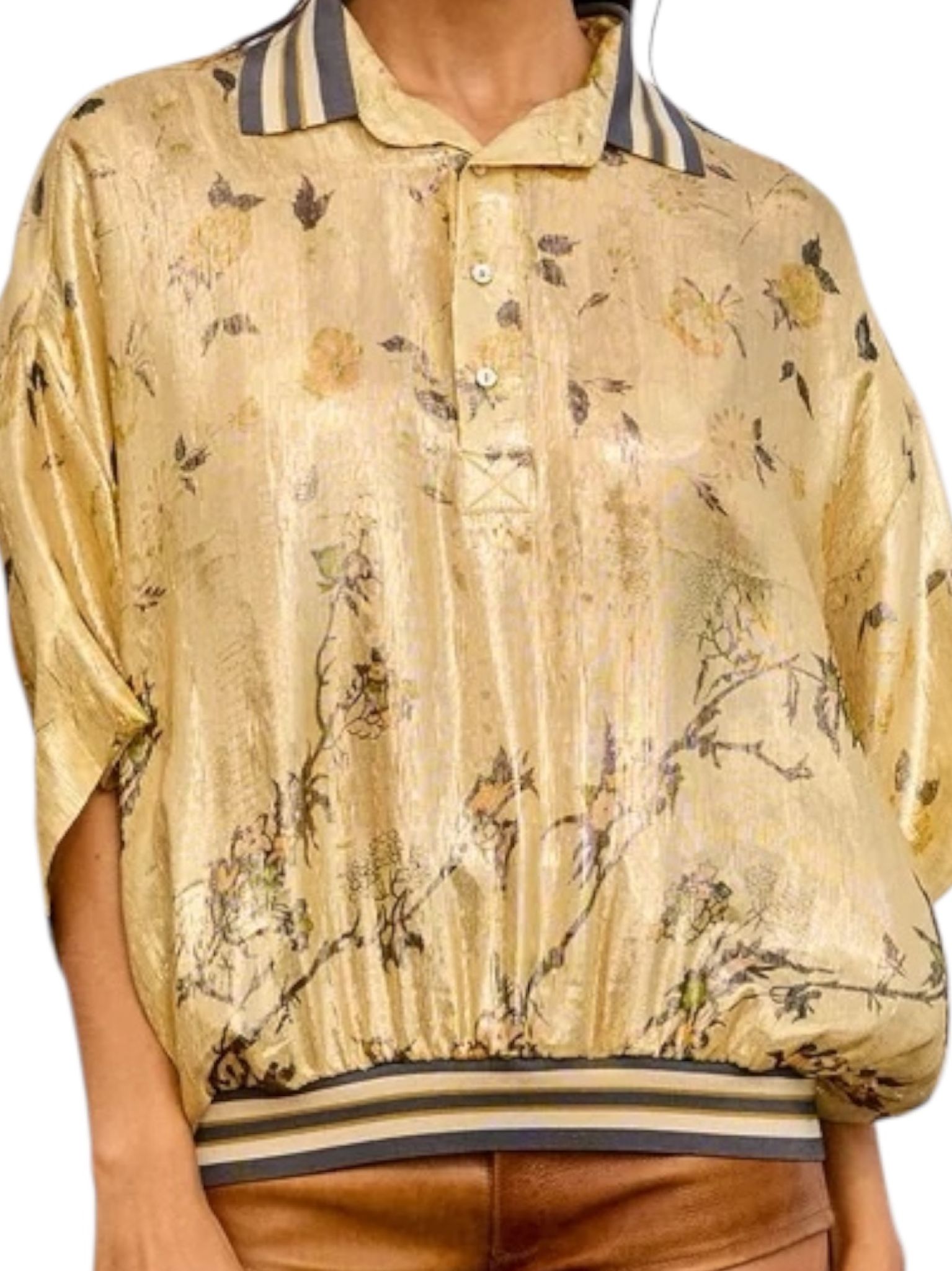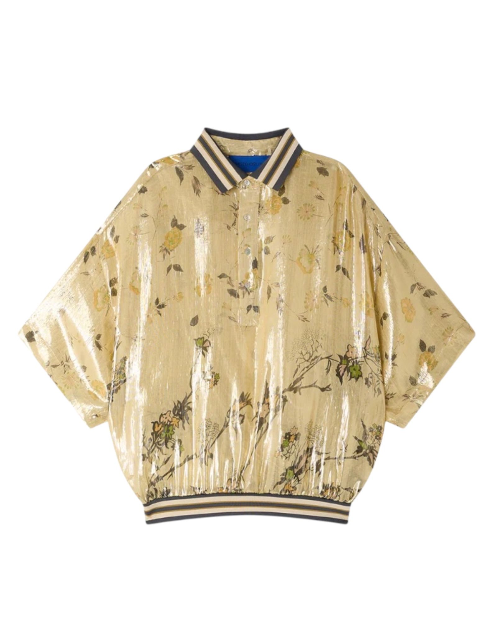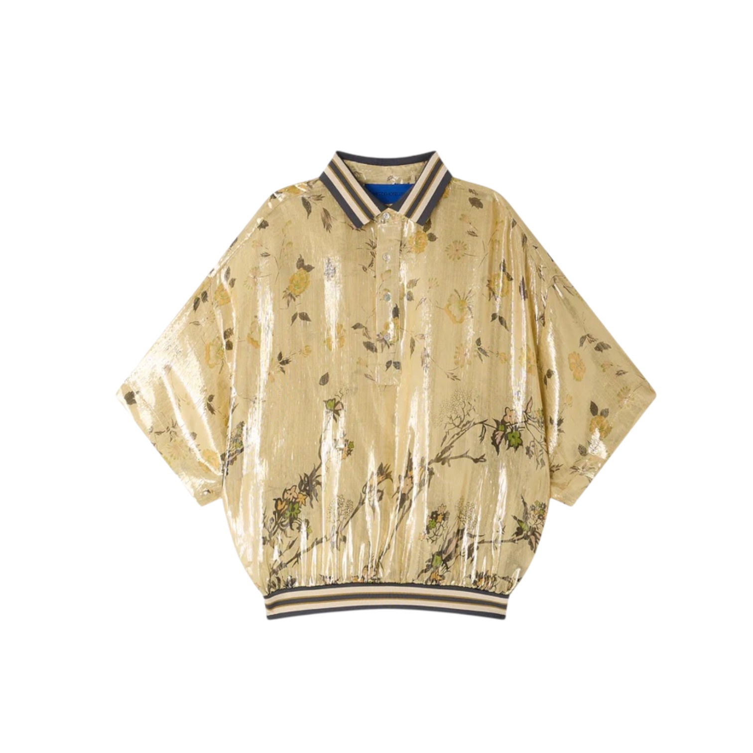 Polo réalisée en soie lurex, col rayé en bord-côte tricoté, rappelé également à la taille élastiquée, manches amples, imprimé placé de grandes fleurs