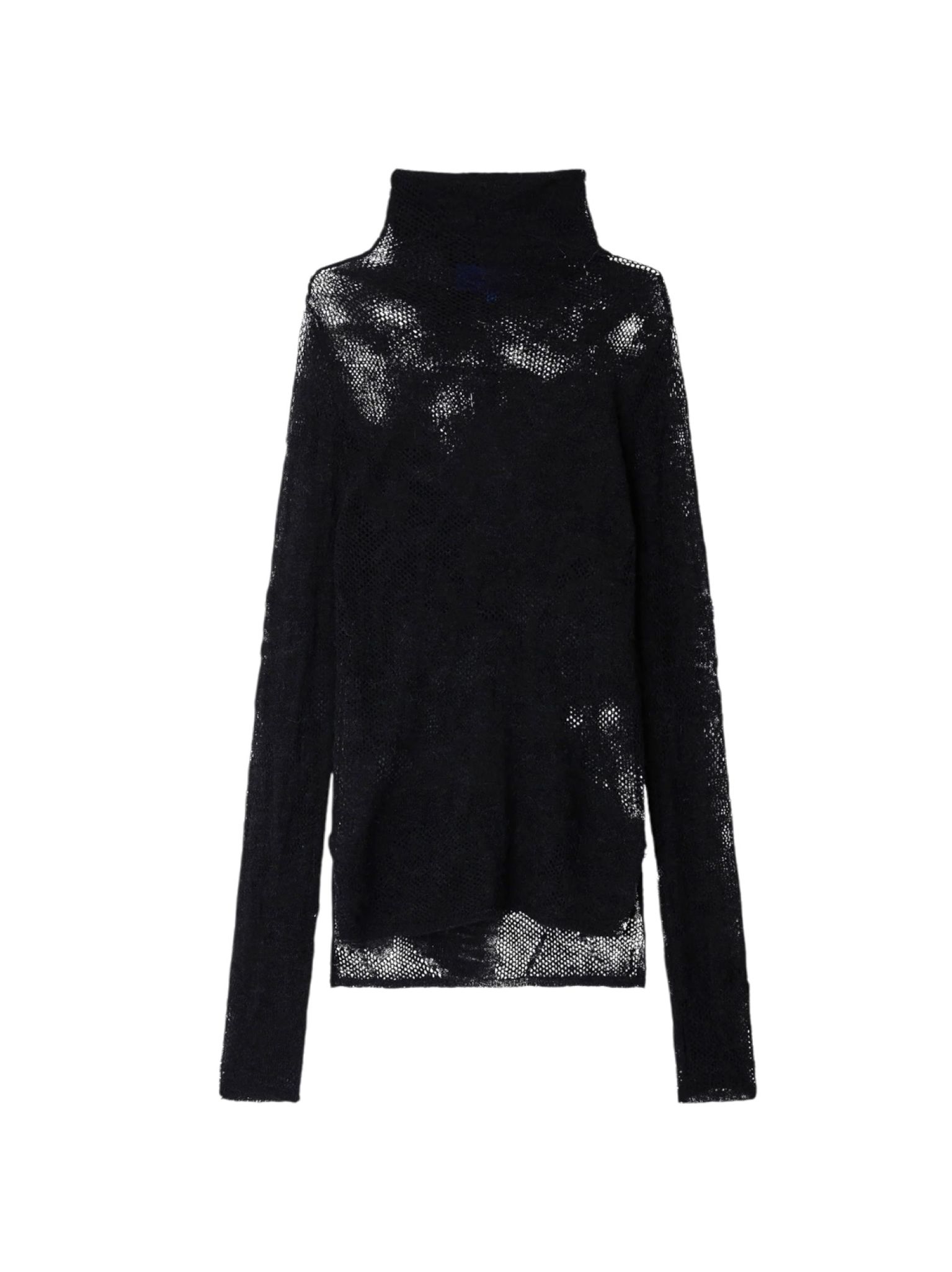 Tricoté dans une maille d’alpaca souple et aérée, ce pull noir se distingue par sa texture pointelle travaillée comme une dentelle, révélant un motif délicat de fleurs ajourées. Légèrement transparent