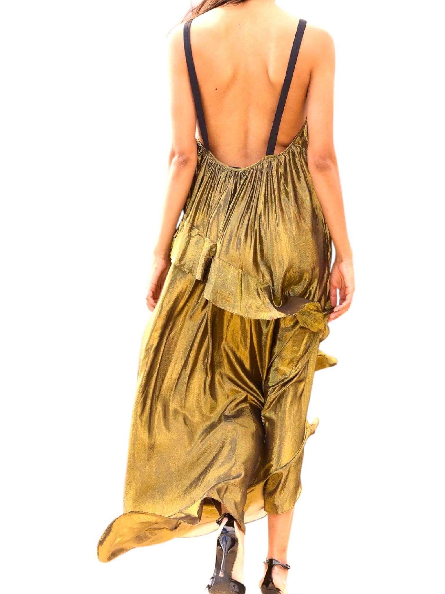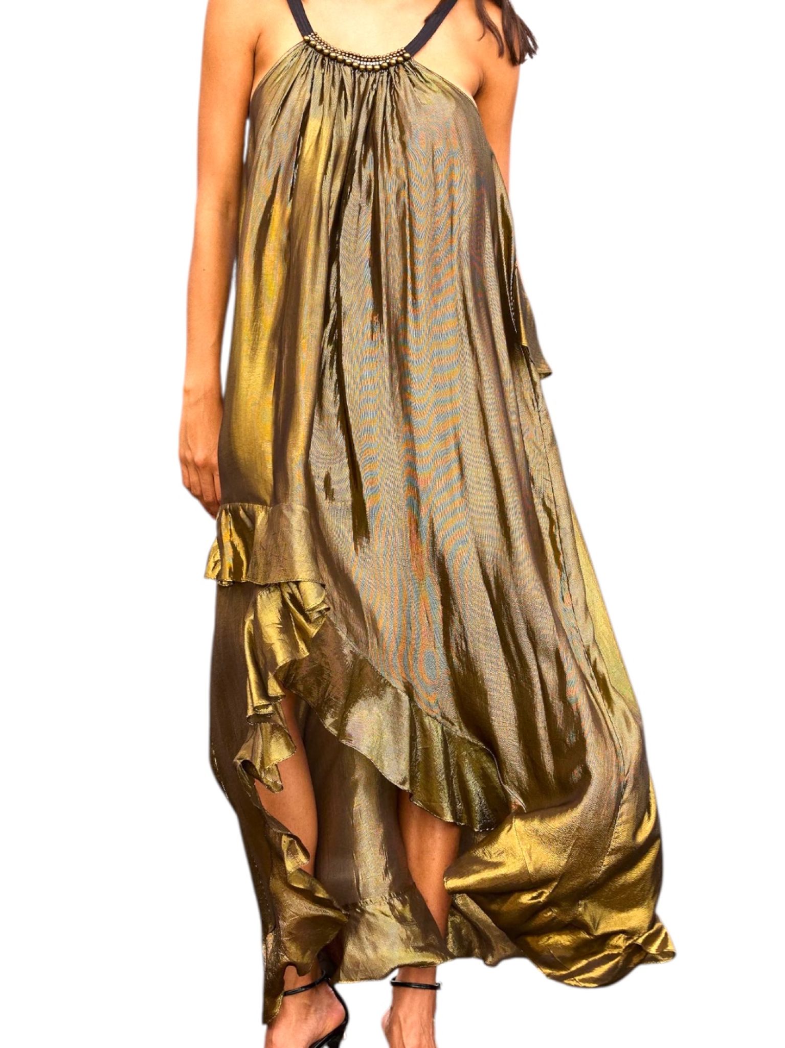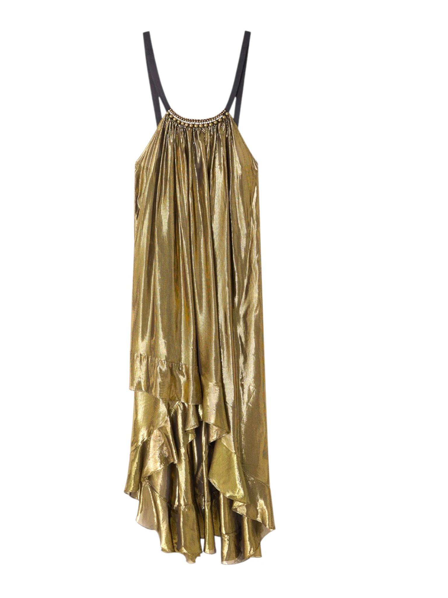 - Robe légère en viscose fluide charcoal animée d’un fil lurex doré tissé dans la longueur, coupe ample et vaporeuse sublimée par des volants tournants qui partent du dos et soulignent le mouvement du tissu, plus court sur l’avant pour un tombé asymétrique élégant.
