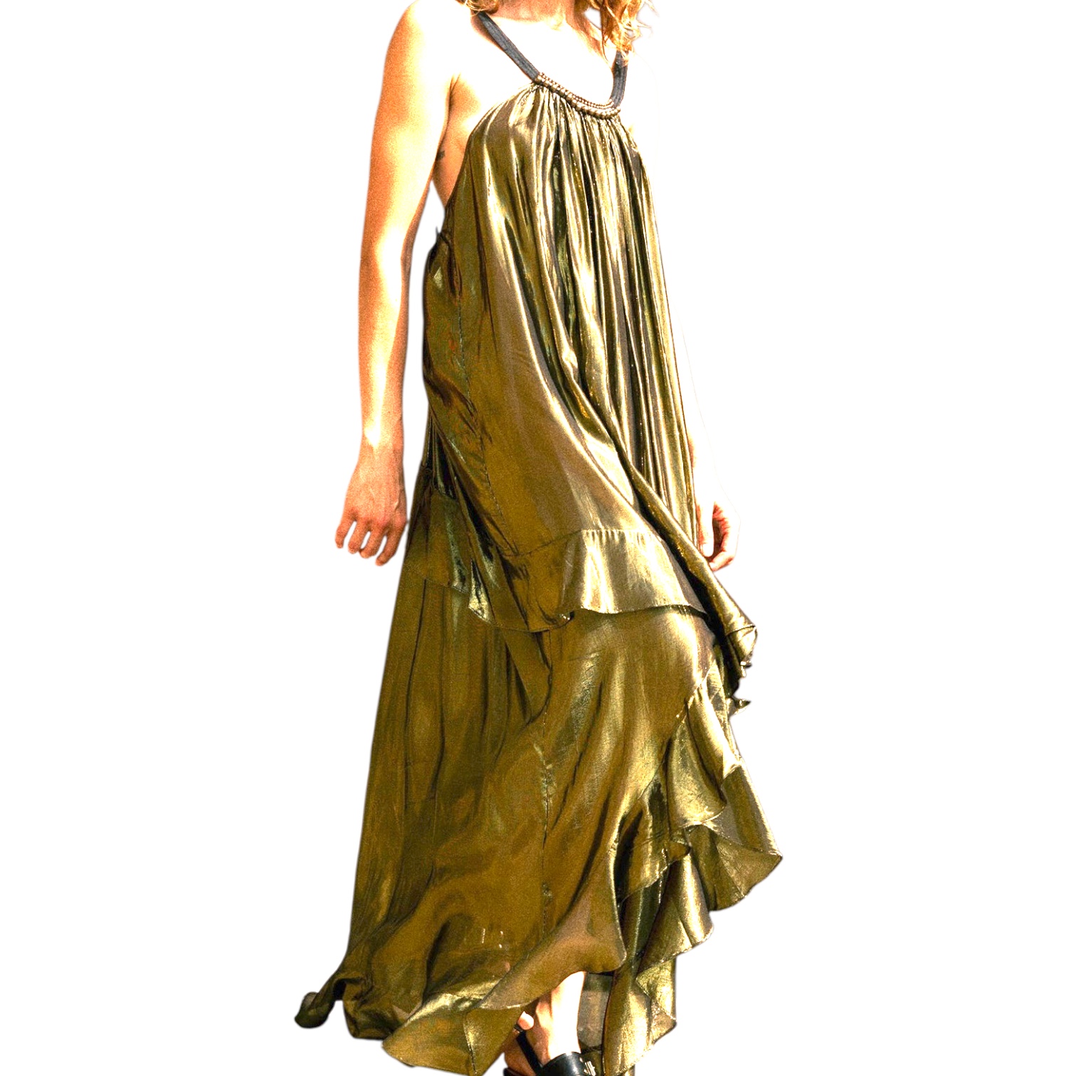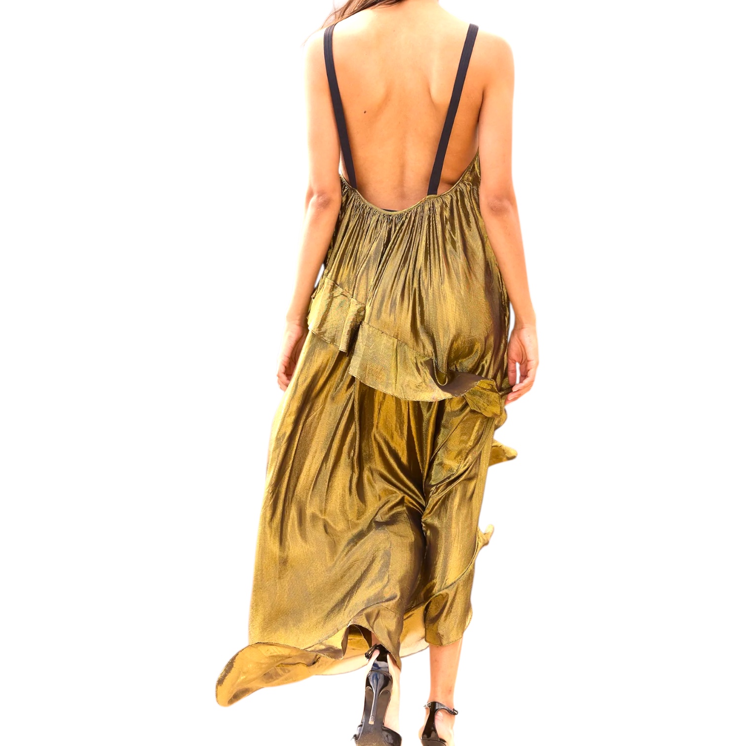 - Robe légère en viscose fluide charcoal animée d’un fil lurex doré tissé dans la longueur, coupe ample et vaporeuse sublimée par des volants tournants qui partent du dos et soulignent le mouvement du tissu, plus court sur l’avant pour un tombé asymétrique élégant.
