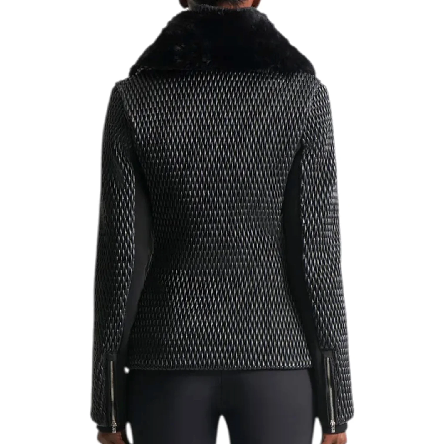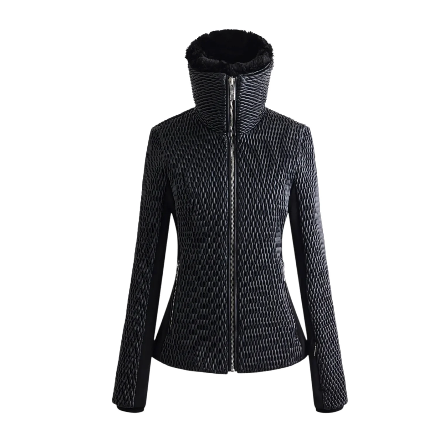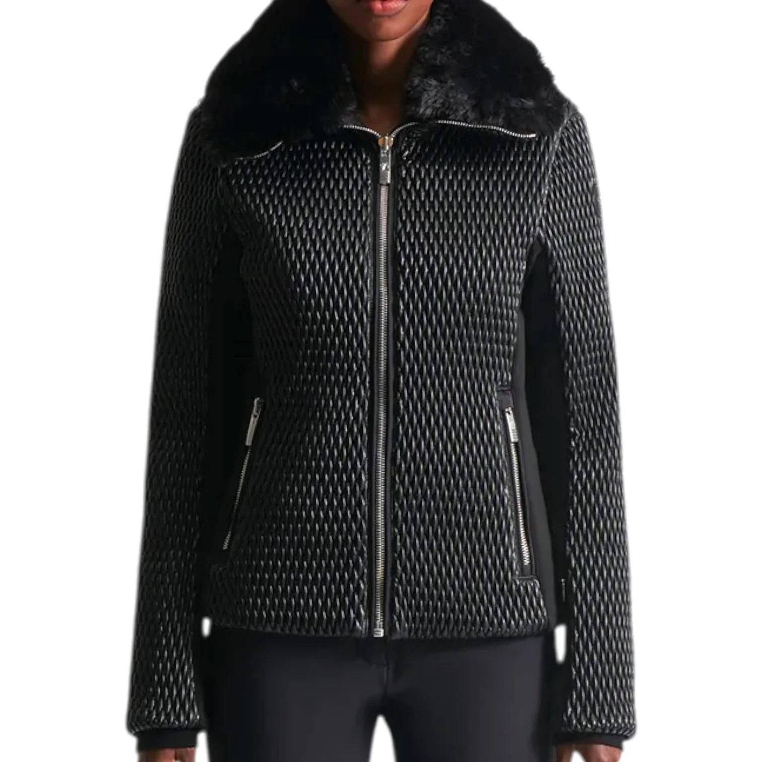 - Poches main, poche poitrine intérieure, poche ski pass zippées, pare-neige léger intégré, zips métalliques brillants
