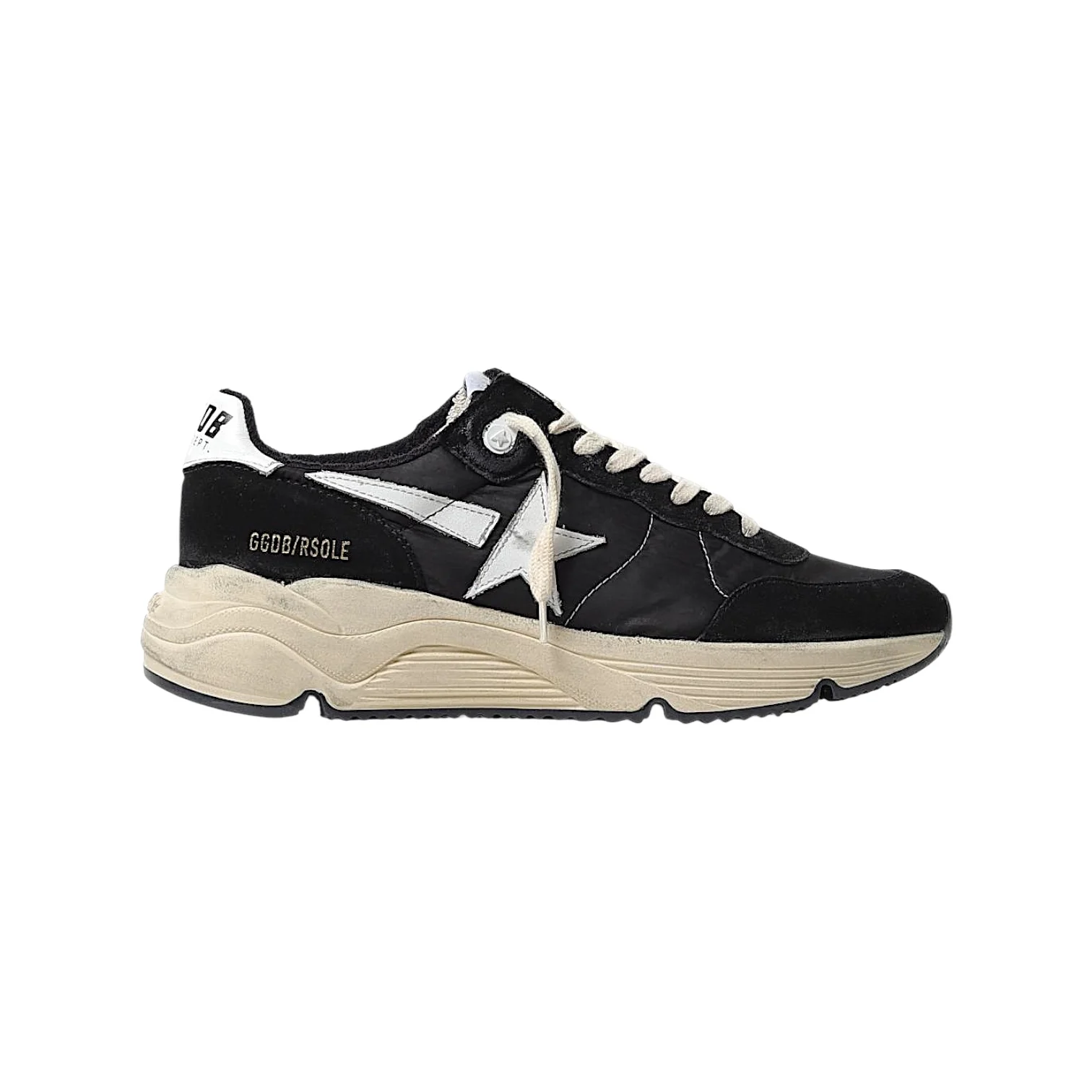 - Multi matière noir, patch logo étoile cuir blanc, inscription « GGDB/RSOLE sur le côté extérieur, contre forte blanc, intérieur maille bouclette, semelle caoutchouc effet usé