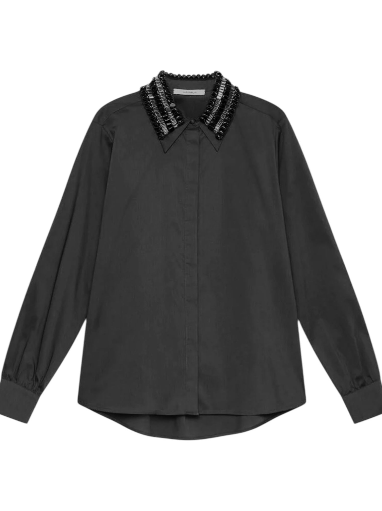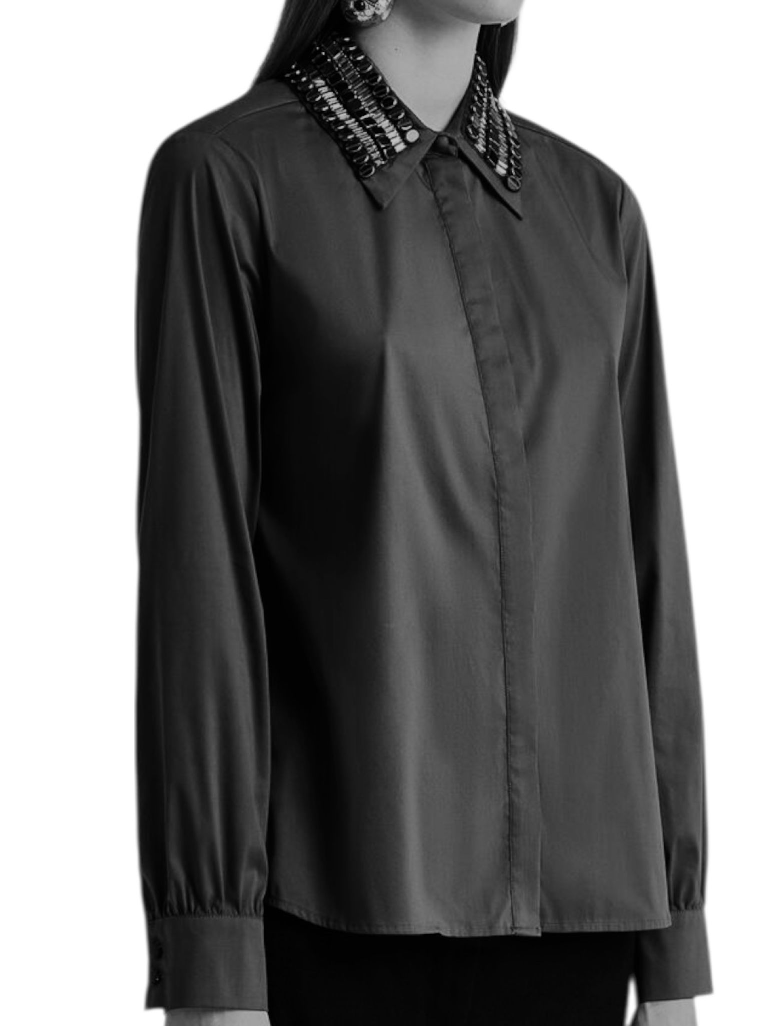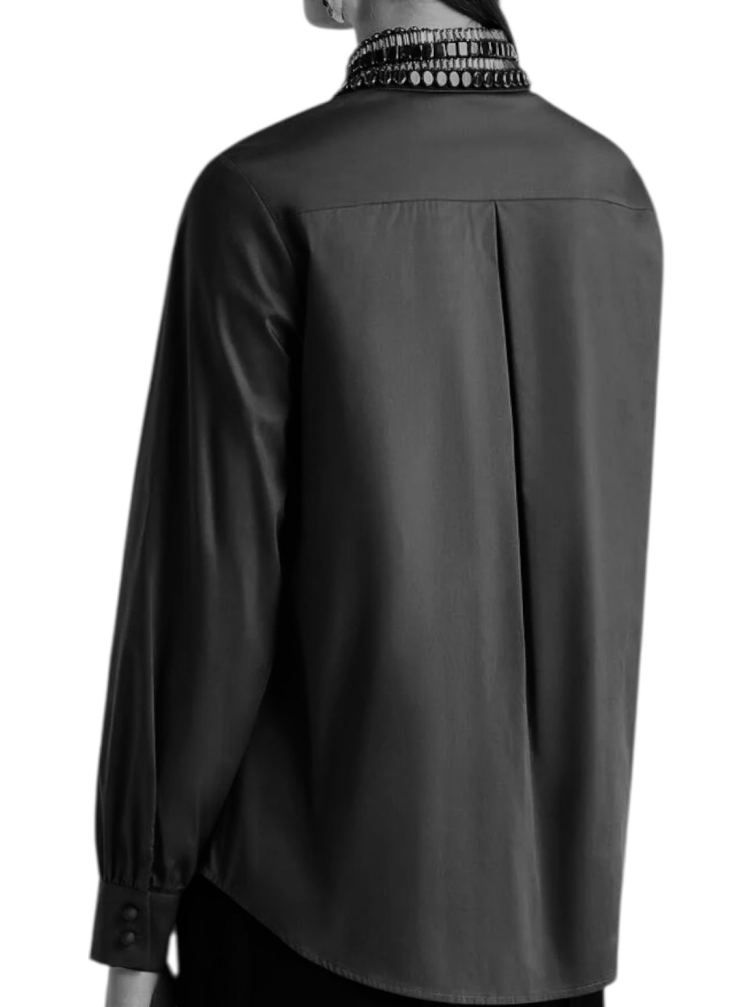 - Coupe droite, manches délicatement froncées au bas, cette chemise devient unique grâce au col entièrement brodé à la main de lignes horizontales de sequins et strass. Parfait équilibre entre essentialité et artisanat. Boutons recouverts et nacre complètent l’effet raffiné