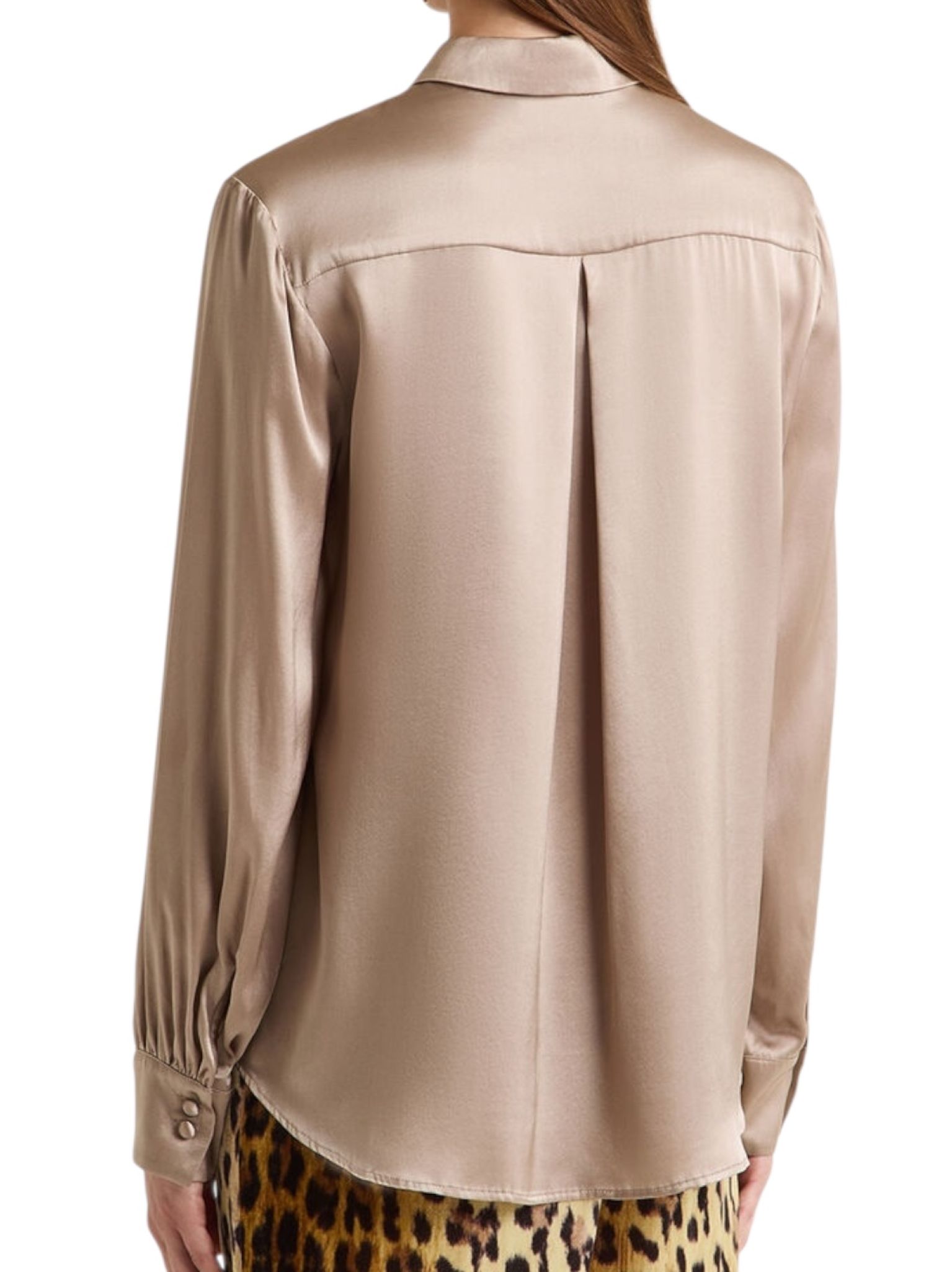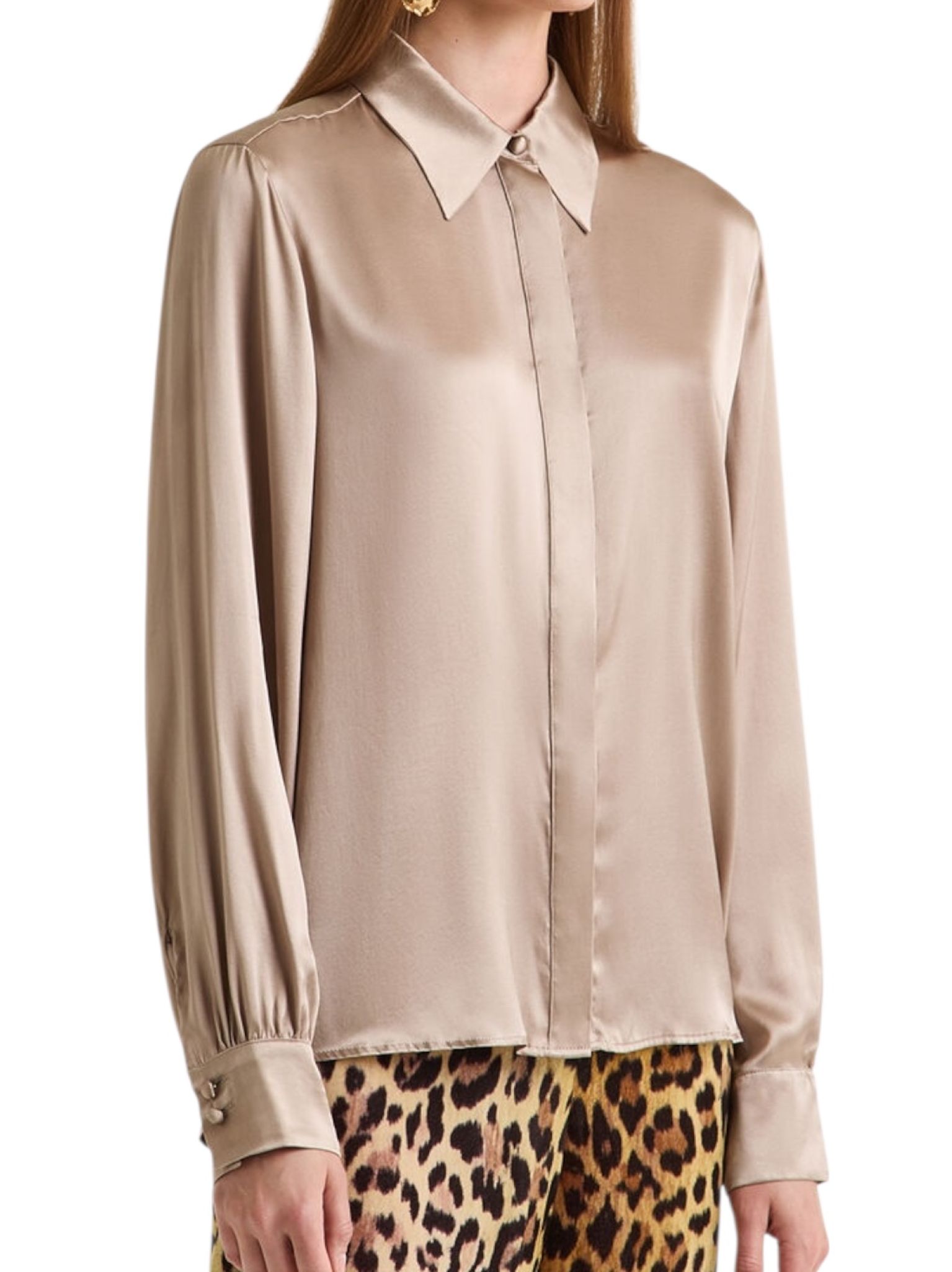 - Essentielle et sophistiquée. Cette chemise en satin de soie stretch est une caresse sur la peau et une touche de lumière dans le look. Coupe régulière, poignets légèrement froncés, fermeture boutonnée anglaise et col important