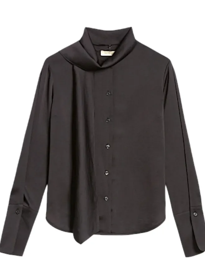 - Essentielle et sophistiquée. Cette chemise en satin de soie stretch est une caresse sur la peau et une touche de lumière dans le look. Coupe régulière, poignets légèrement froncés, fermeture boutonnée anglaise et col important