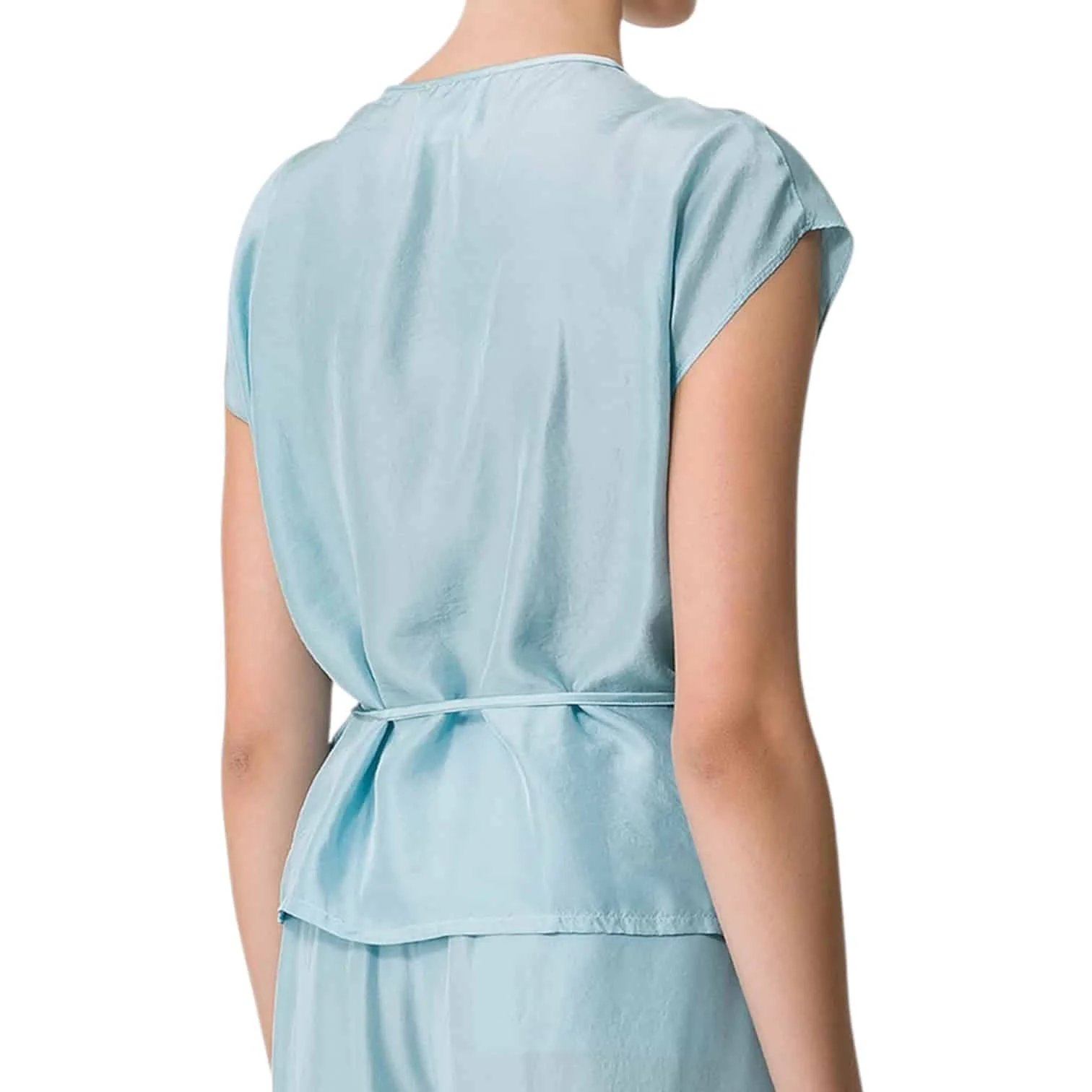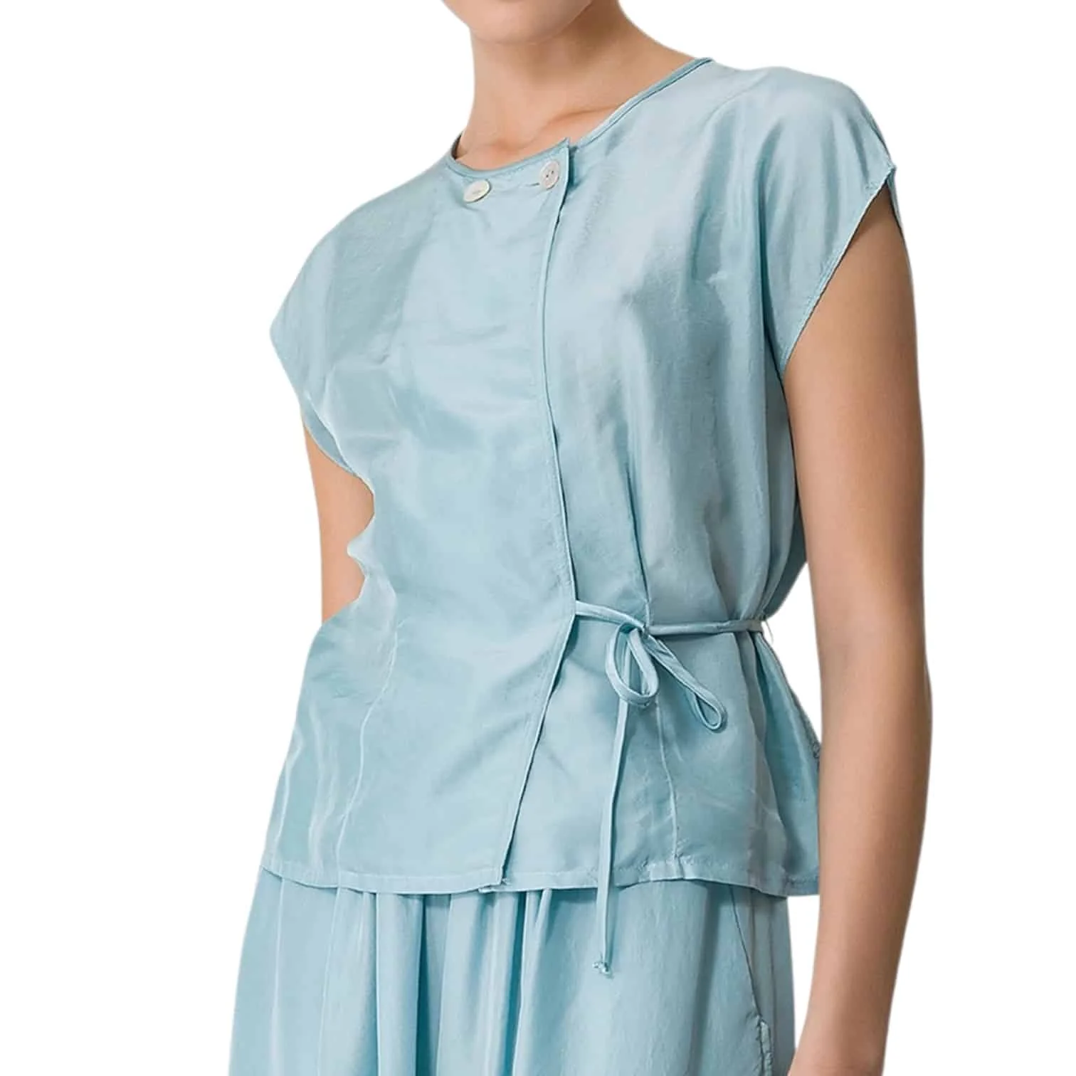 - Haut croisé réalisé en soie habotai, coupe légèrement courte à la taille.