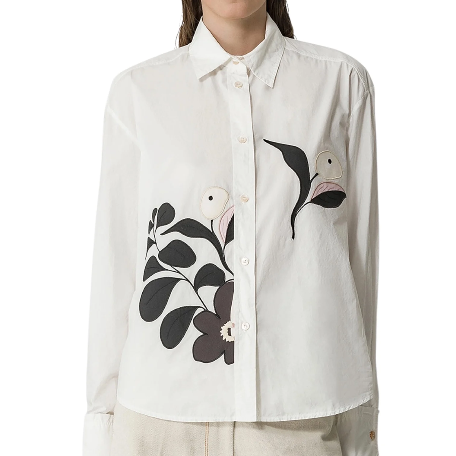 - Chemise blanche à imprimé fleuri. Fermeture par boutons nacrés. Coupe droite. Base arrondie. Manches longues.