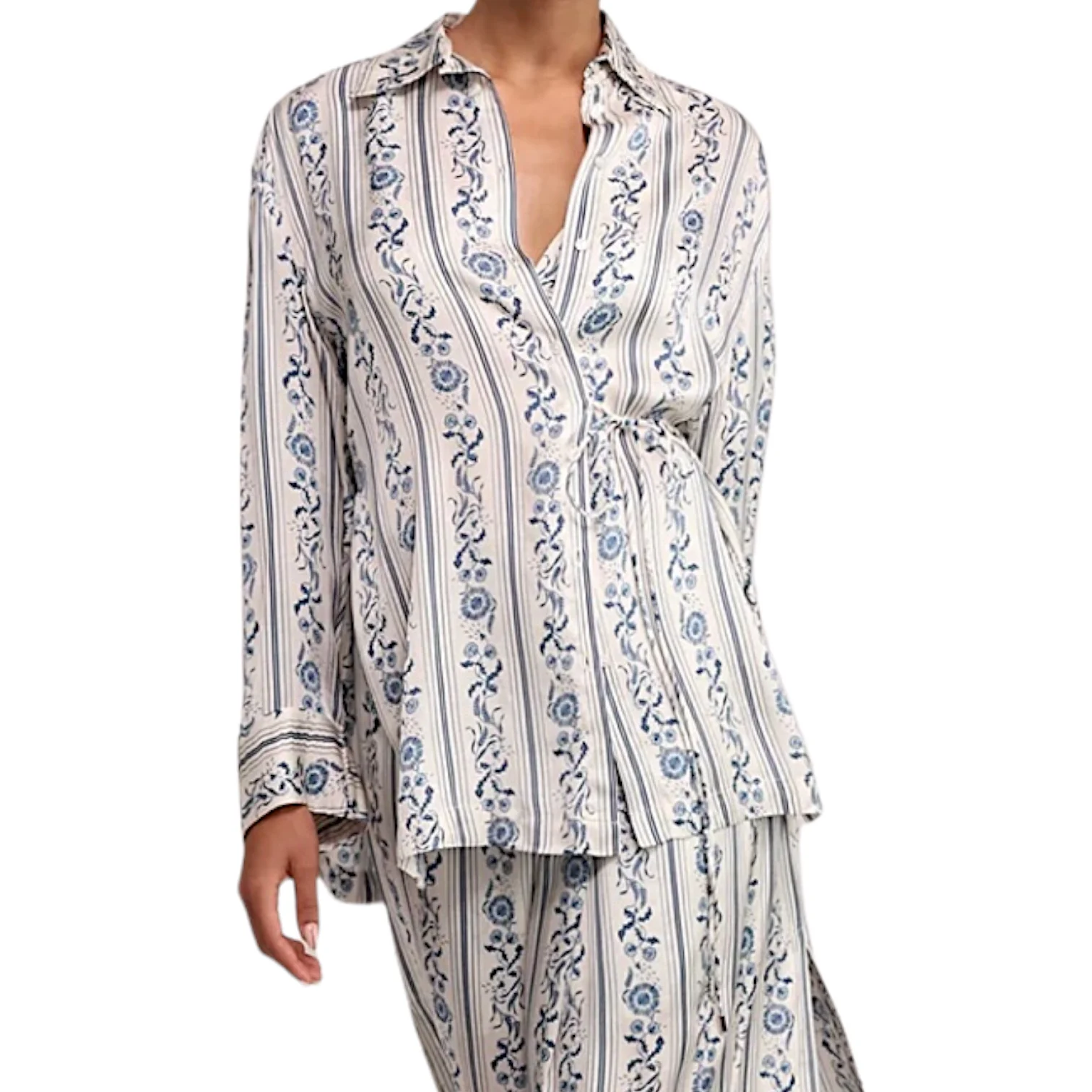 - Col chemise, manches longues, boutonnée devant, lien permettent de la cintrer