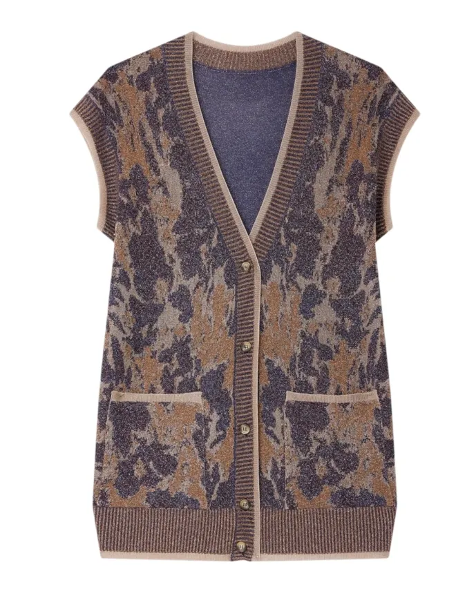 - Gilet en Alpaga / Lurex, fermeture centrale avec boutons effet corne, deux poches plaquées sur le devant