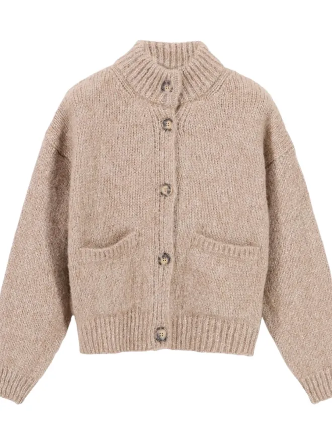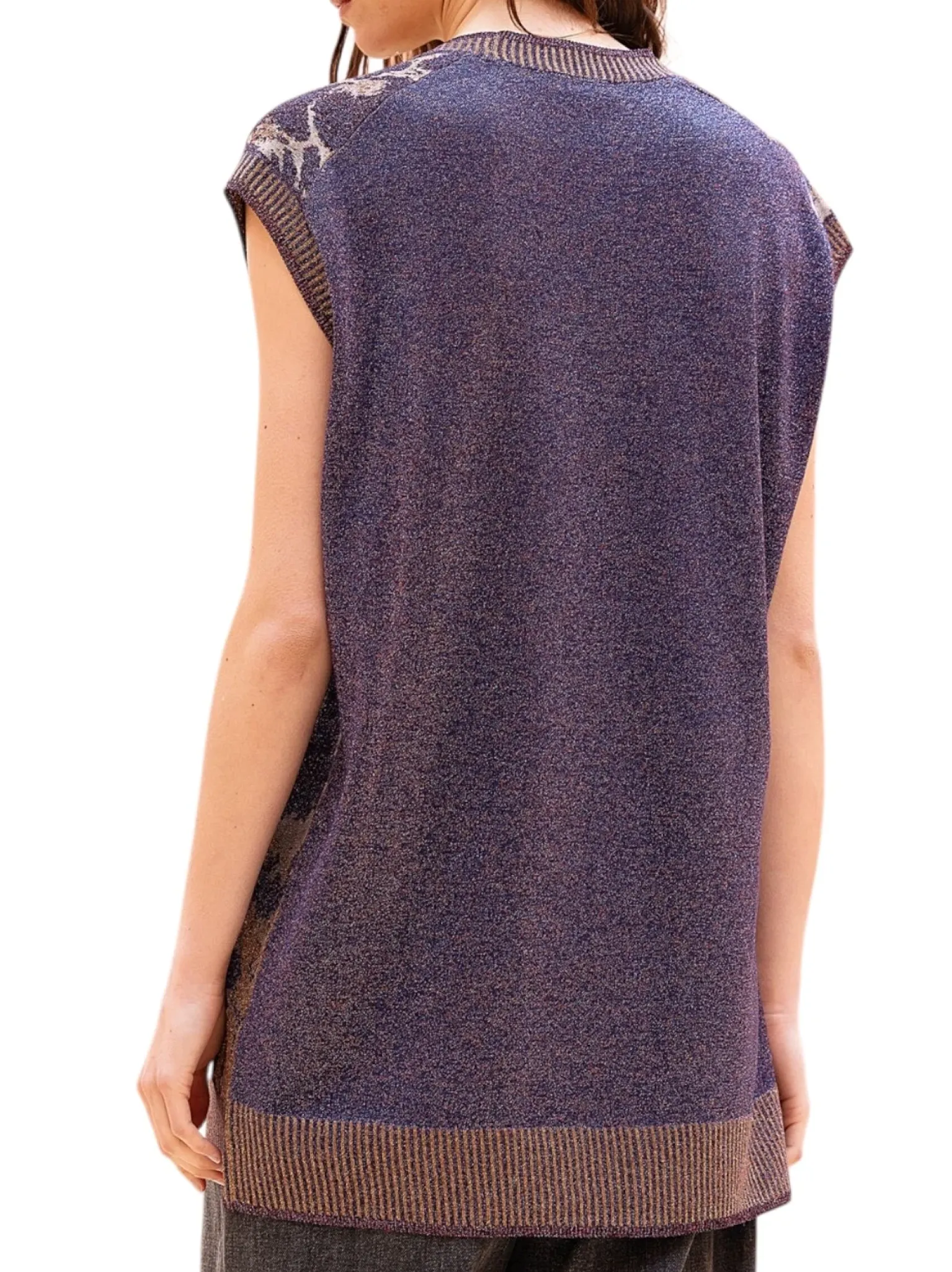 • Maxi gilet long aux couleurs violette et naturelles, sublimé par un fil lurex, dessins jacquard ultra fins, qui parcourent toute la pièce, créent un jeu de relief délicat et raffiné, poches plaquées, fermeture boutons, sans manches