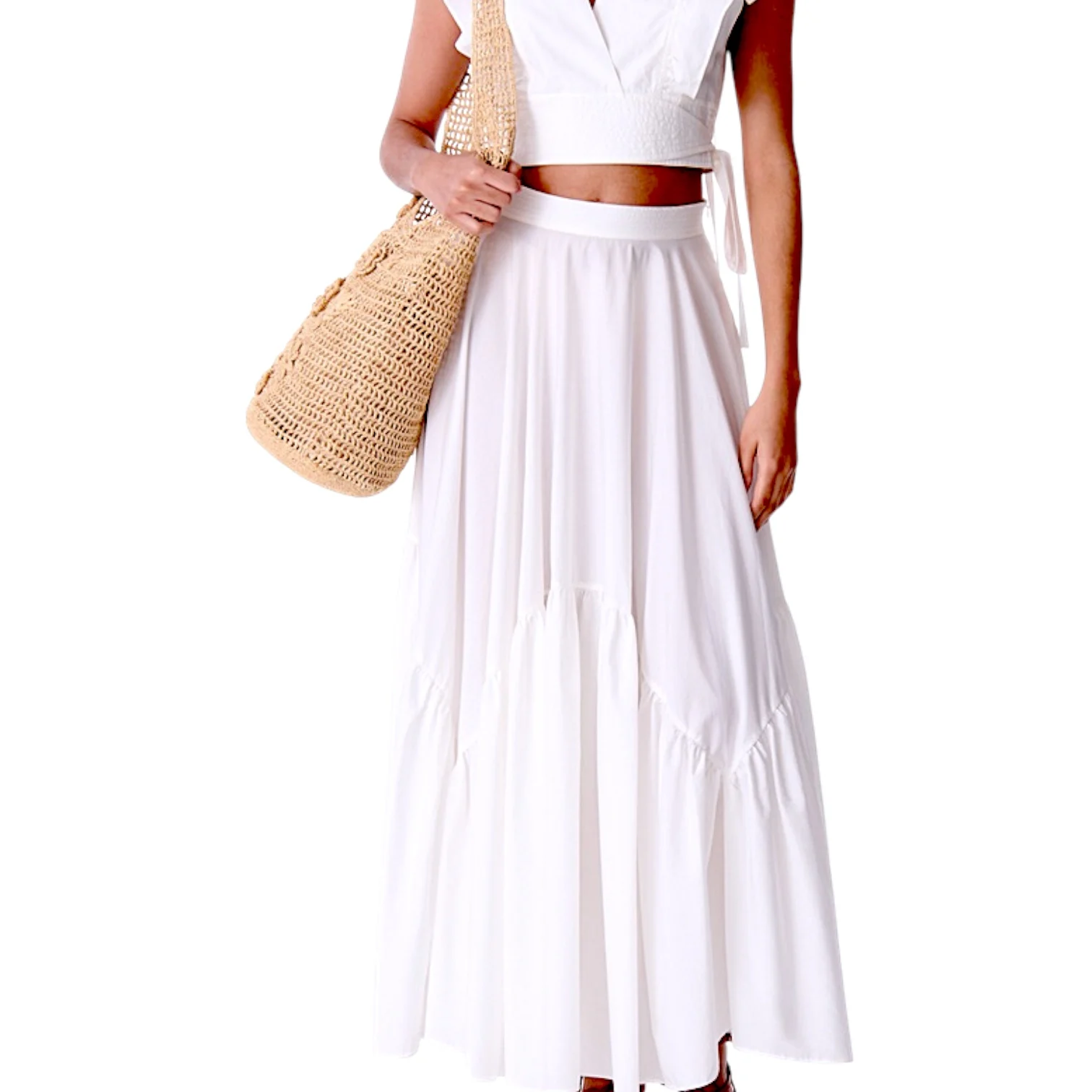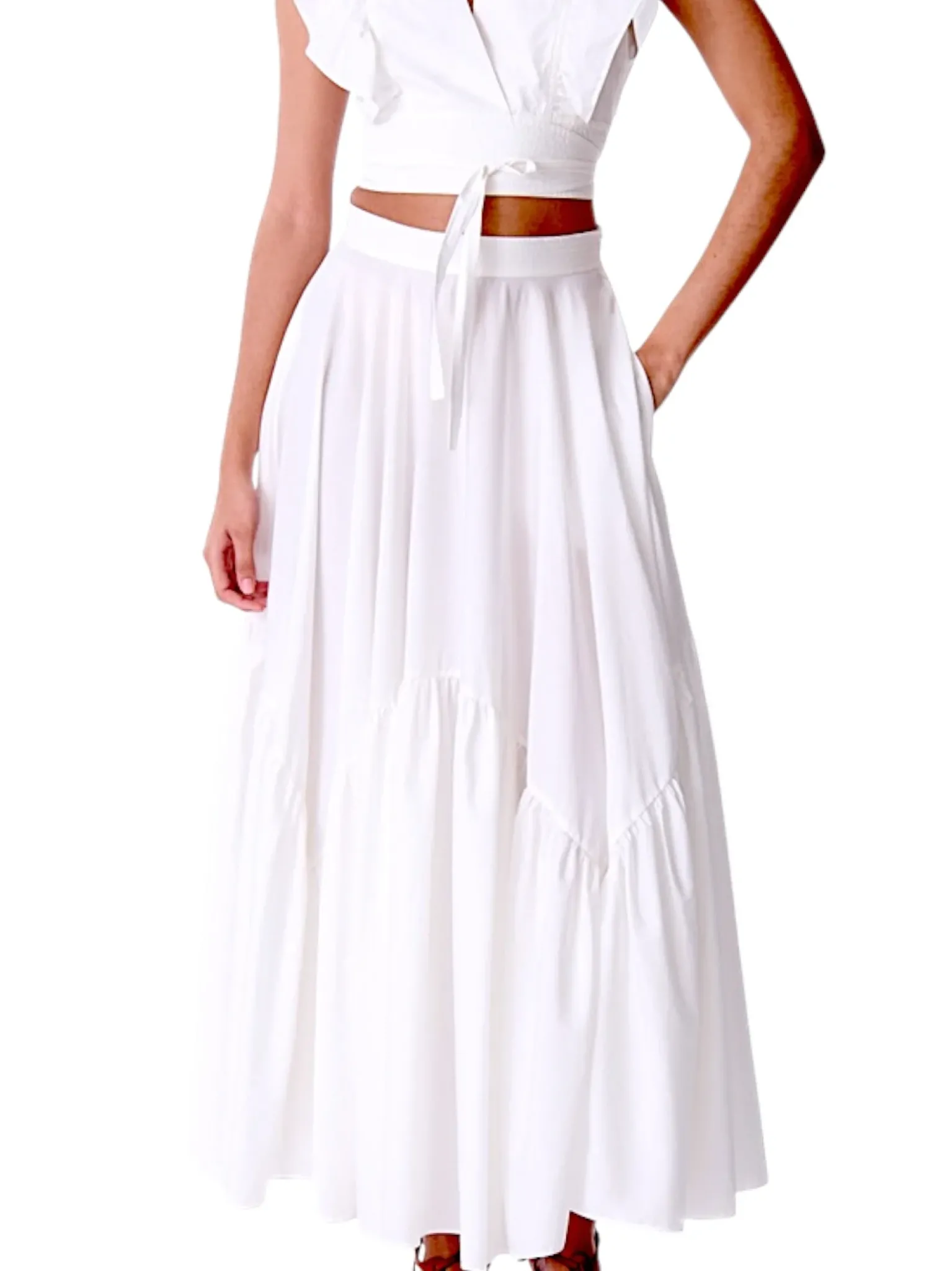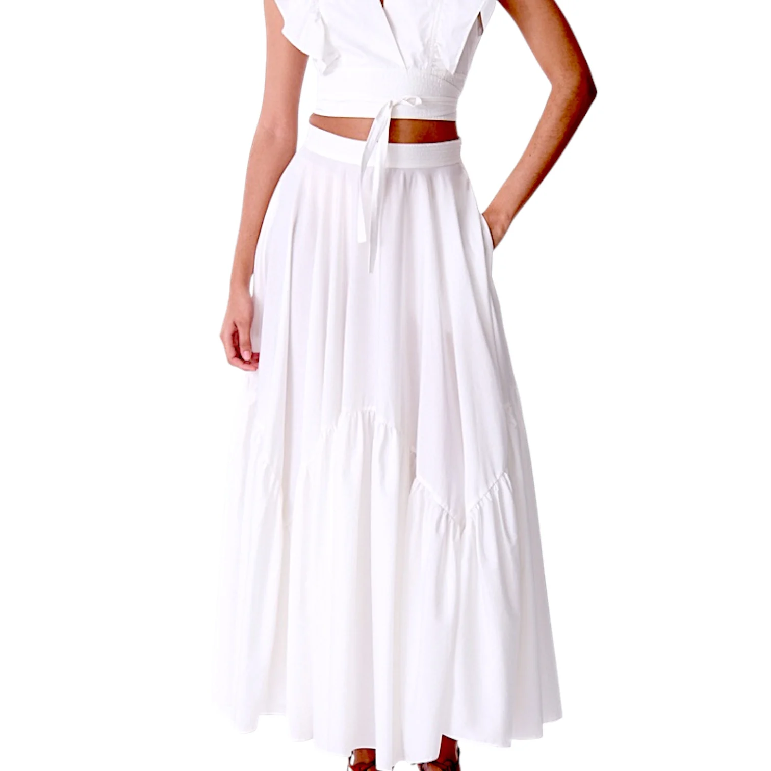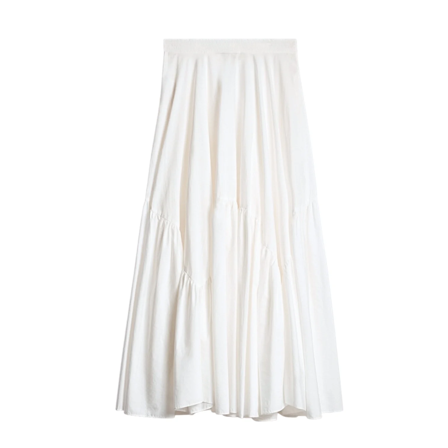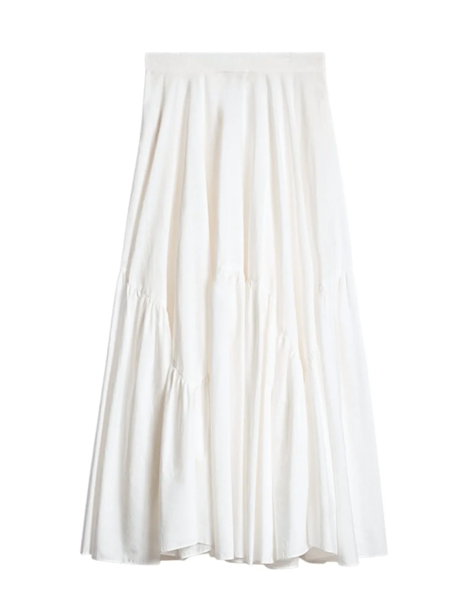 - Jupe longue, coupe évasée avec taille élastique, plis, volants