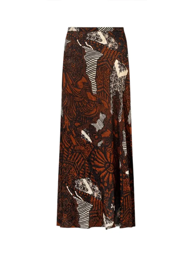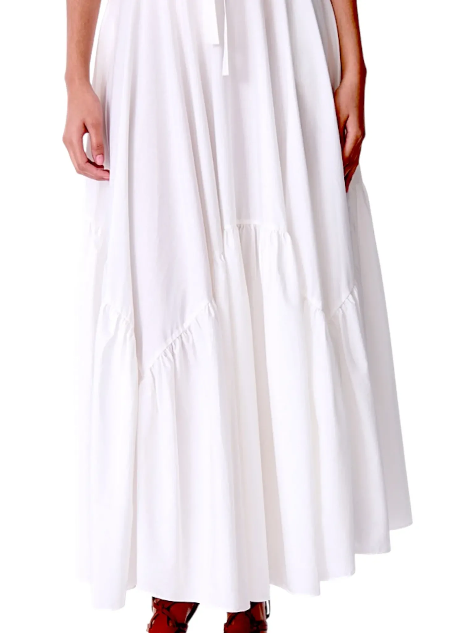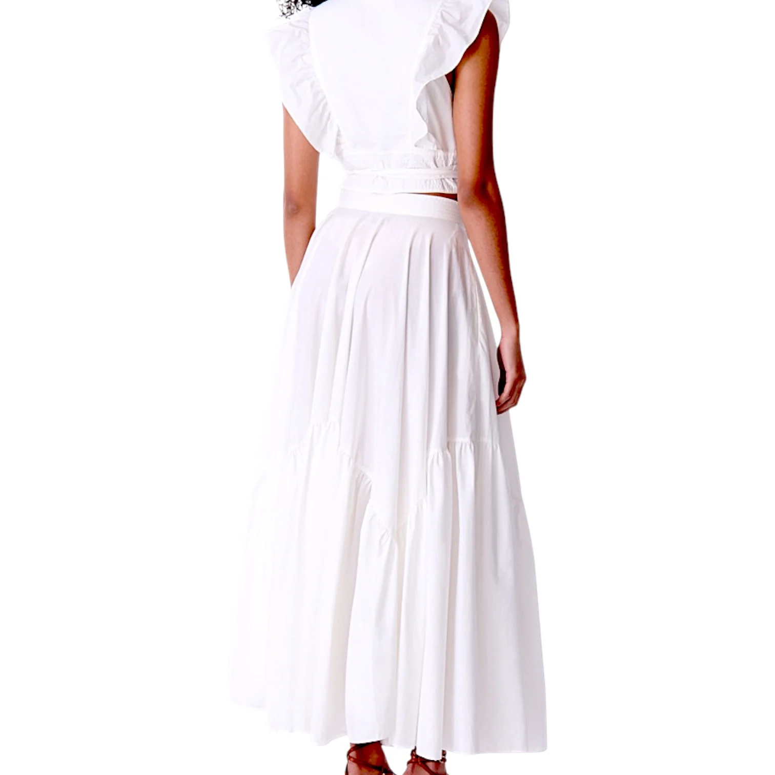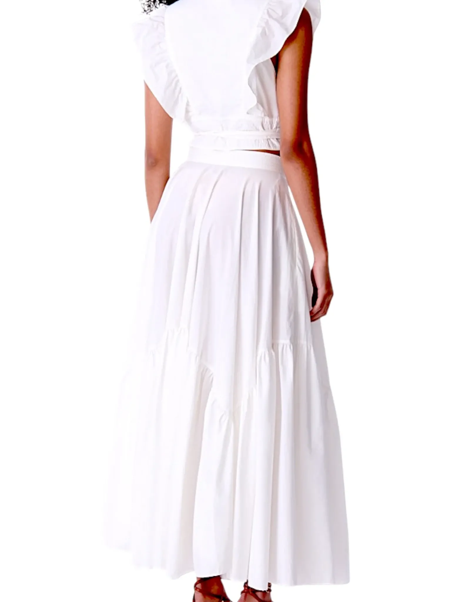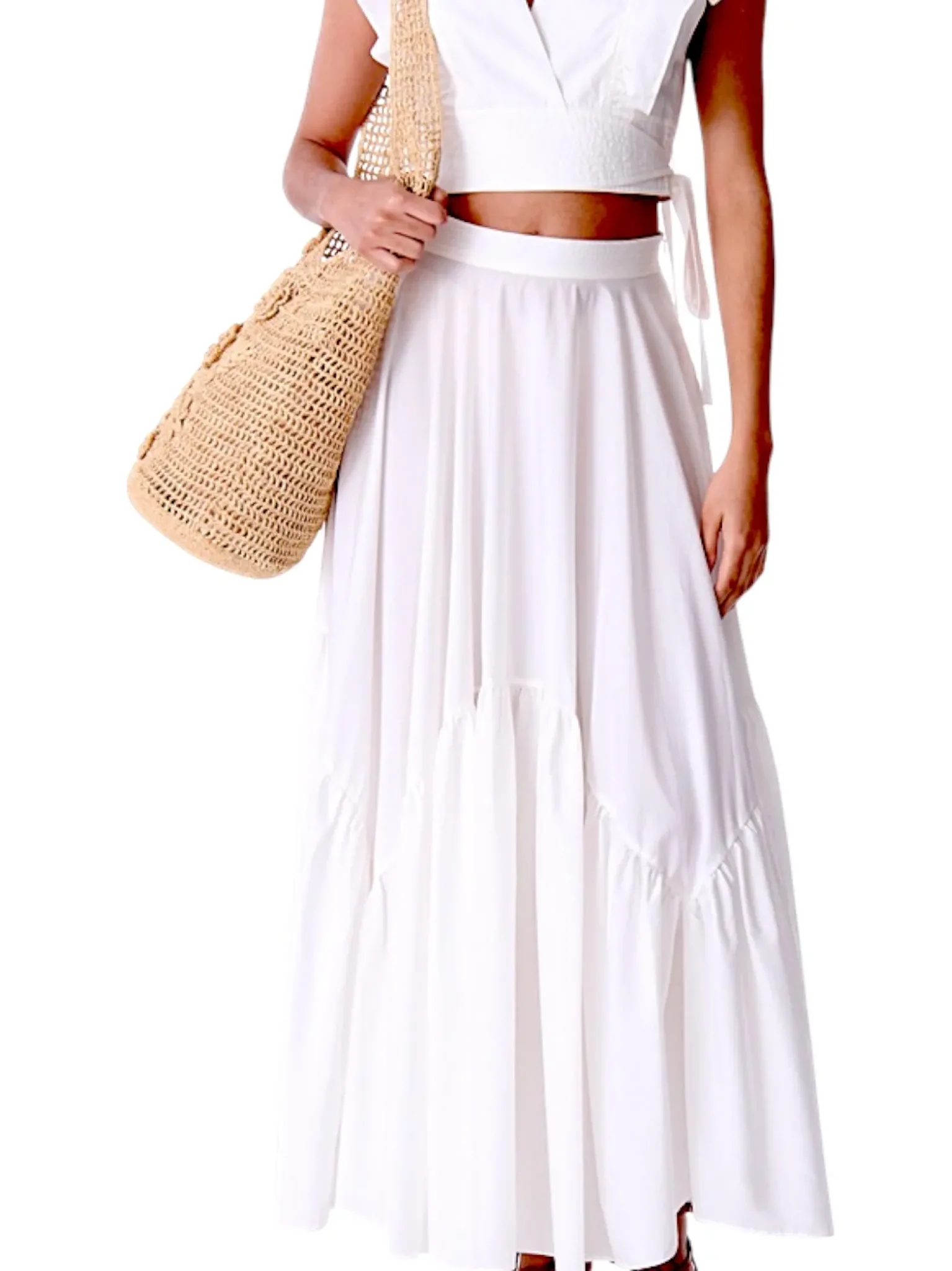 - Jupe longue, coupe évasée avec taille élastique, plis, volants