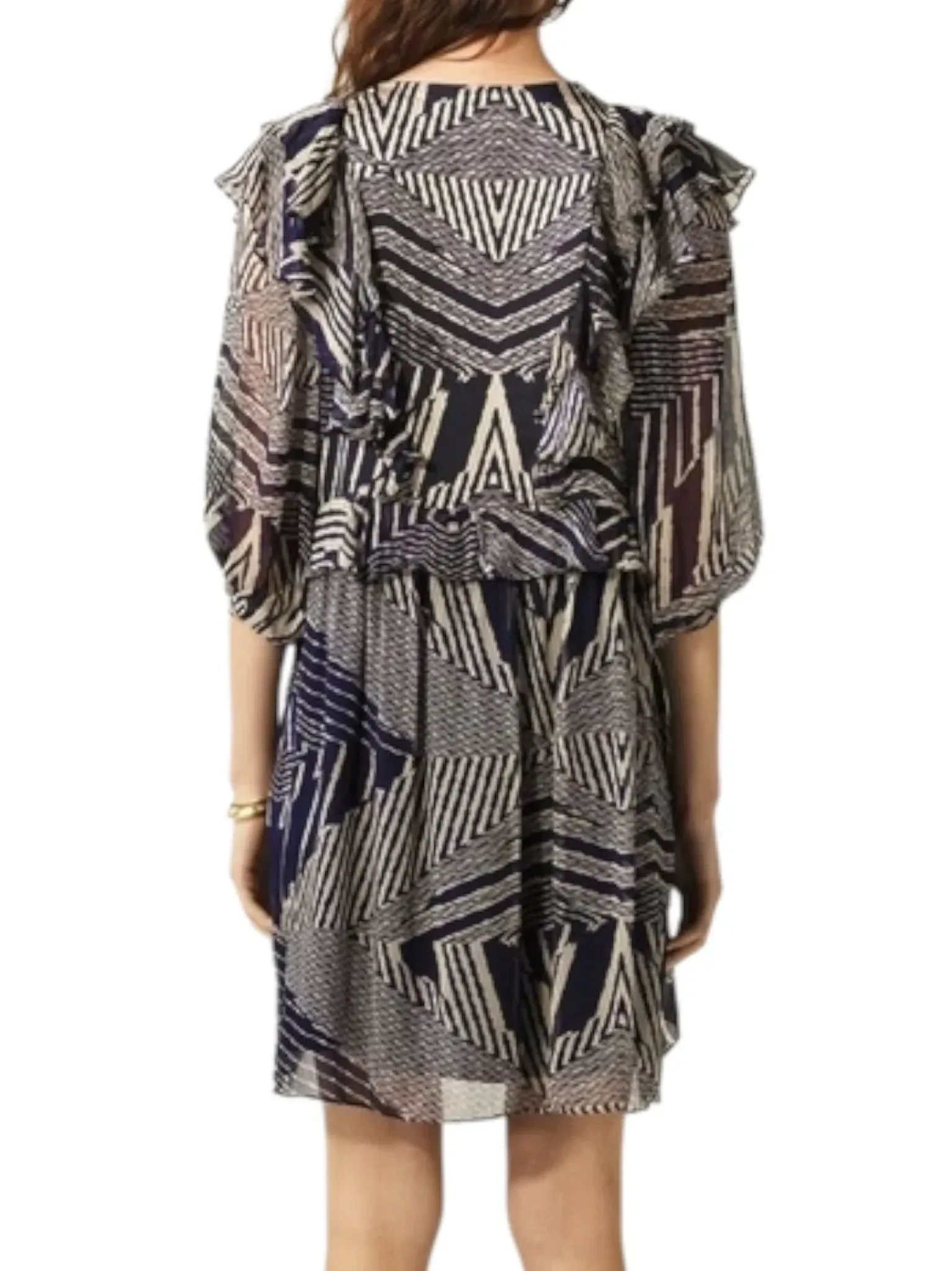 - Robe courte, manches 3/4 effets ballon, taille resserrée, détails volantés