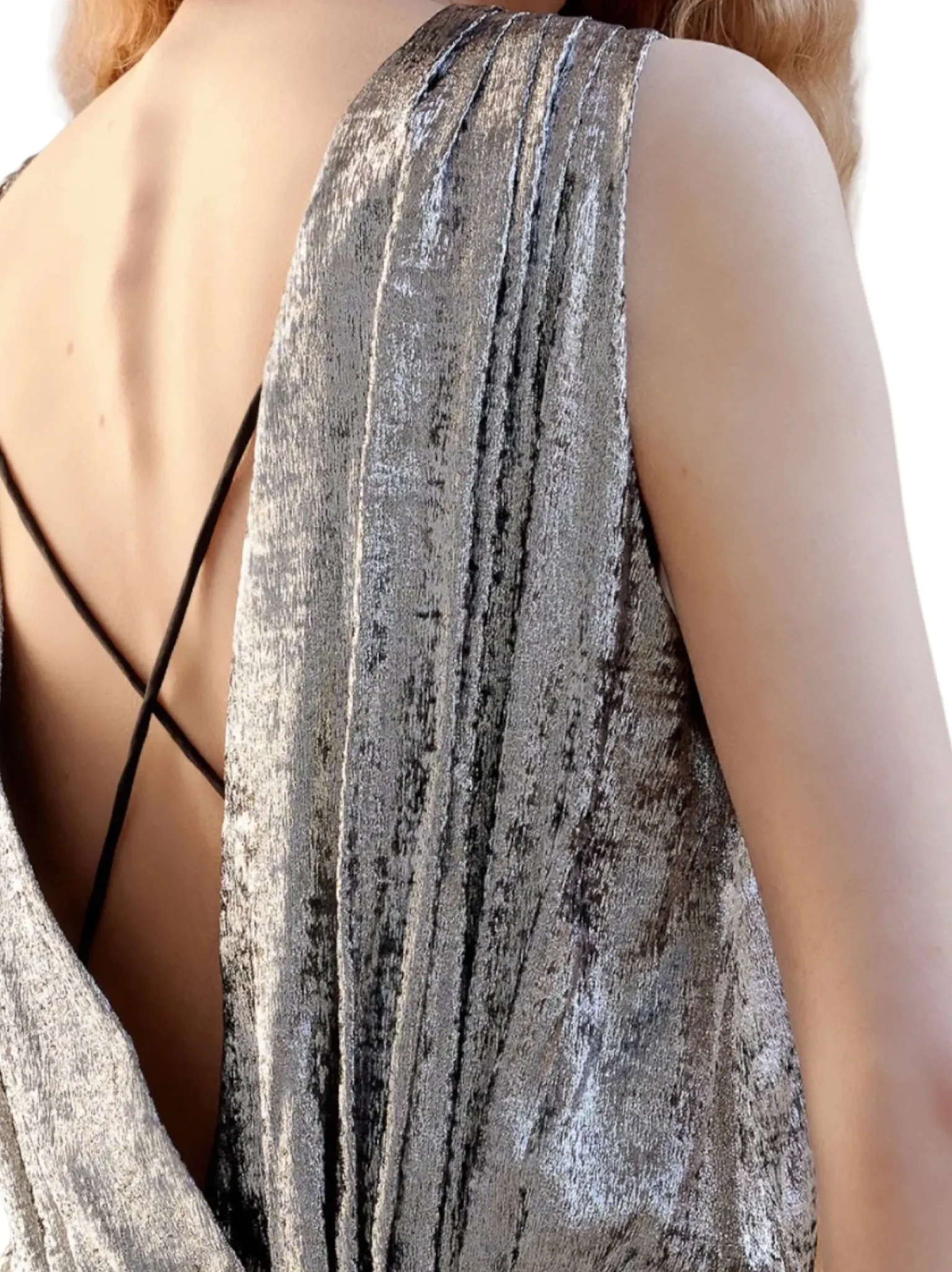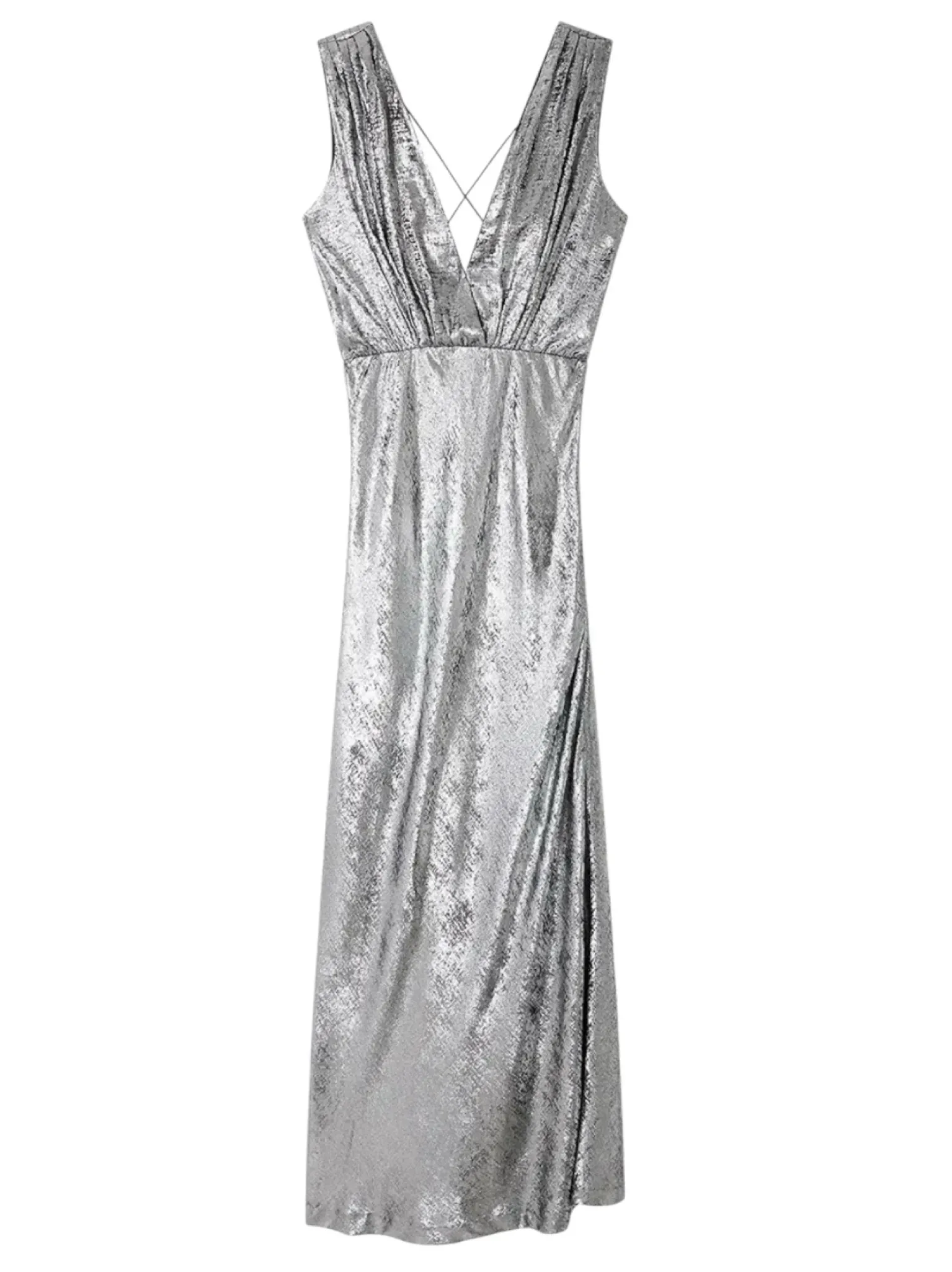 - Robe longue près du corps en tissu shiny velvet argent, coupe près du corps, décolleté drapé