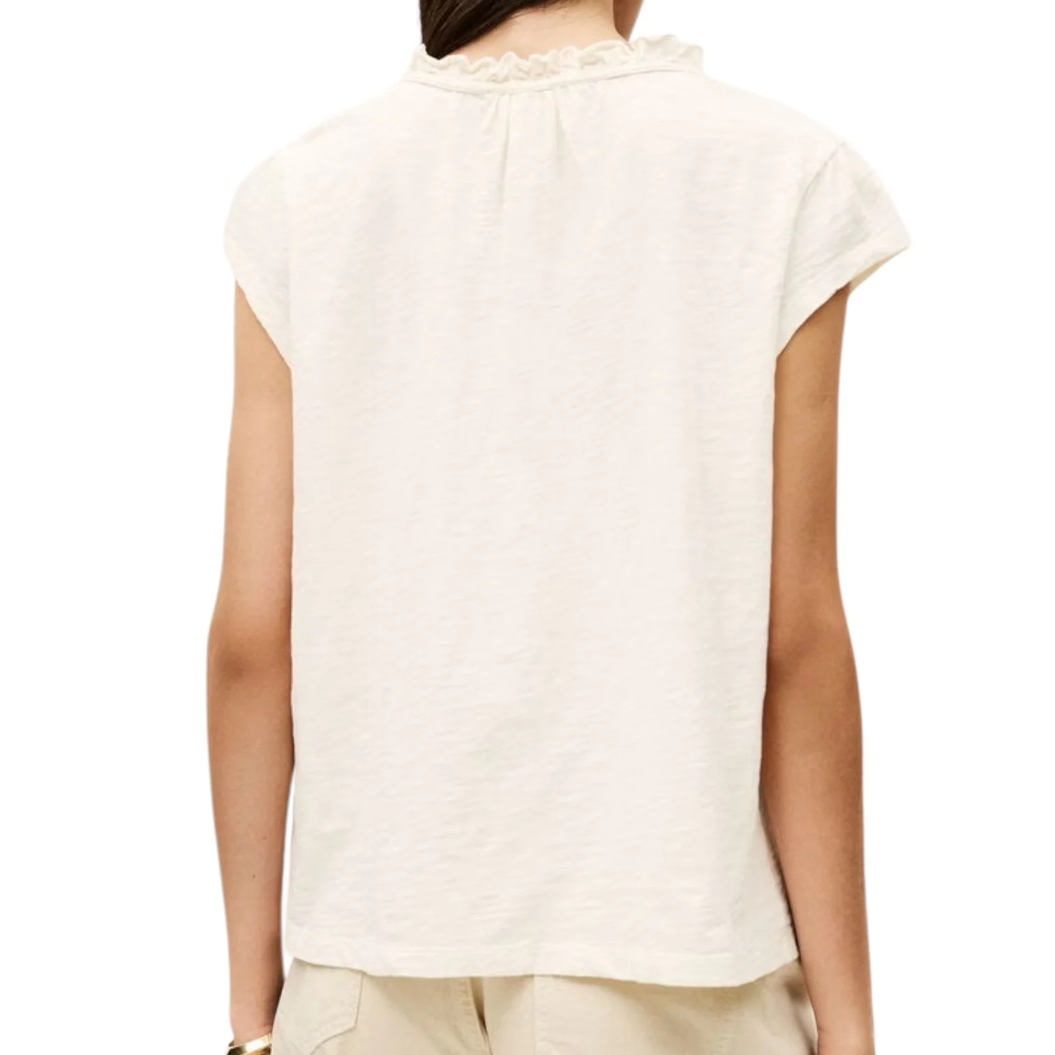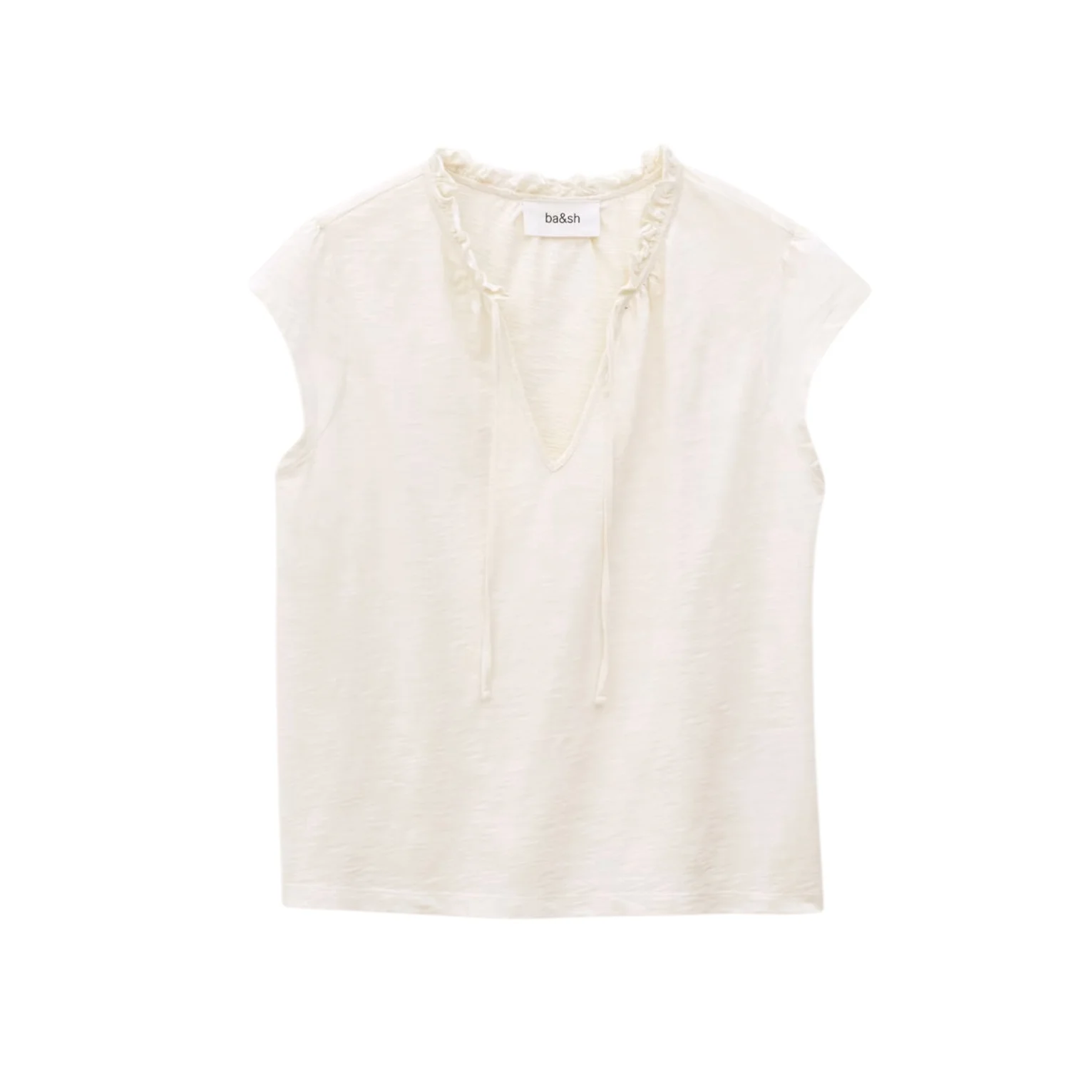 - Encolure en V, petites manches volantées, col froncé avec détail volanté, lien à nouer