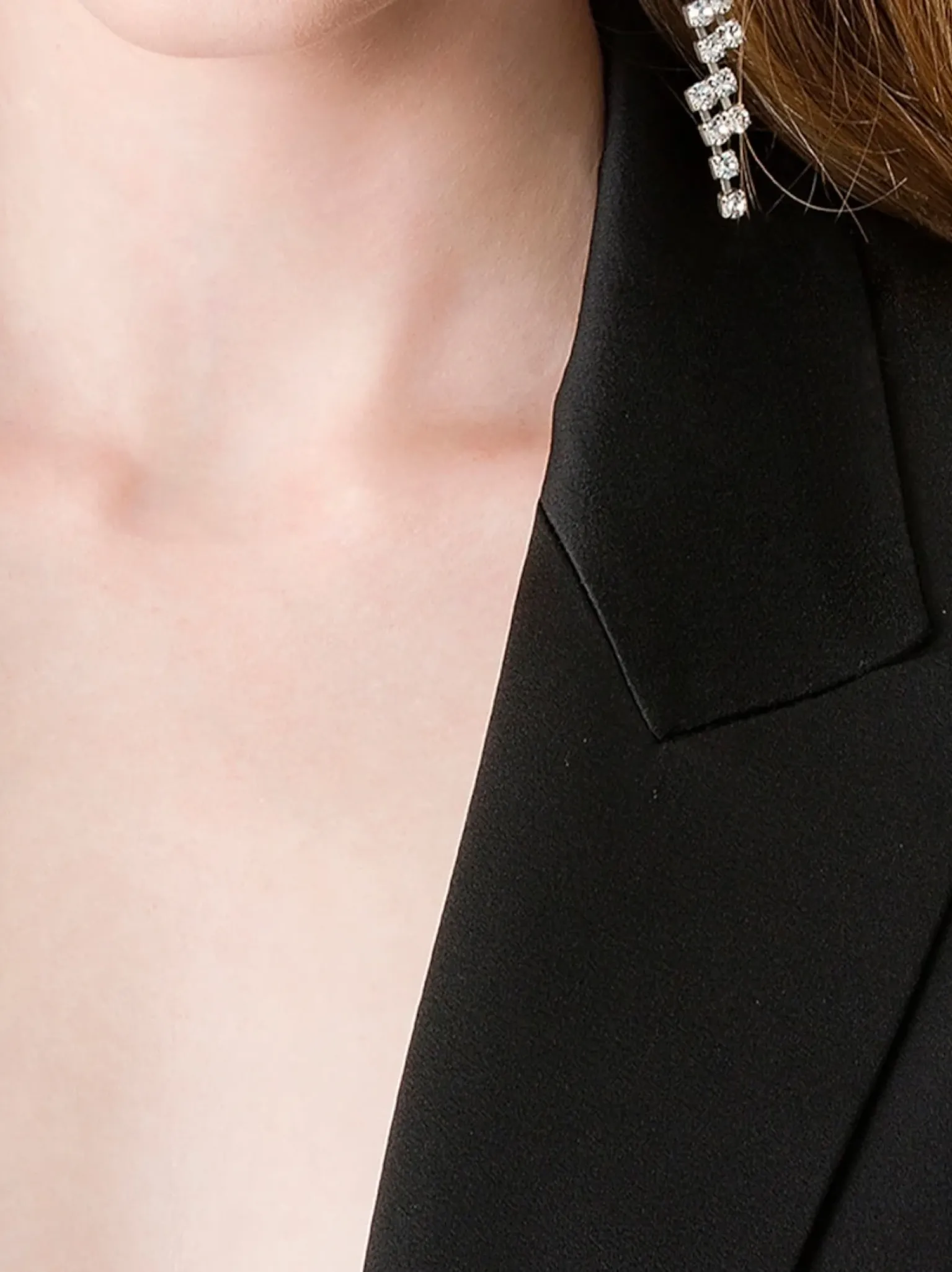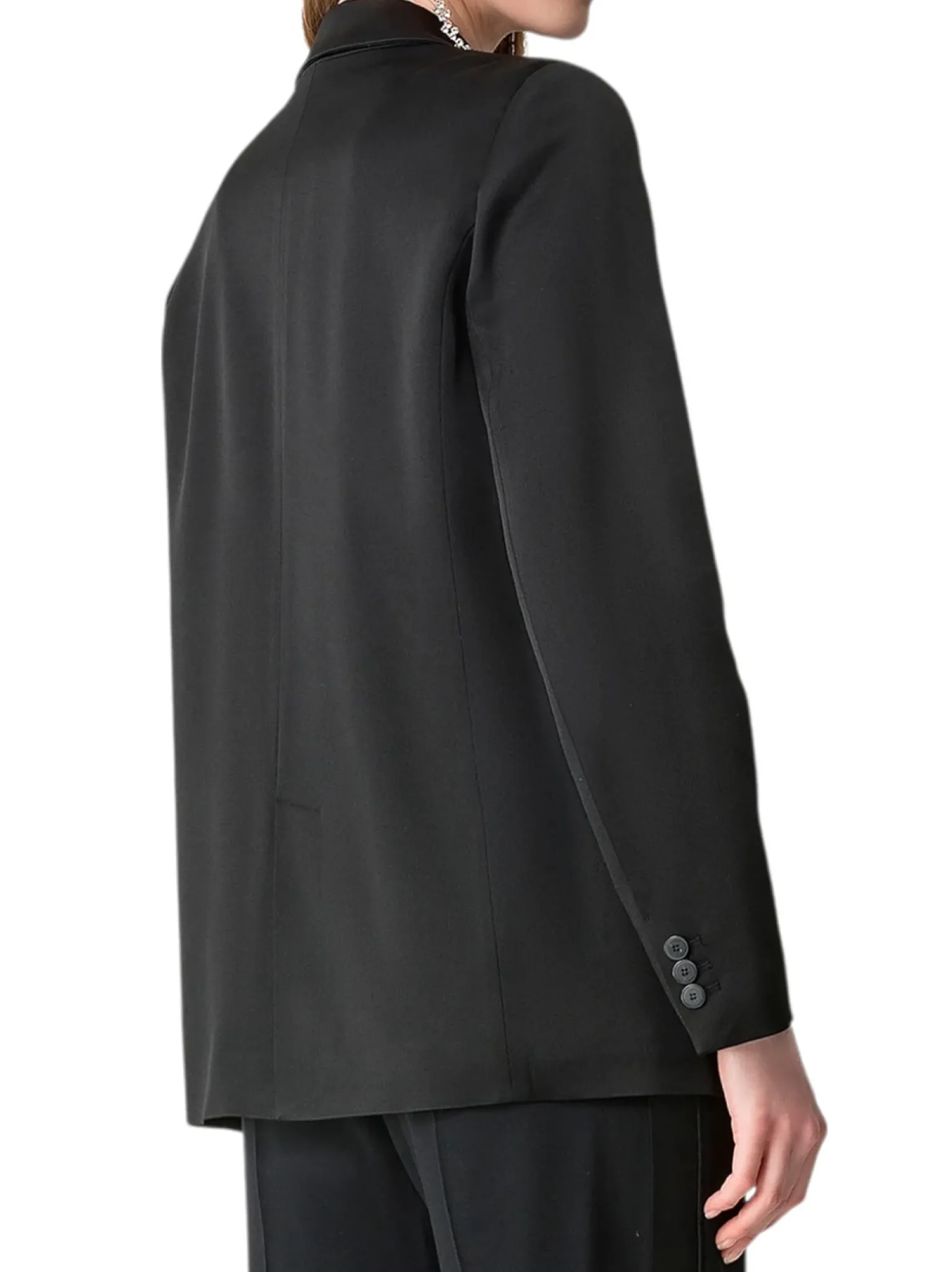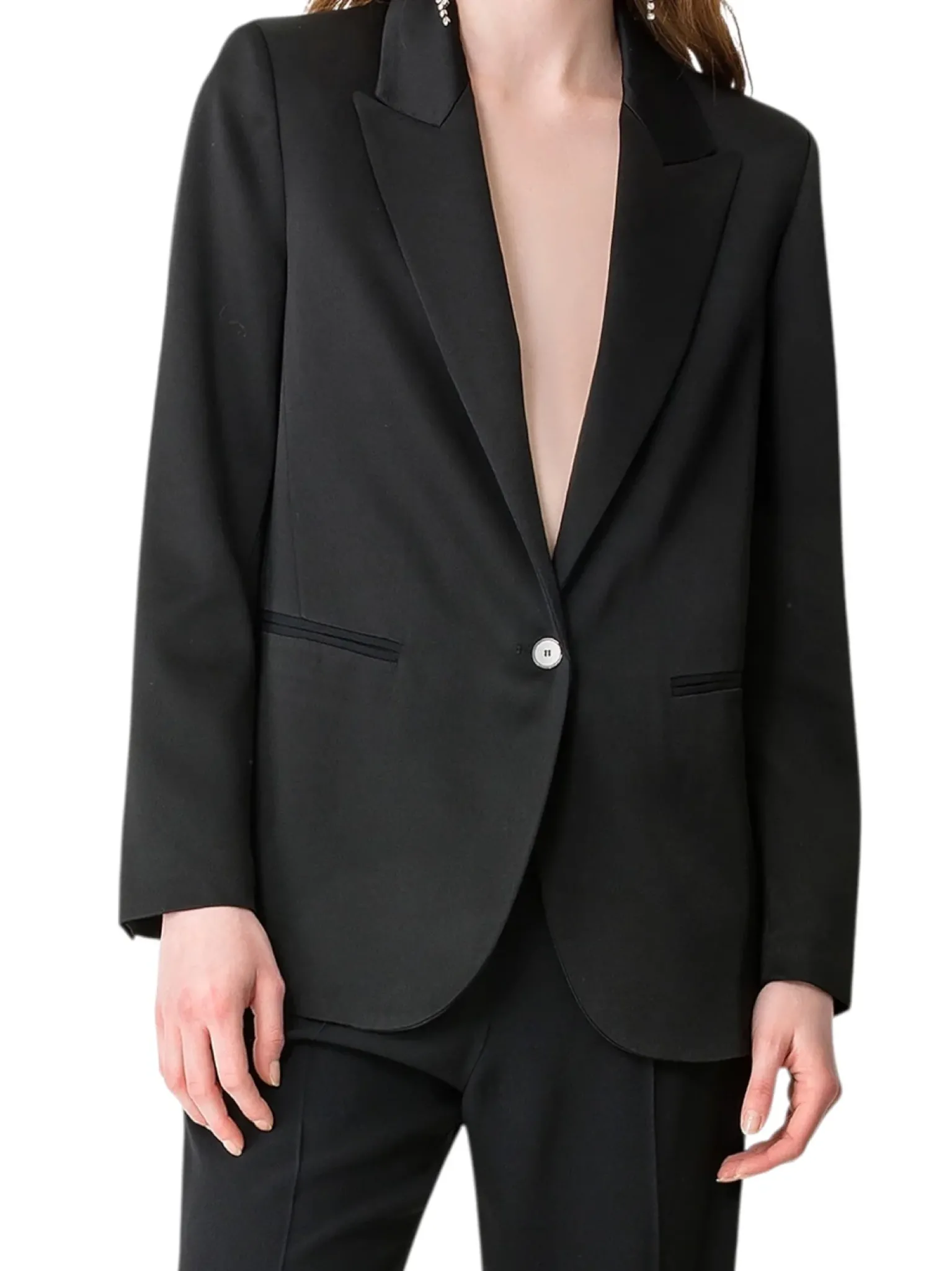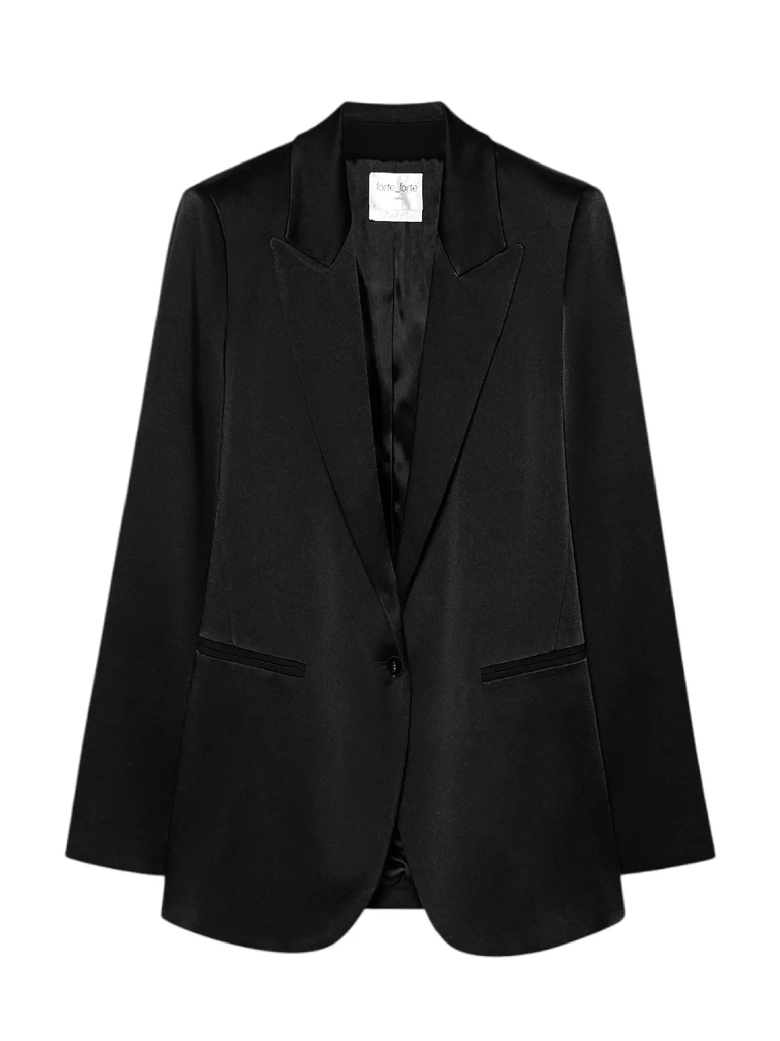 - Satin brillant, col à revers en pointe, fermeture un bouton