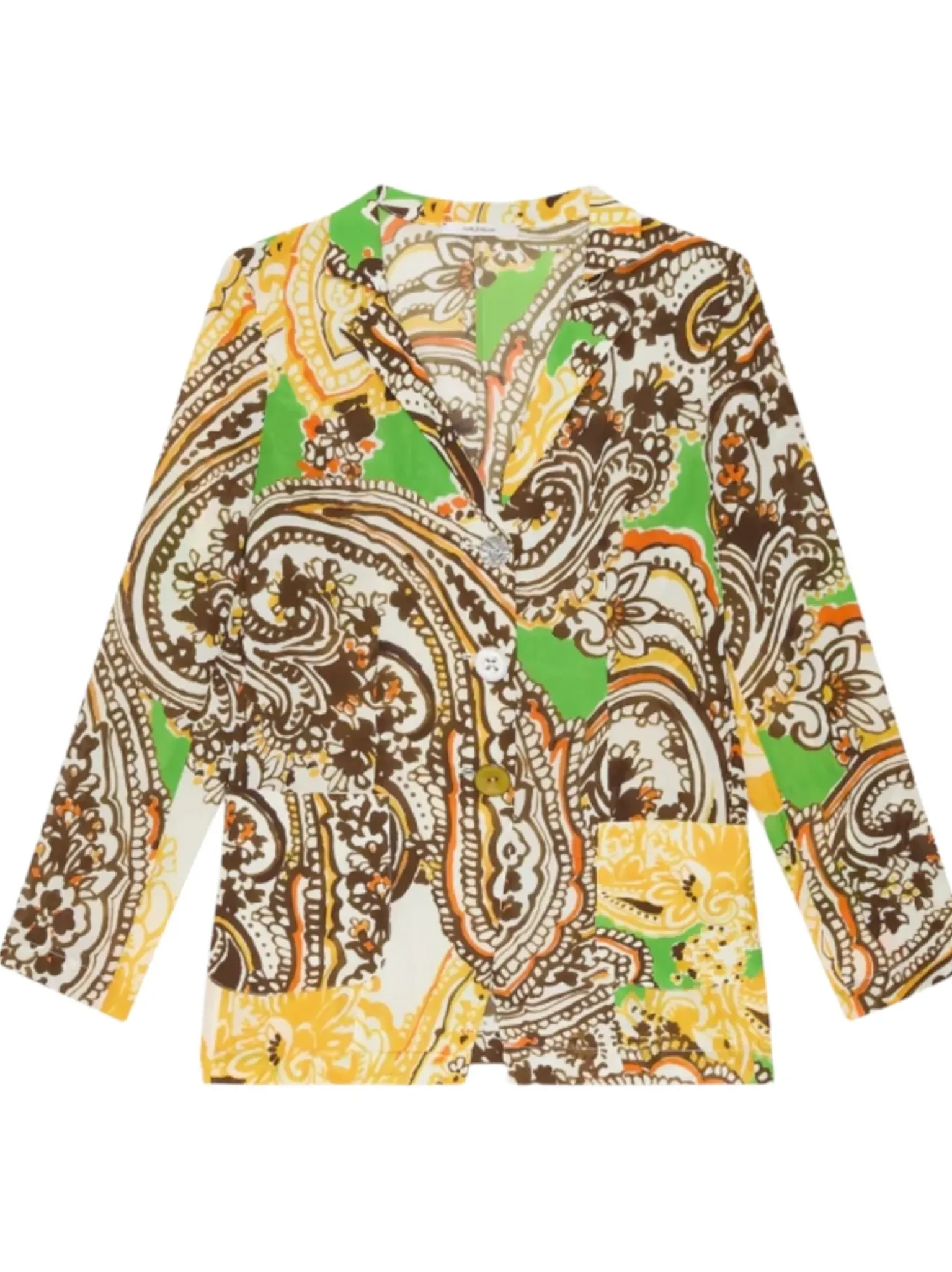 - Dans une danse de douceur et de couleurs, cette veste-chemise en charmeuse de viscose imprimée exprime l’élégance décontractée. Sans doublure et agrémentée d’un mélange de boutons spéciaux, c’est le choix parfait pour celles qui aiment compléter leur look avec des pièces uniques, à l’instar de véritables œuvres d’art.