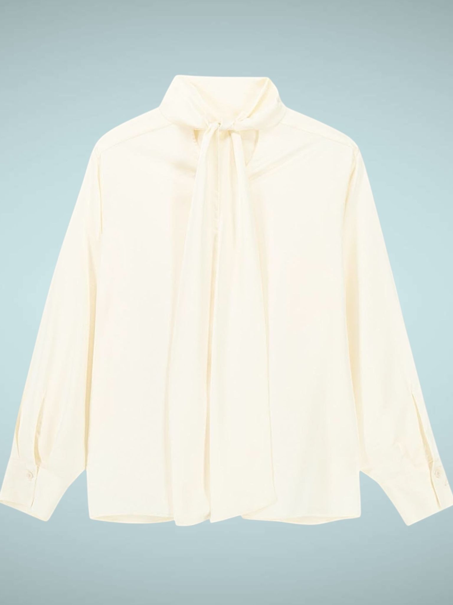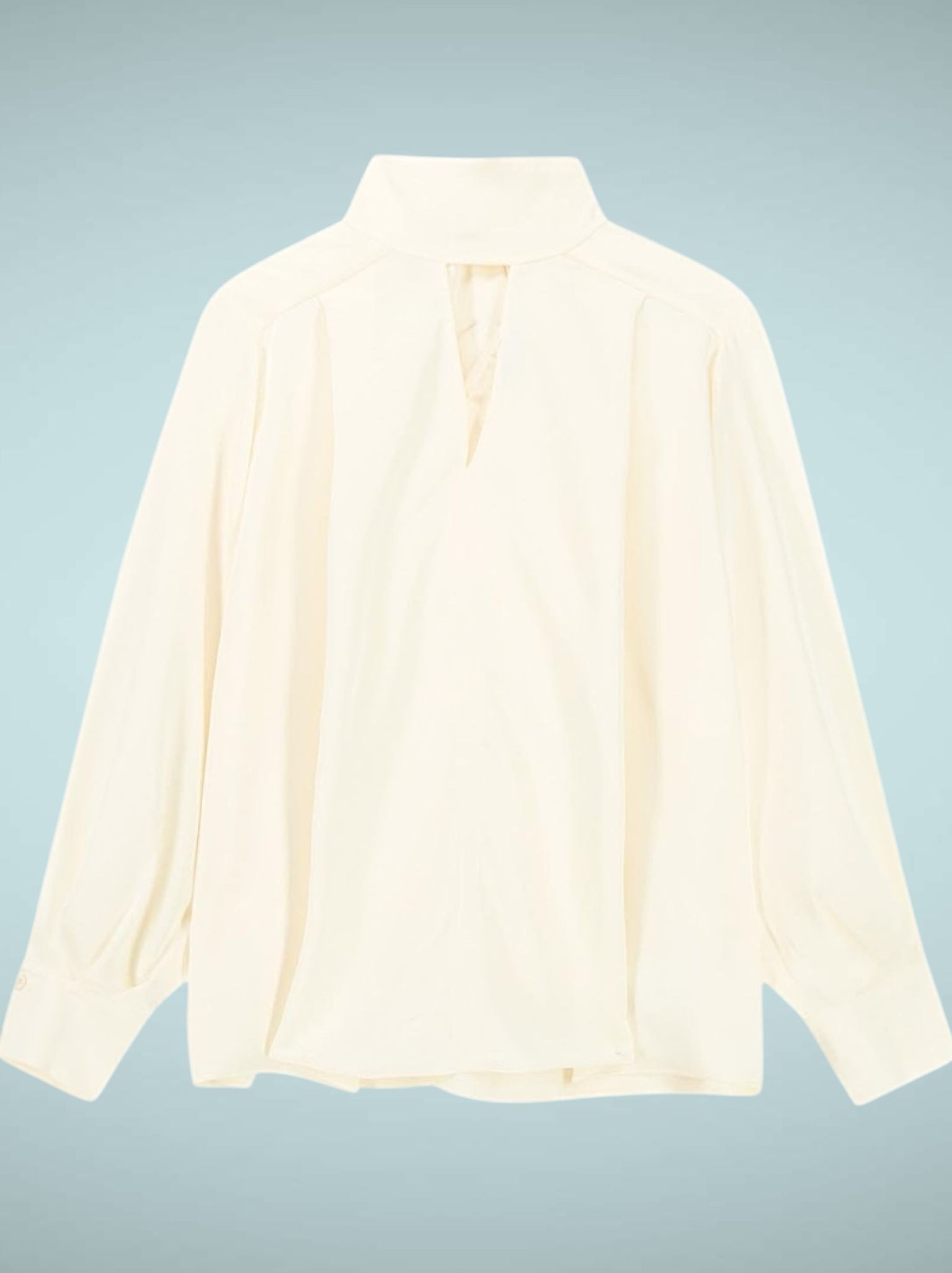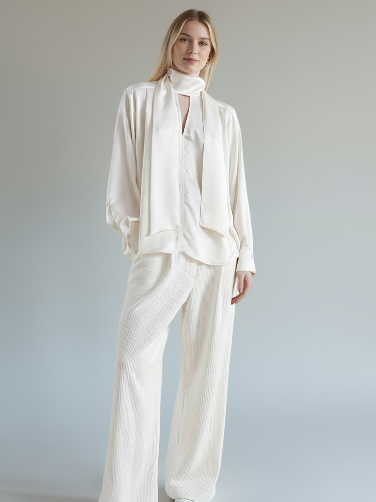 - Encolure fendue sur l’avant, col grand foulard intégré (ou lavallière)