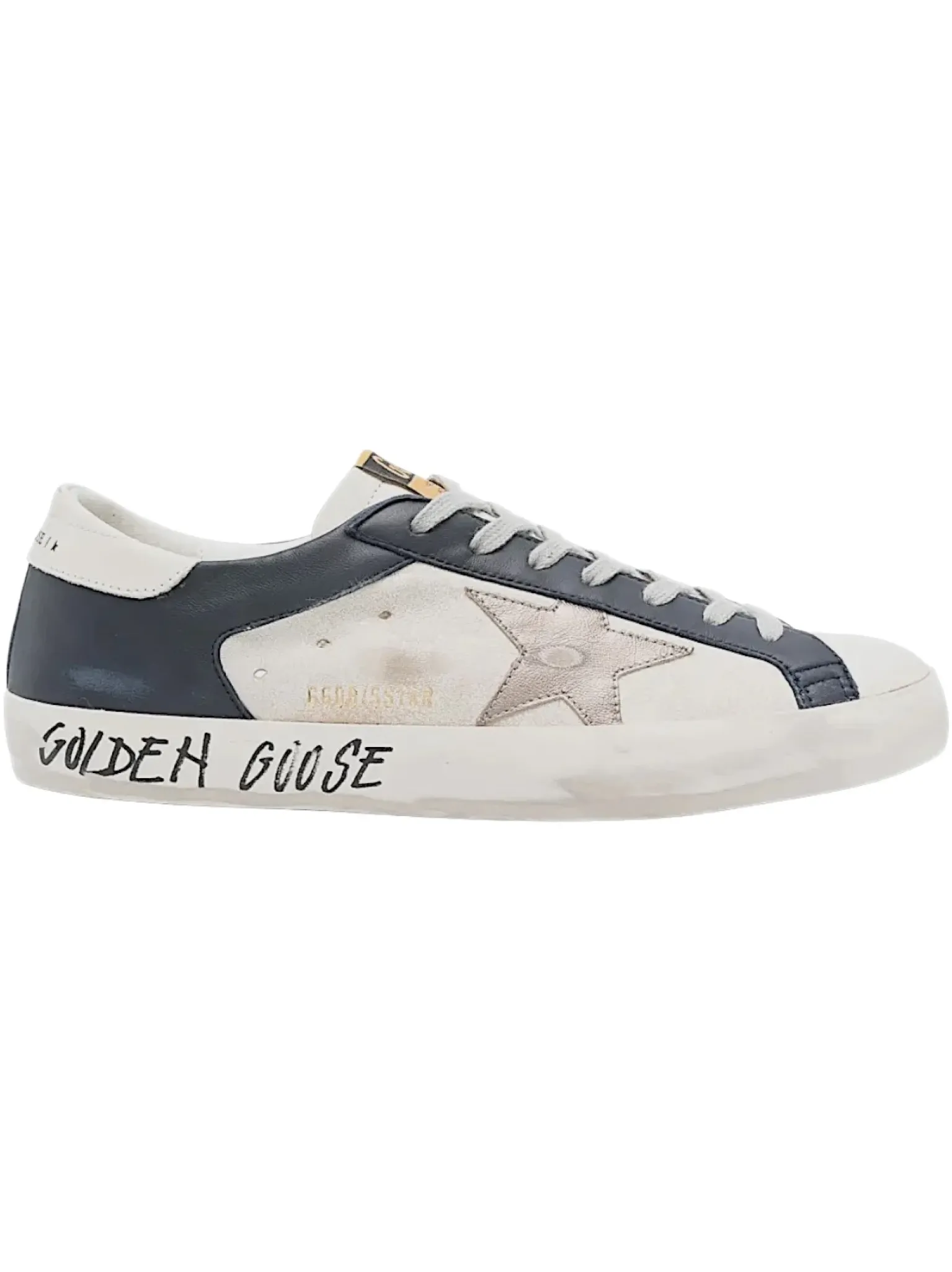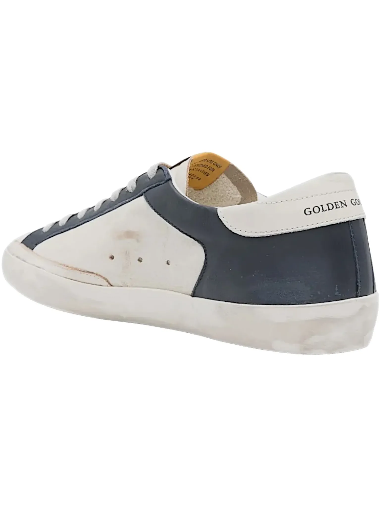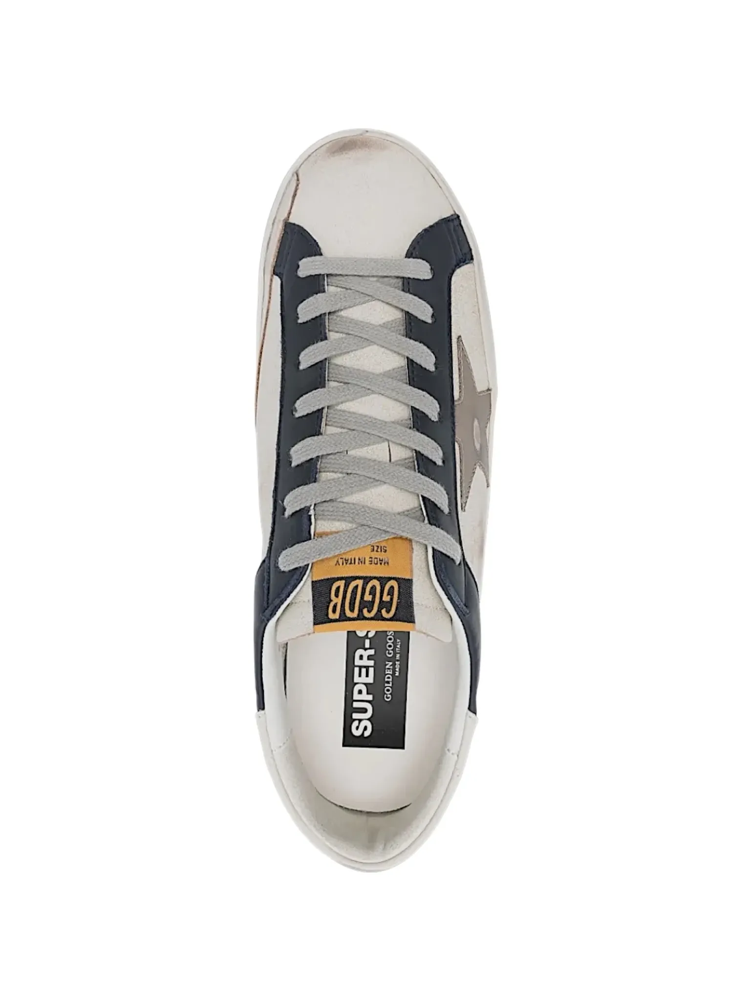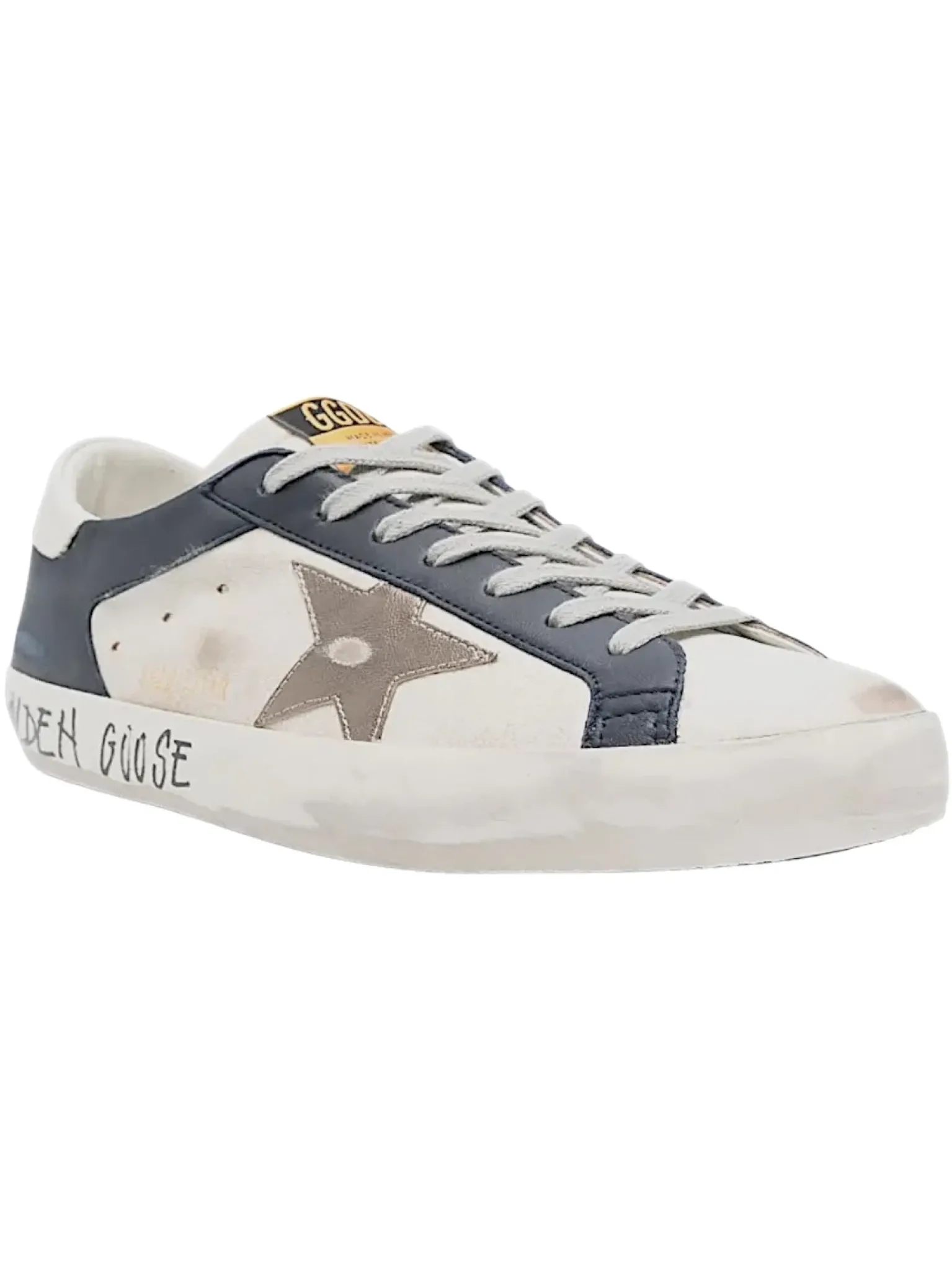 - Cuir blanc et bleu, lacets gris, un patch étoile or vieilli, effet usé par endroit