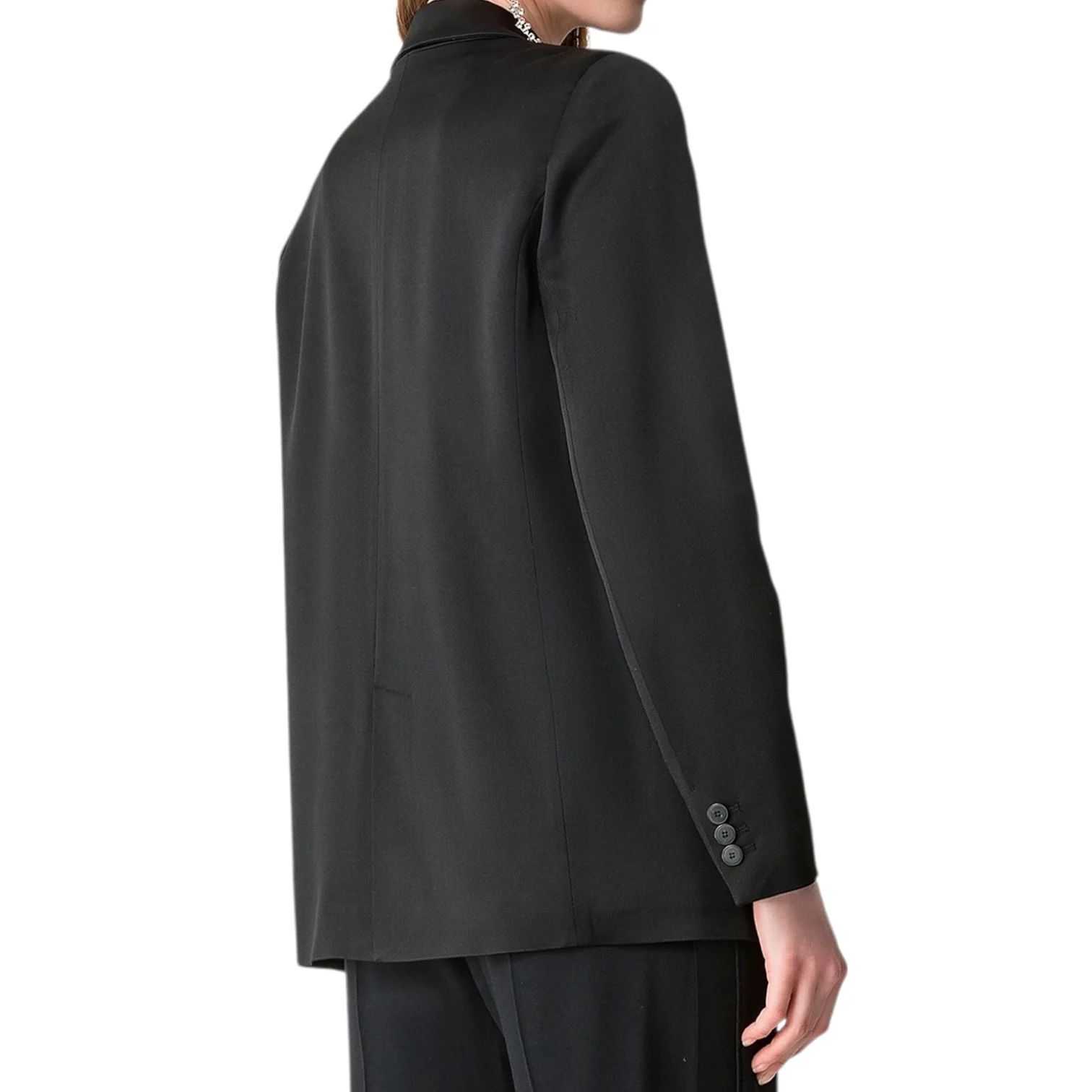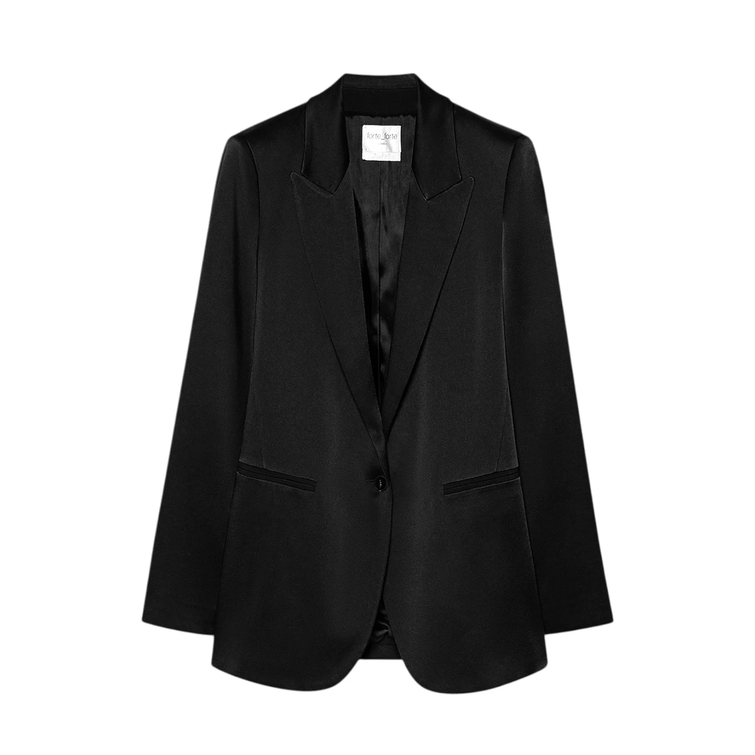 - Satin brillant, col à revers en pointe, fermeture un bouton