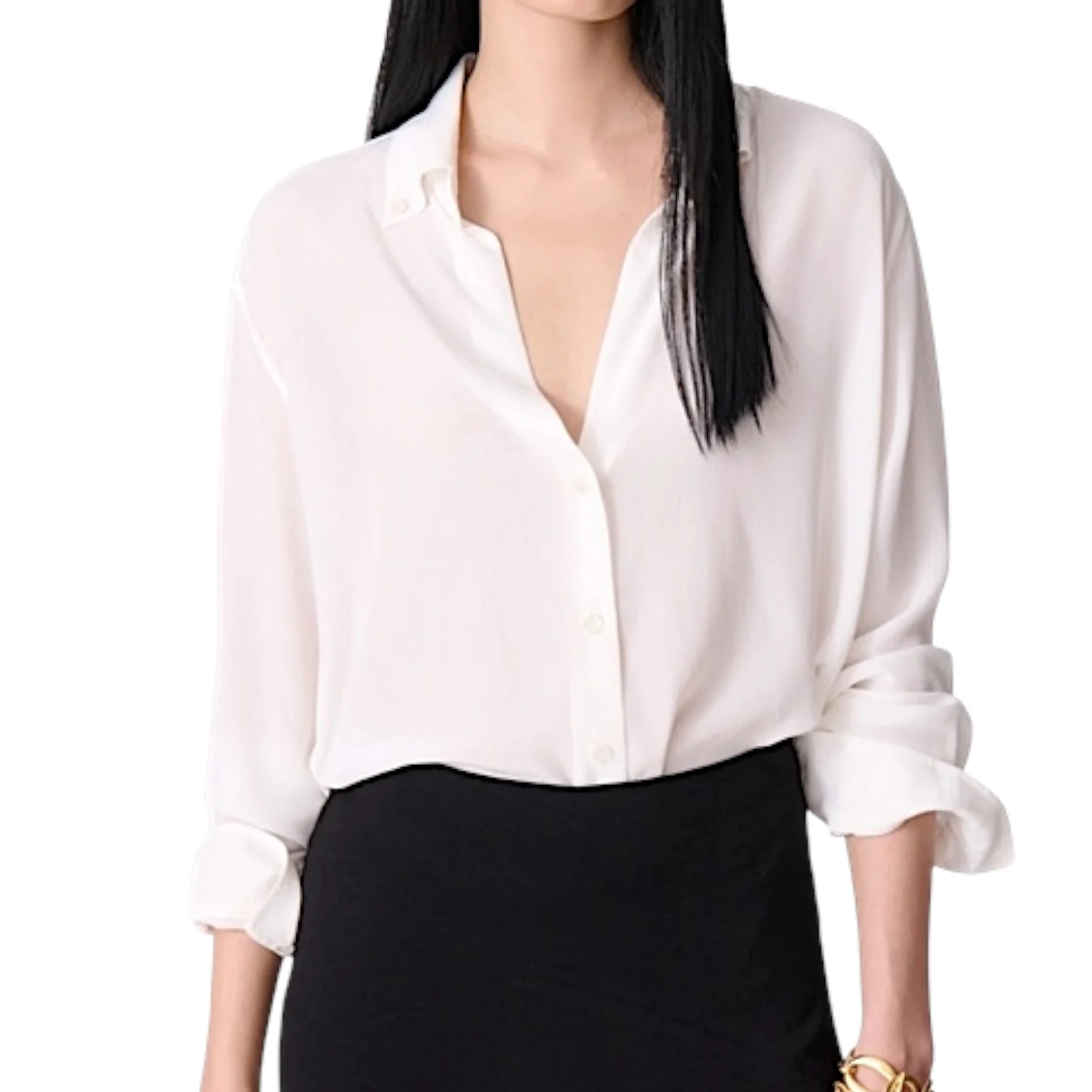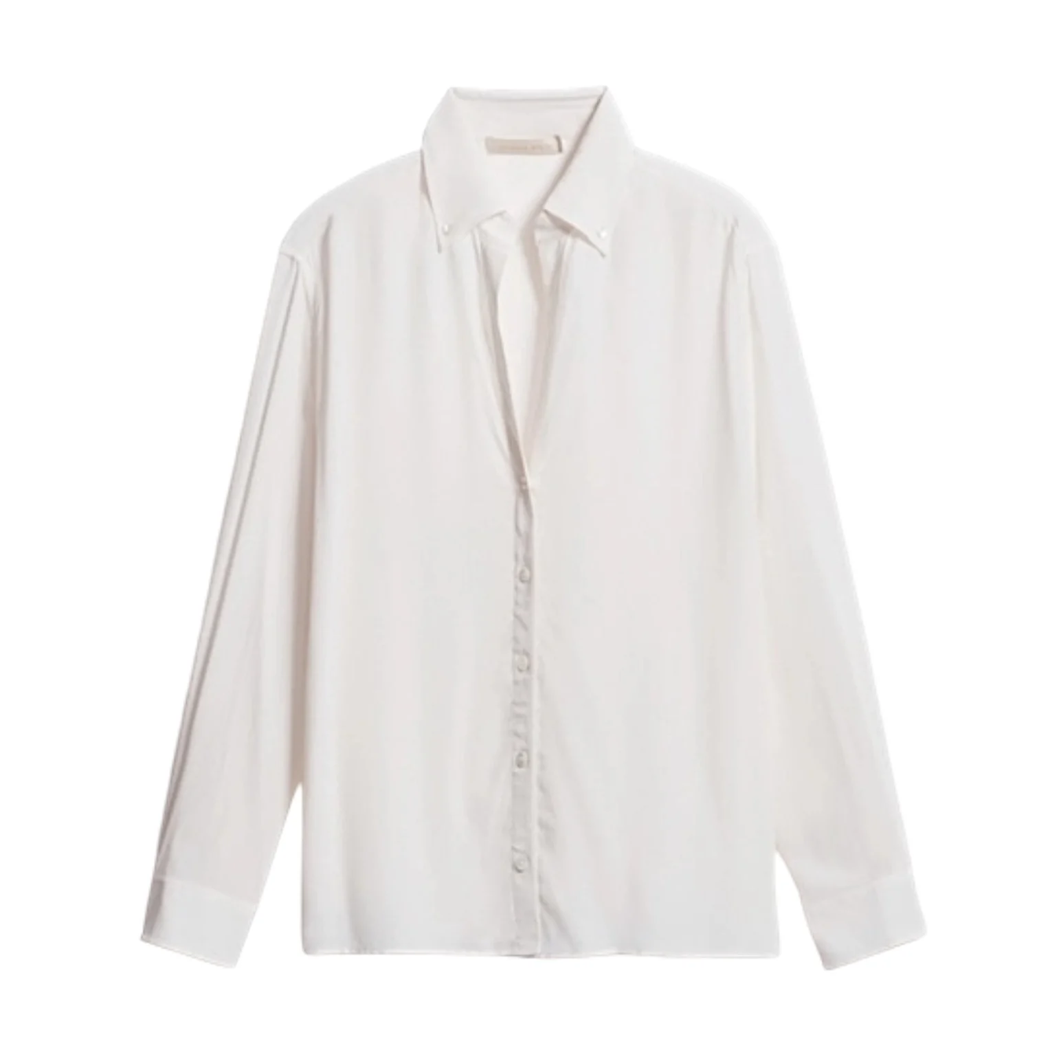- Cette pièce dont la ligne s’inspire des chemises masculines est cependant dotée d’une patte de boutonnage qui ne court pas jusqu’au col et lui confère ainsi une allure féminine.