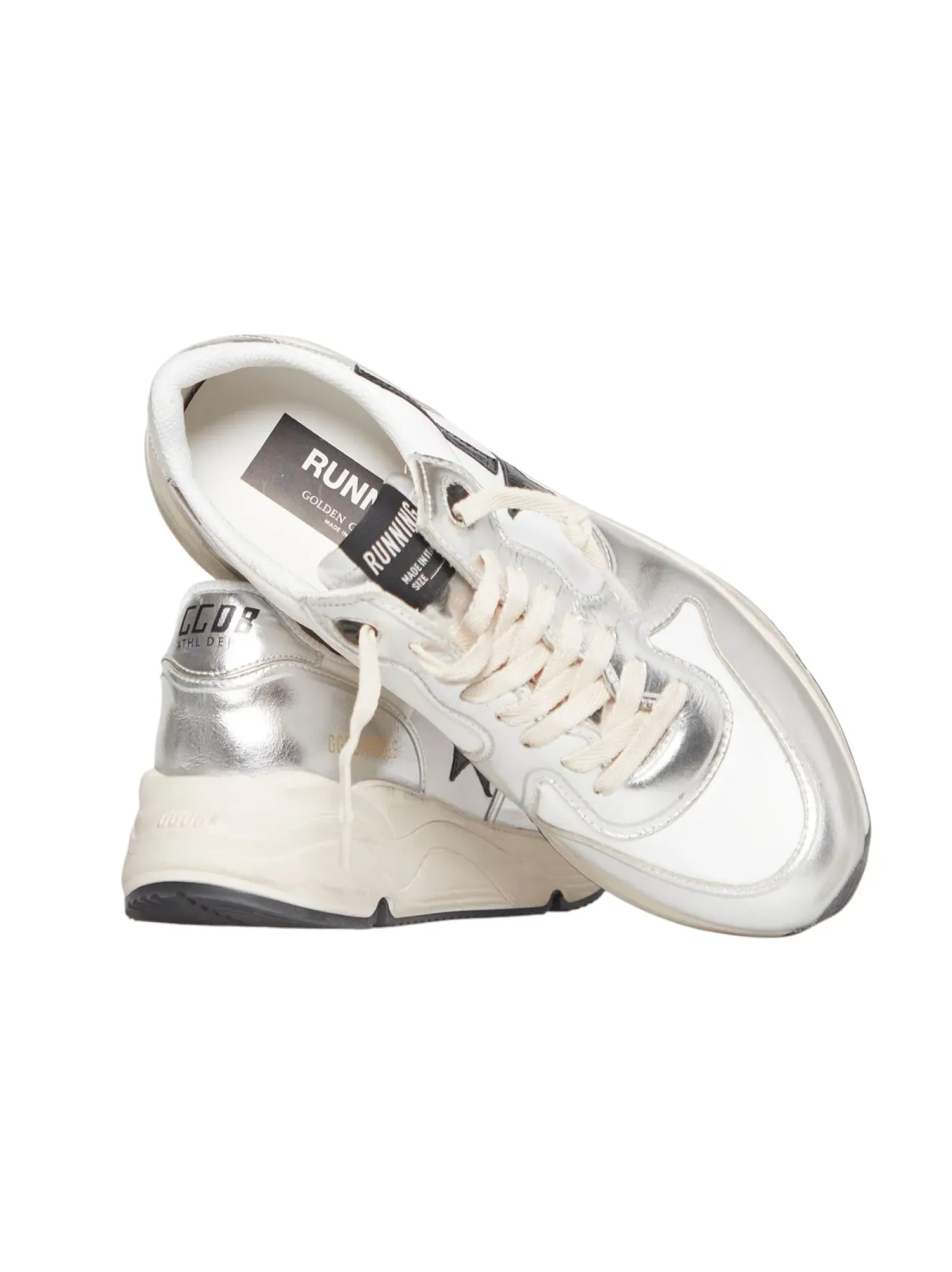 - Baskets running multi matière, blancs et argent, empiècement étoile en cuir noir