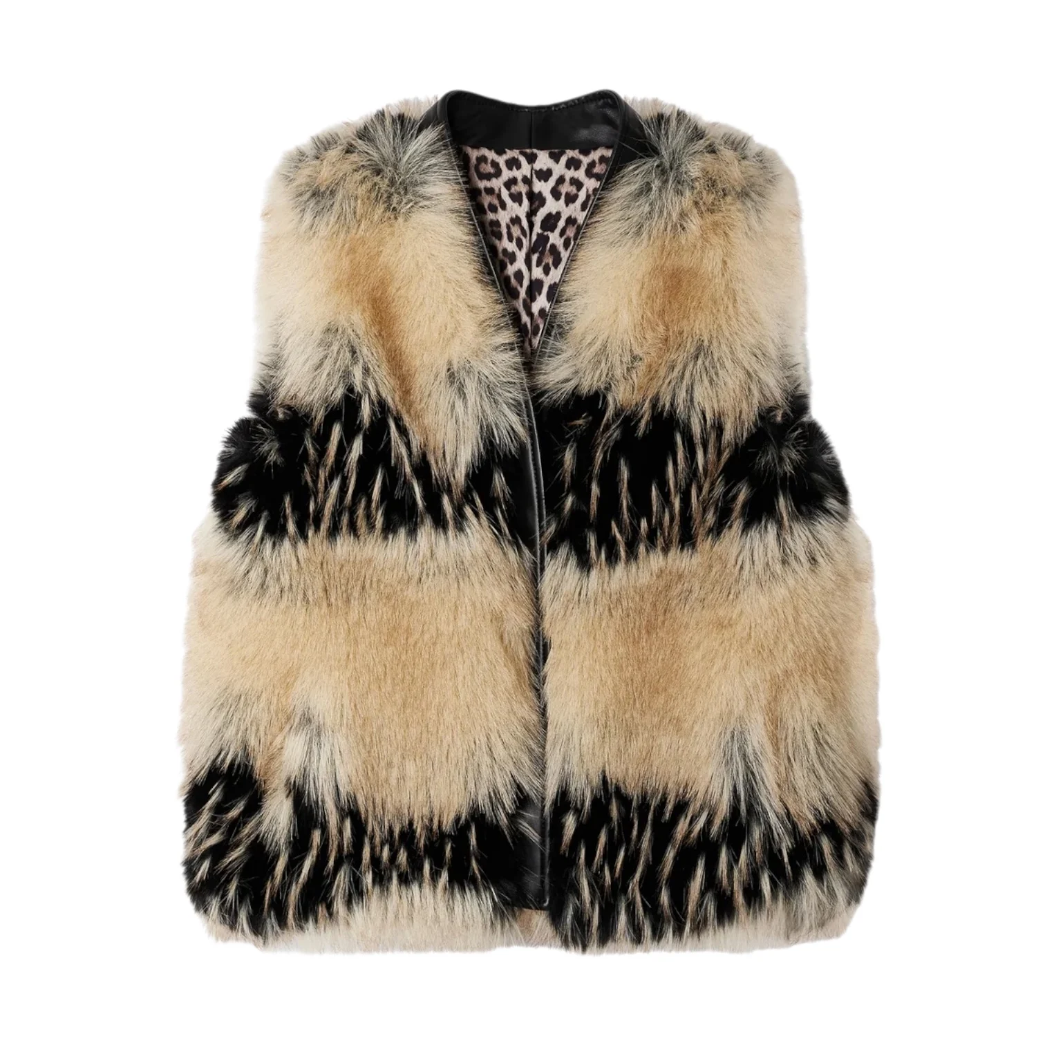 - Gilet sans manches à la coupe droite, confectionné en fausse fourrure bicolore beige et noire au visuel graphique et contrasté. Encolure en V, finition en simili cuir sur tout le contour
