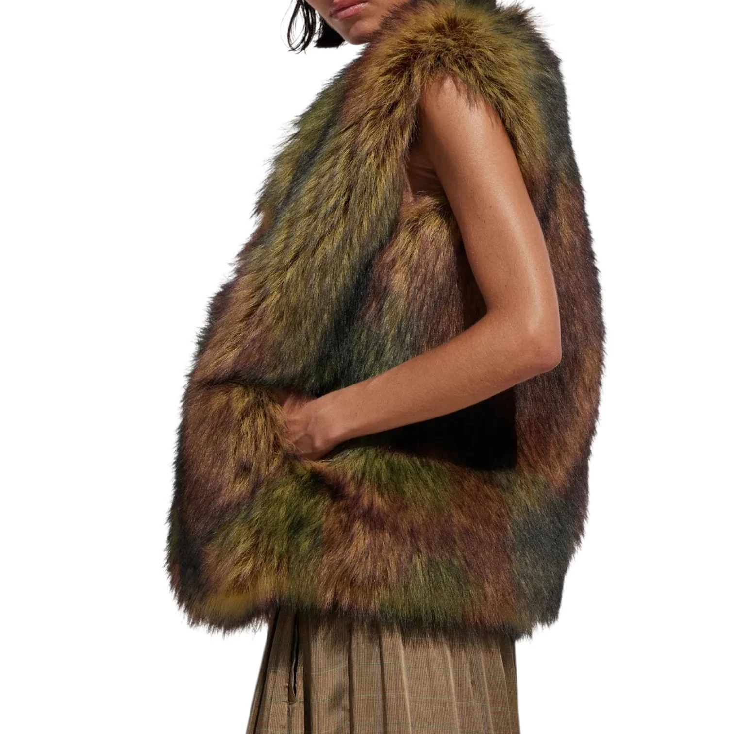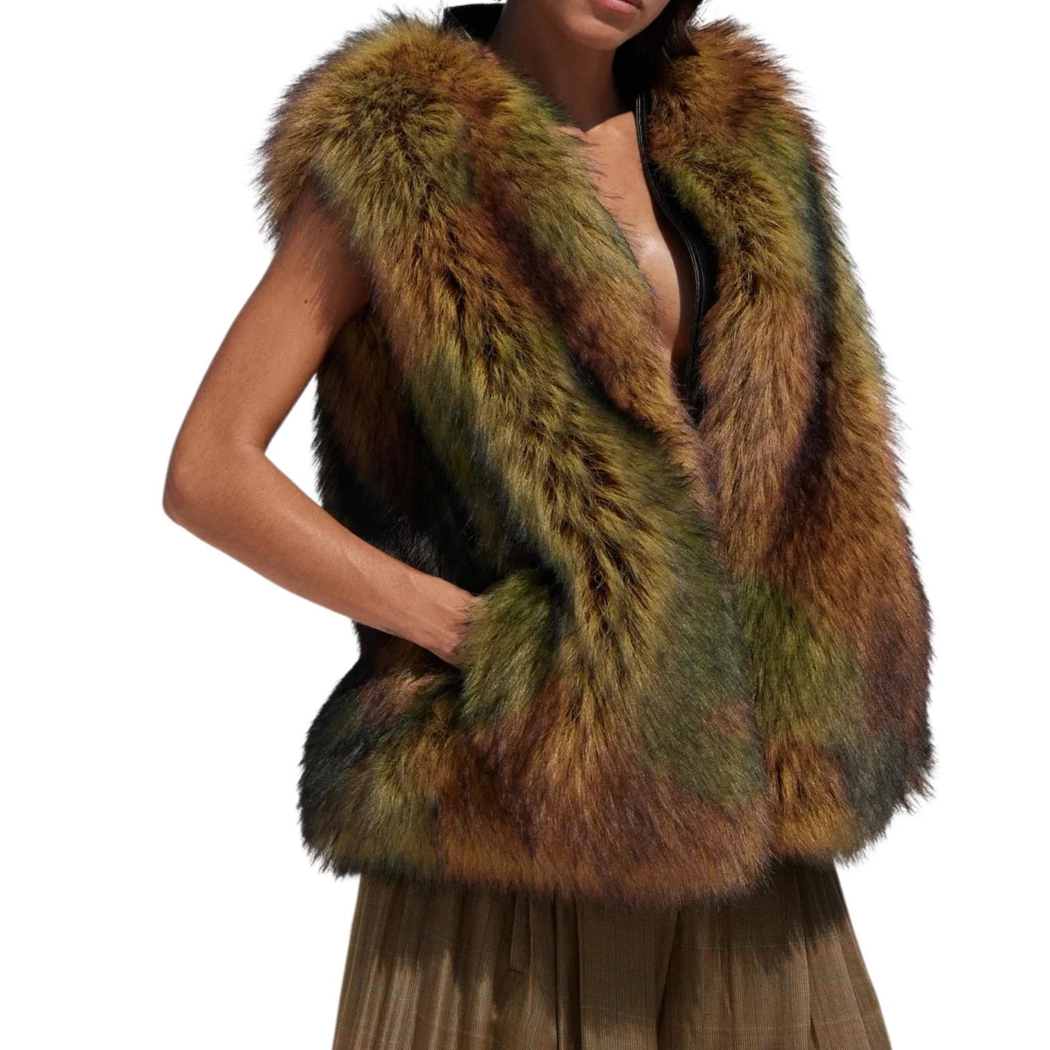 - Confectionné dans une fausse fourrure au coloris kaki aux reflets changeants, sans manches, coupe courte, doublure imprimée léopard, poches latérales
