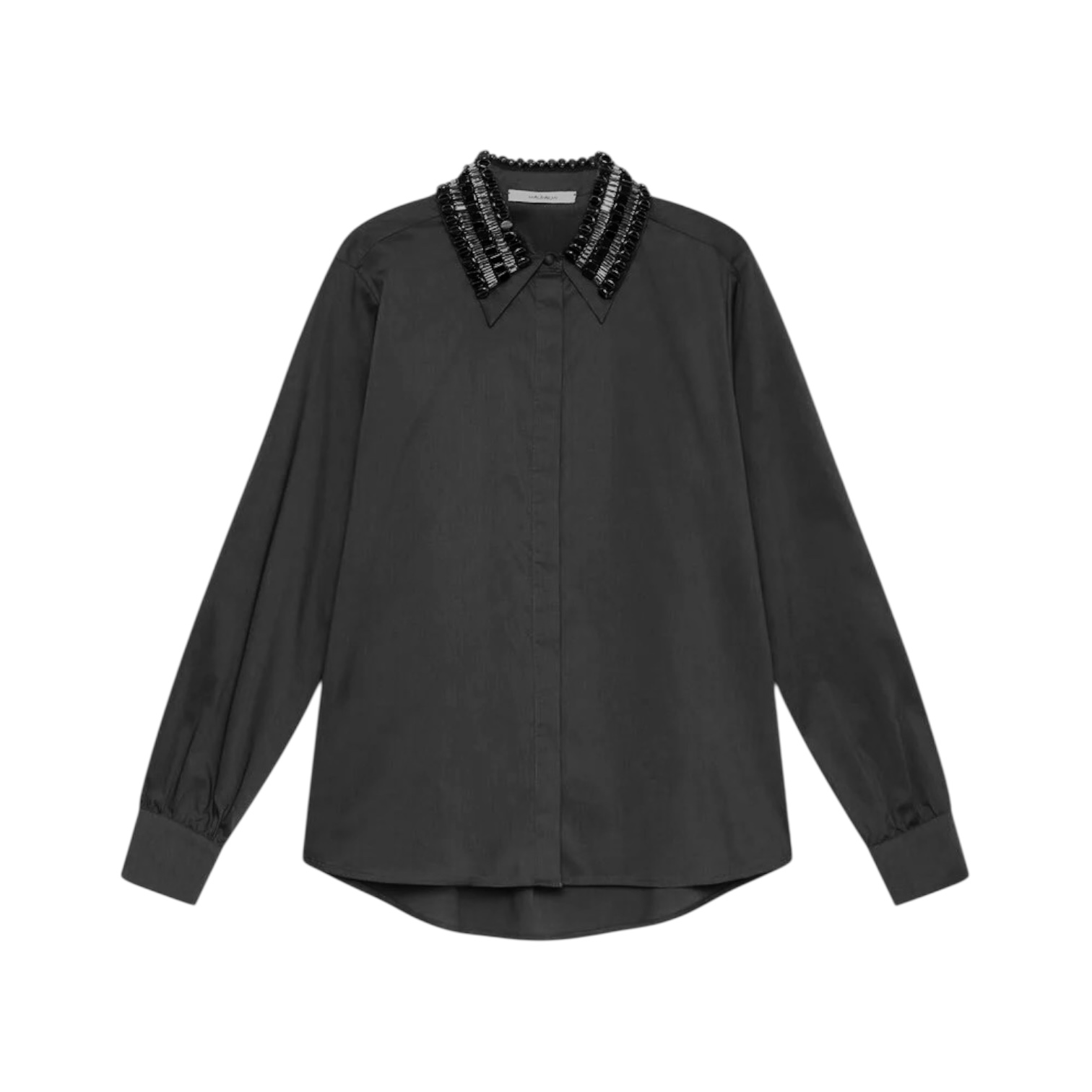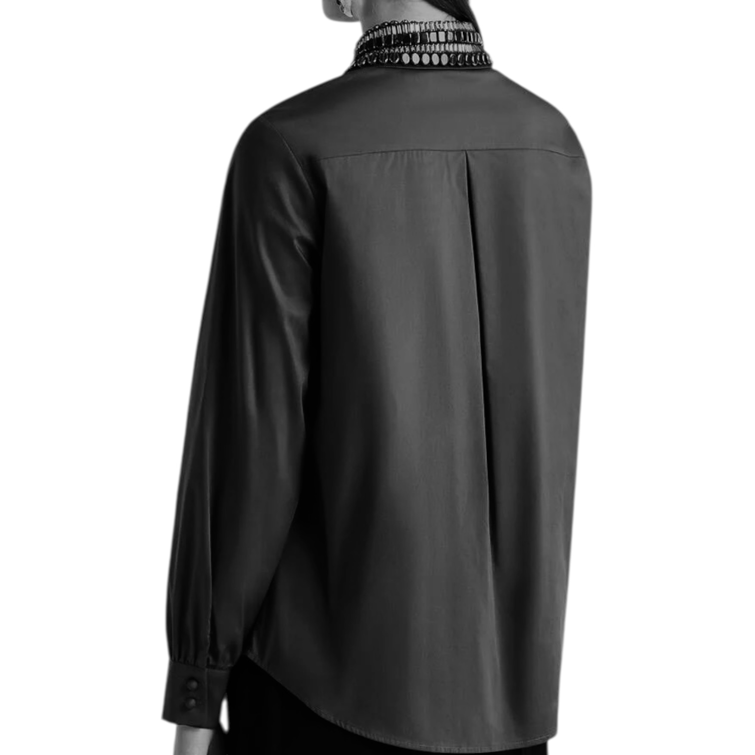 - Coupe droite, manches délicatement froncées au bas, cette chemise devient unique grâce au col entièrement brodé à la main de lignes horizontales de sequins et strass. Parfait équilibre entre essentialité et artisanat. Boutons recouverts et nacre complètent l’effet raffiné