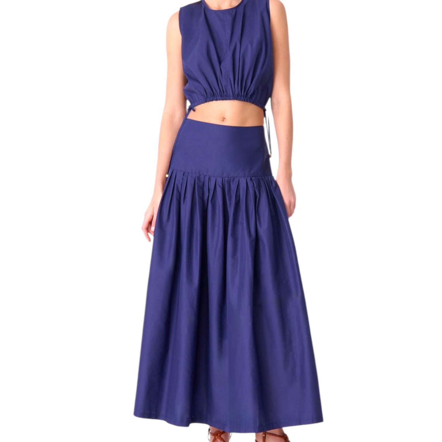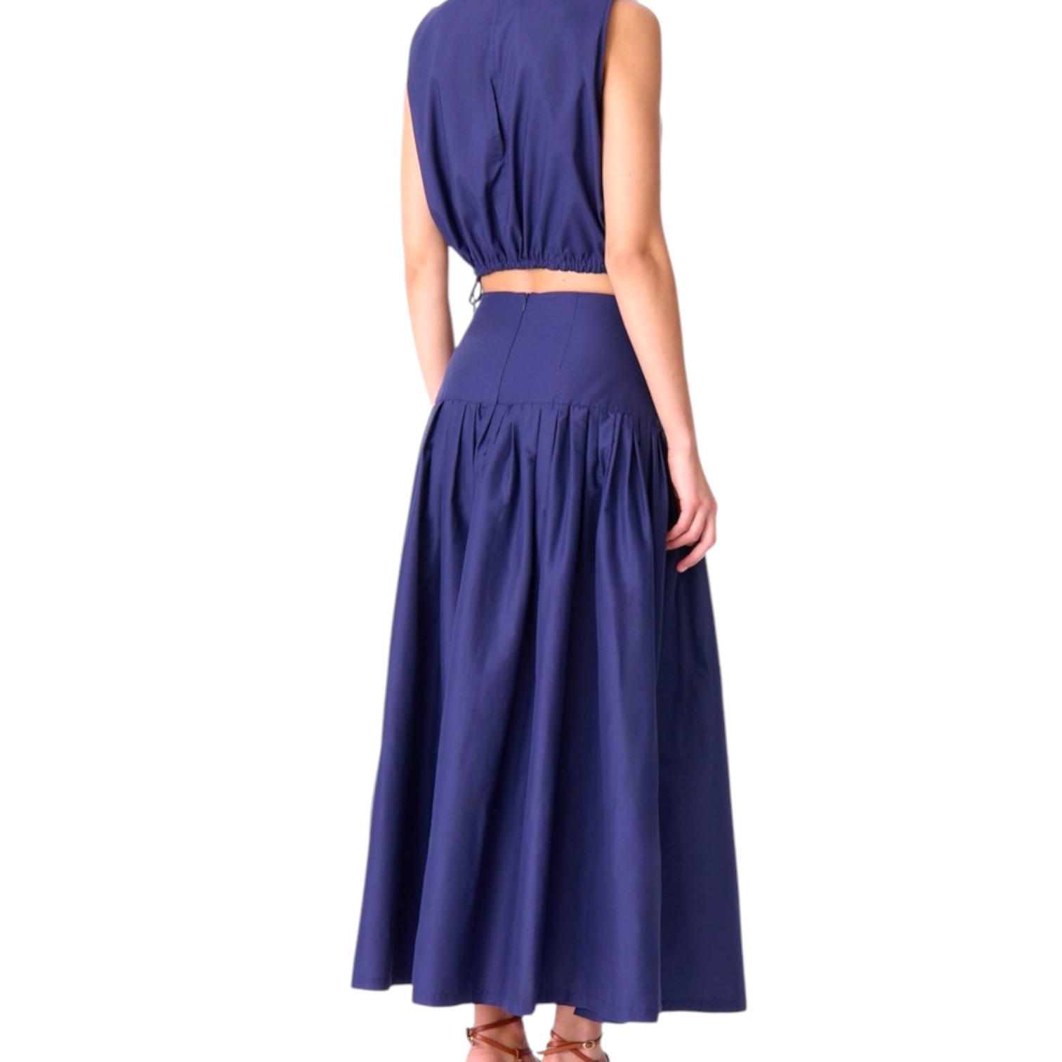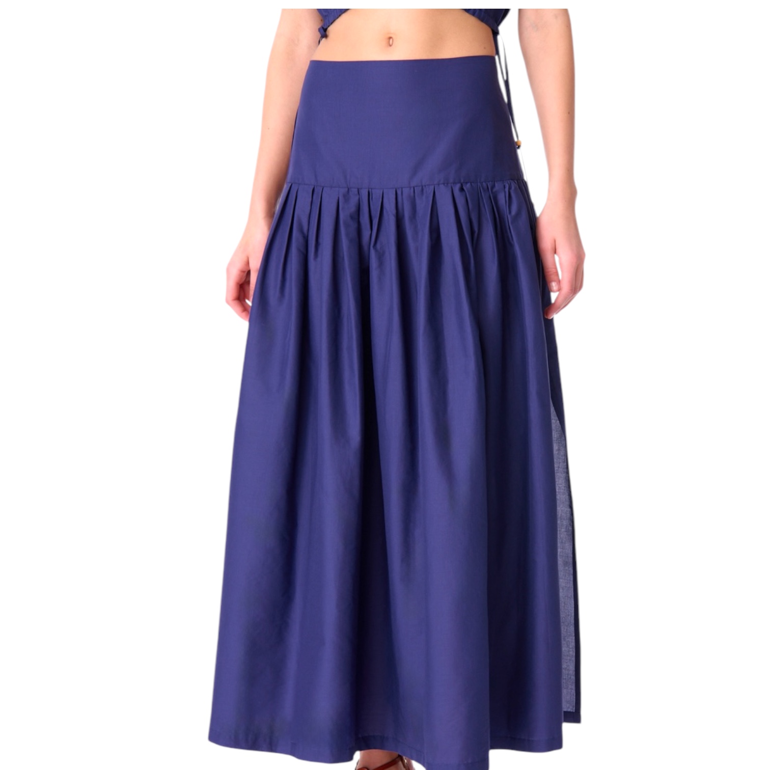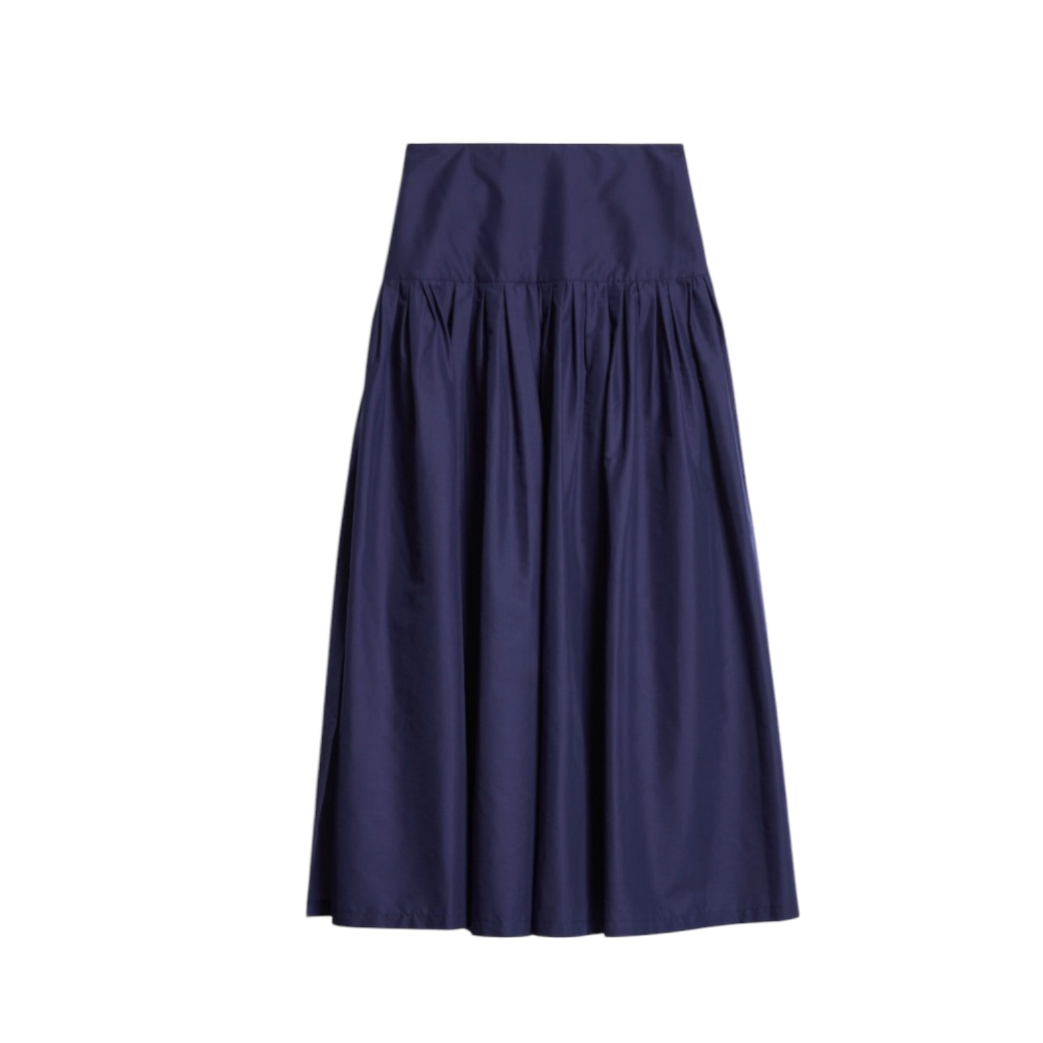 - Jupe longue, évasée, large bande de taille haute structuré, plis plats délicats sous la taille, fermeture zippée invisible sur le côté pour un ajustement discret, non doublée