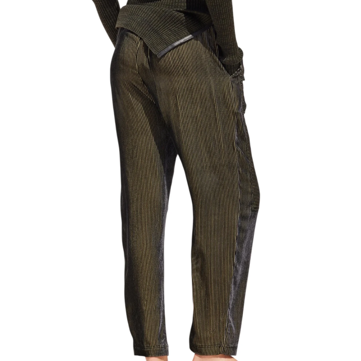 - Pantalon en velours de soie dévoré, travaillé dans un coloris bicolore vert et bleu aux reflets changeants