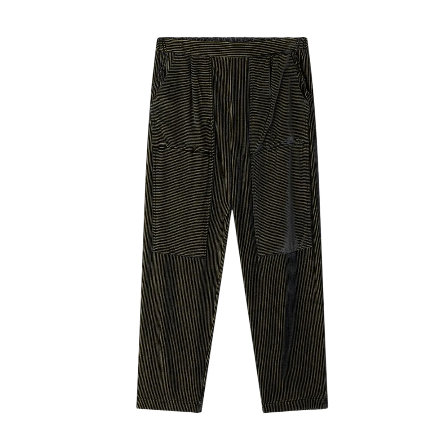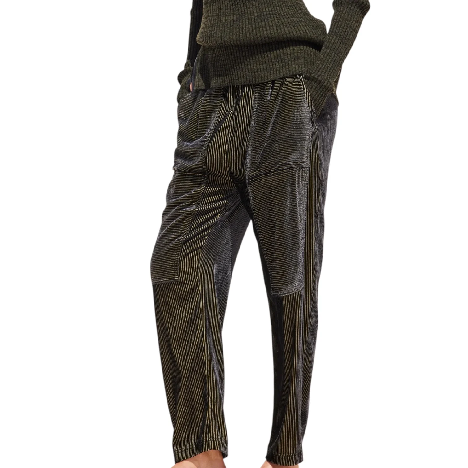 - Coupe souple, élastique à la taille, poches latérales