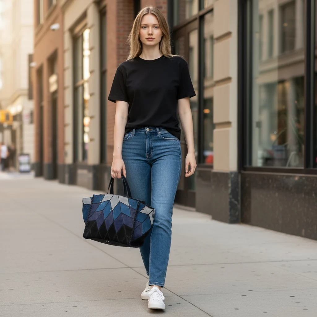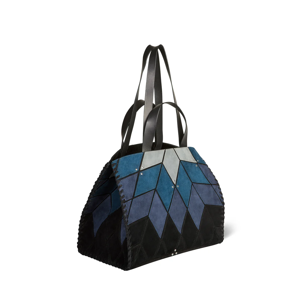 - Fermeture par des pattes en cuir pressionnées. Quatre poignées, de deux longueurs, en cuir sur le haut du sac