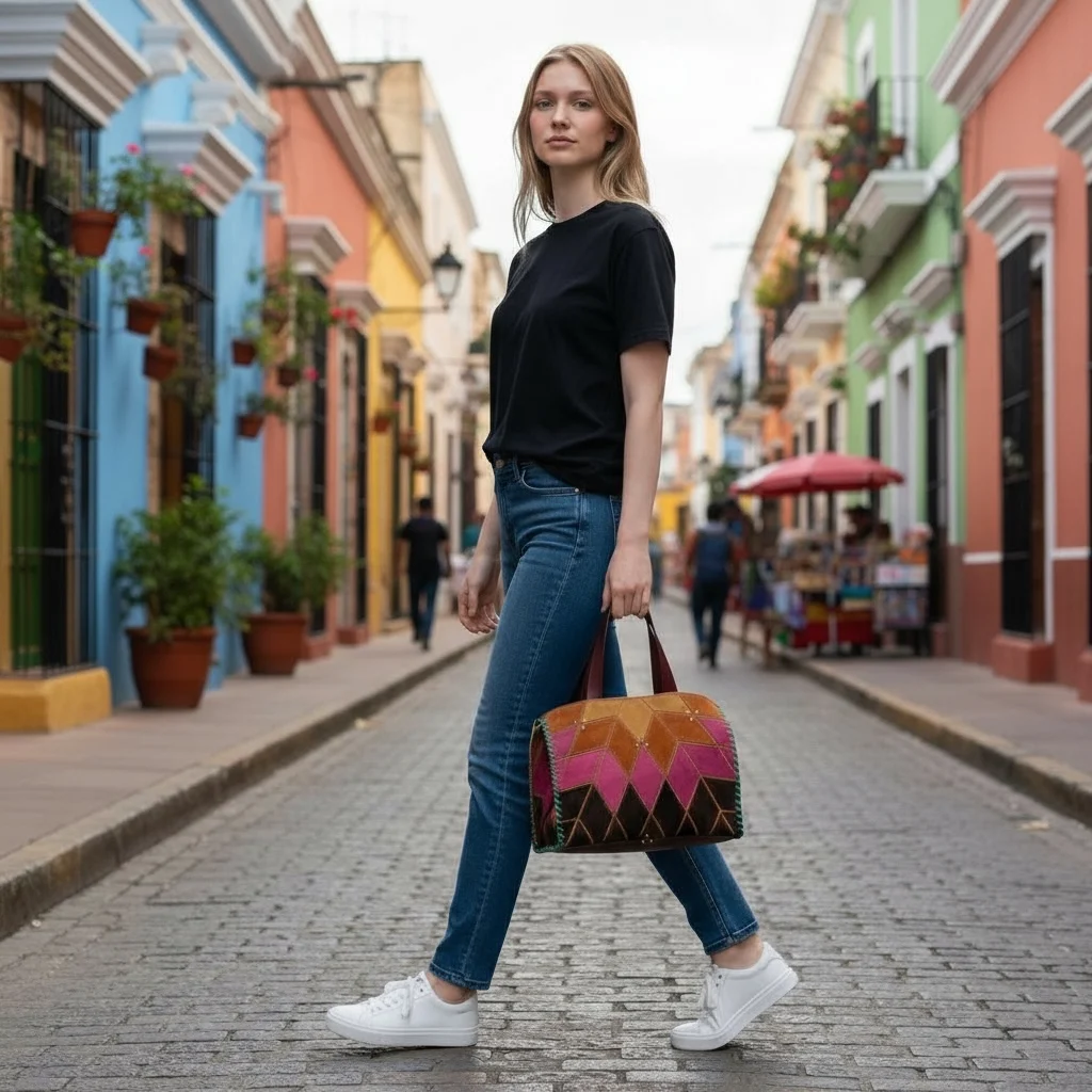 - Sac organisé avec un grand compartiment et une pochette en cuir accrochée par un lien à l’intérieur