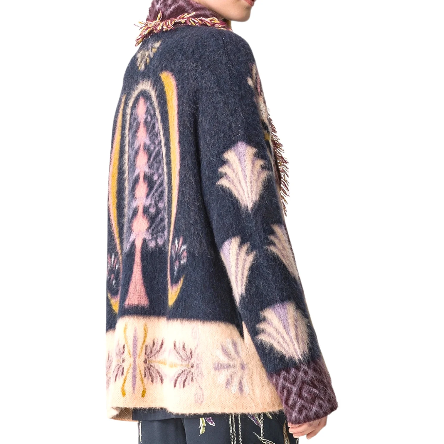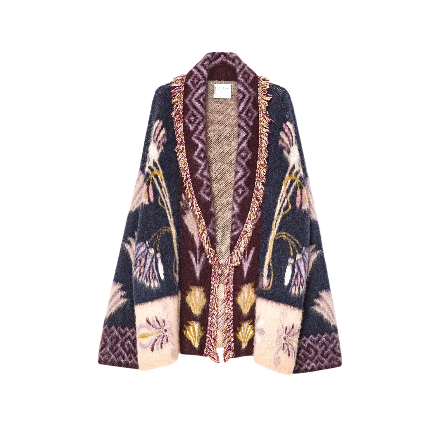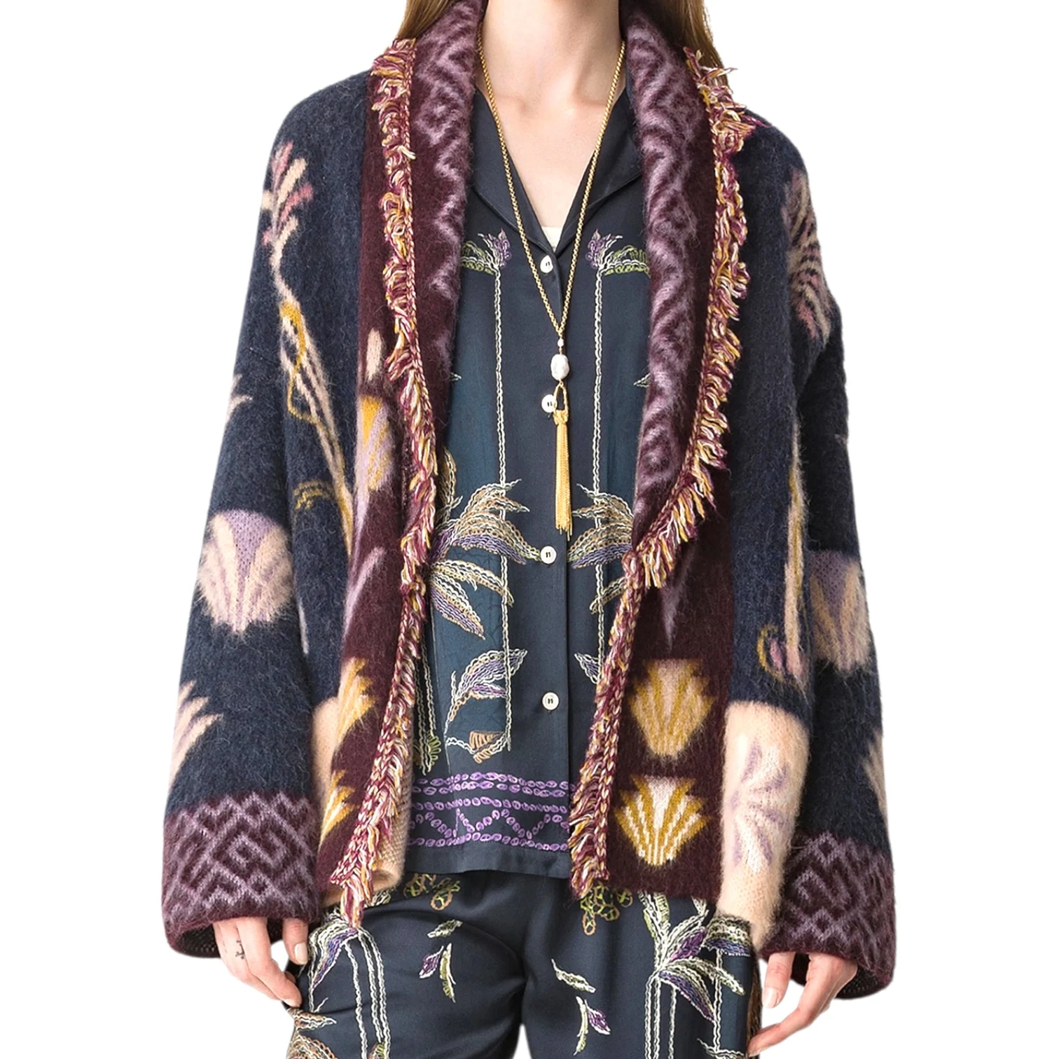 - Cardigan long en laine de bébé alpaga doux et compact, orné de dessins floraux à l’extérieur et de motifs graphiques bicolores à l’intérieur